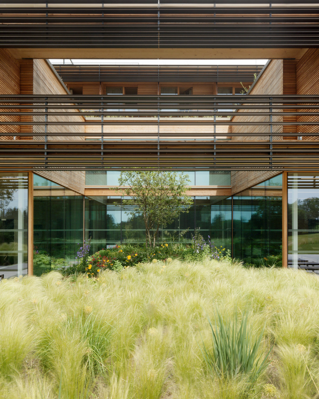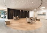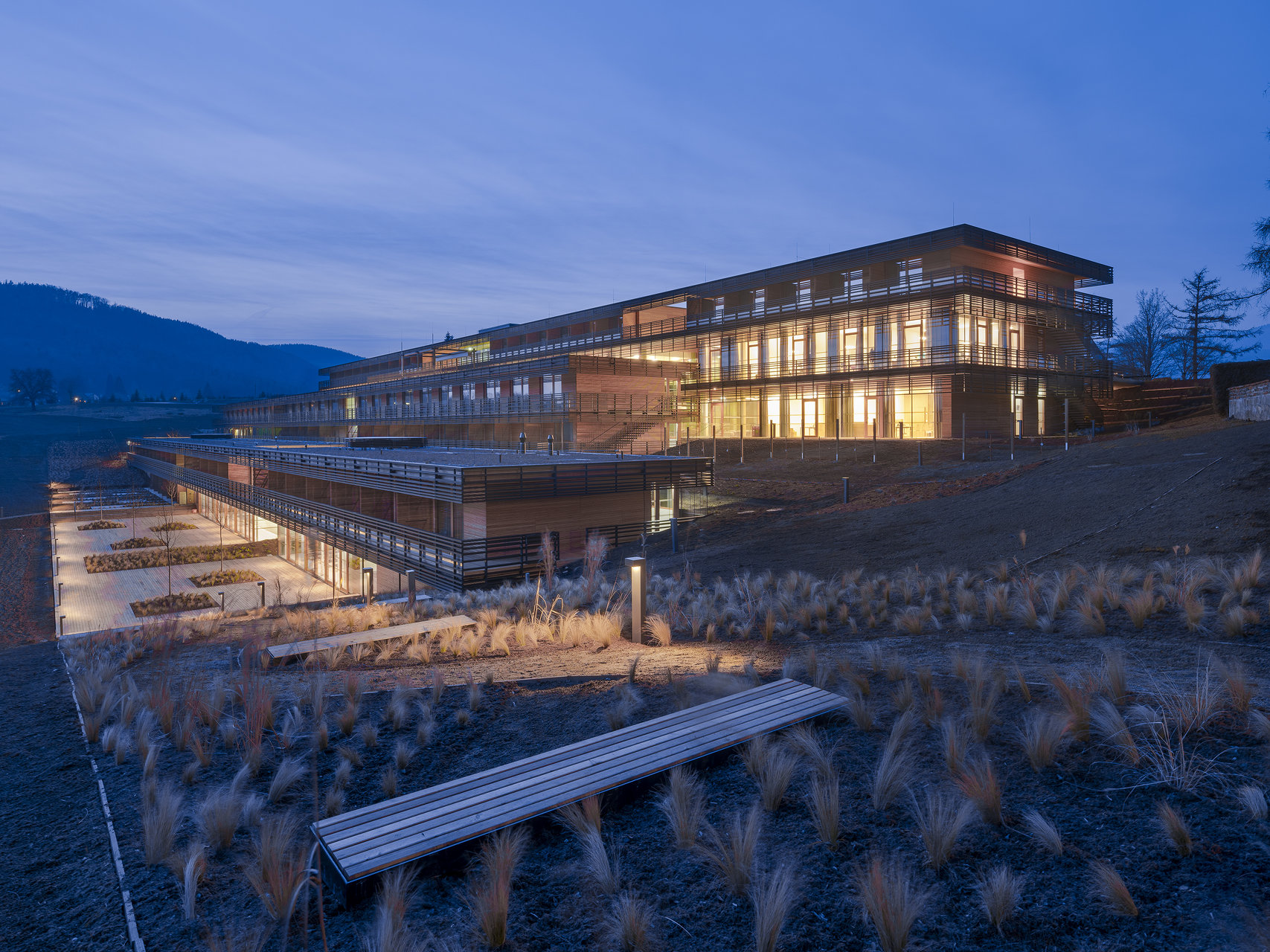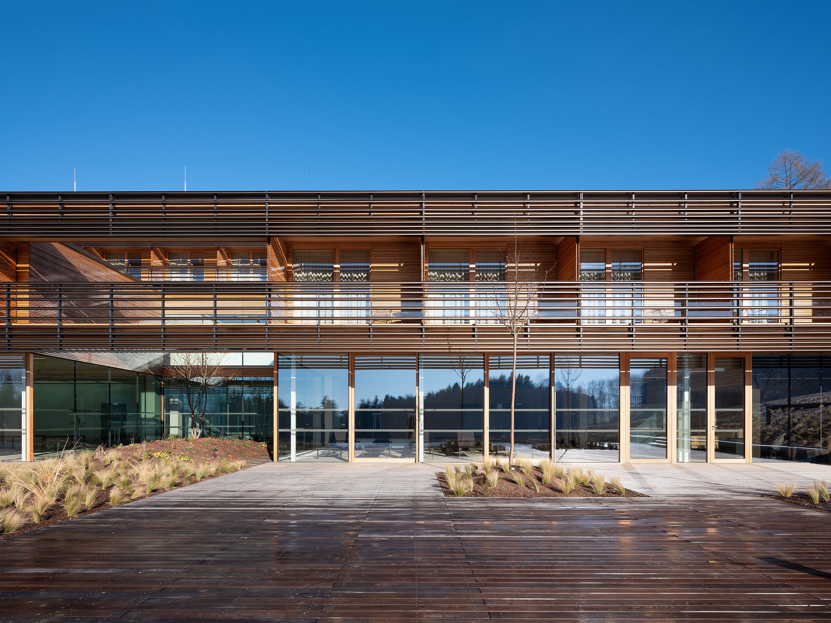 Ein wichtiges Gestaltungselement der Anlage sind fünf Atrien, die an strategischen Punkten in die Baukörper geschnitten sind. Diese Atrien dienen nicht zum Aufenthalt von Nutzern. Sie sind als kleine Landschaftsausschnitte angelegt, mit dichter Bepflanzung auf einem Miniaturhügel in der Mitte. Ihre Aufgabe ist es, gewissermaßen als Akkumulatoren von Achtsamkeit, die umliegenden Räume atmosphärisch zu beruhigen. Das mag seltsam klingen, passt aber sehr gut zur Aufgabe, der sich diese Gesundheitseinrichtung verschrieben hat. Hierher kommt man nämlich nicht, wenn man krank ist, sondern aus Gründen der Prophylaxe. Es geht um „stationäre Gesundheitsförderung“, bei der Versicherte eine Woche lang lernen, gesünder zu leben, vom Essen über die Bewegung bis zur Rauchentwöhnung. Deshalb gibt es hinter dem Speisesaal eine Lehrküche, in der die Gäste in die Welt abseits von Stelze und Schnitzel eingeführt werden. Die Gäste gehören zum größten Teil zur Altersgruppe jenseits der 50, wobei es eigene Angebote für die Zeit unmittelbar nach der Pensionierung gibt sowie für Pensionisten zwischen 65 und 75 Jahren. Die Kosten übernimmt die Versicherung, berufstätige Gäste müssen für die Zeit im „Josefhof“ ihren Urlaub konsumieren.