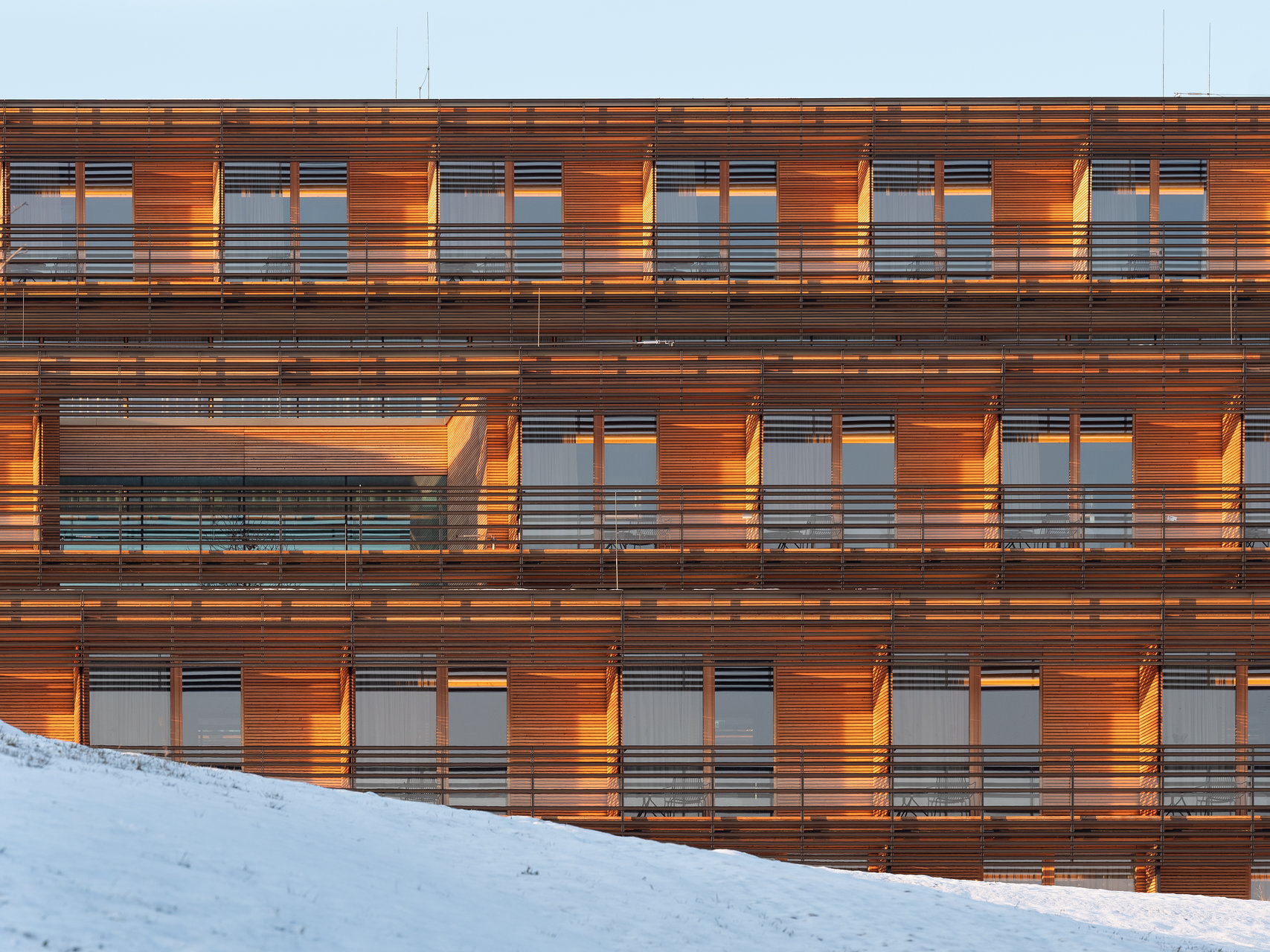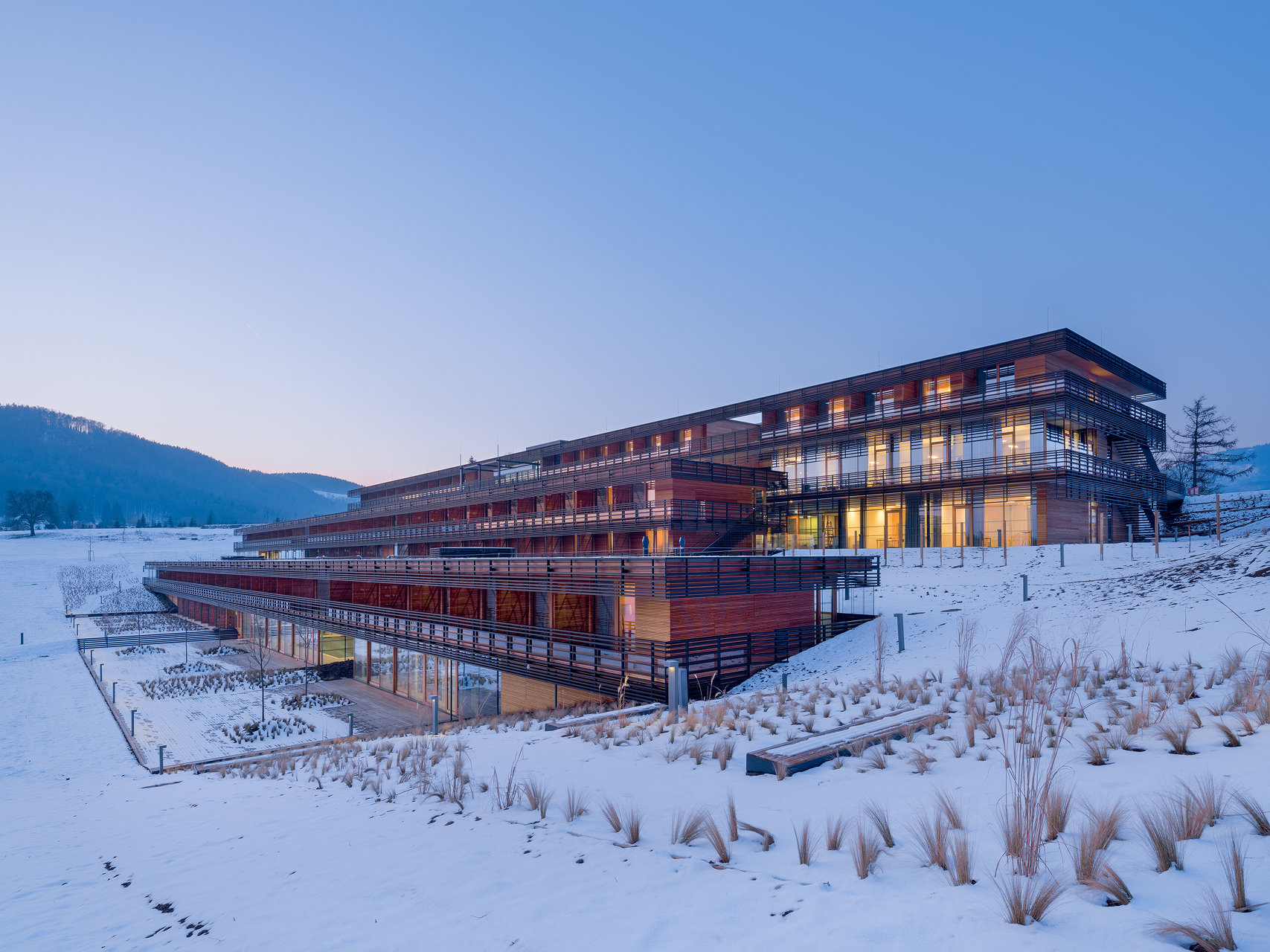 Um seinen ökologischen Fußabdruck zu reduzieren, ist das Haus zu einem überwiegenden Teil in Holz konstruiert, in einem Modulsystem der Firma Kaufmann Bausysteme, bei dem selbsttragende Boxen aus Brettsperrholz im Werk gefertigt und an der Baustelle montiert werden. Bis auf den Fernseher und die Vorhänge sind diese stapelbaren Einheiten inklusive der Sanitärbereiche fertig installiert. Serielle Fertigung kann leicht dazu führen, dass die Ergebnisse schematisch und barackenartig aussehen. Der „Josefhof“ ist der Beweis, dass es auch anders geht. Das liegt einerseits daran, dass nicht die gesamte Konstruktion aus präfabrizierten Boxen besteht. Die erdberührenden Bauteile im Hang sind aus Stahlbeton, was größere Stützweiten und unterschiedliche Raumhöhen erlaubt, wie sie für Gymnastik- und Speisesäle benötigt werden. Am spannendsten werden die Räume, wenn sich Konstruktionssysteme überlagern, etwa dort, wo das große Schwimmbecken im untersten Geschoß von einem raumhohen Träger überspannt wird, der die Hotelboxen trägt, aber zugleich ein Oberlicht ermöglicht, durch das Licht von oben auf das Becken fällt. Ein besonders raffiniertes Detail mit einem eigenen Rhythmus sind die Balkonbrüstungen, die aus horizontalen Aluminium-Lamellen gebildet werden und die Beschattung übernehmen: Ihre Breite verhindert direkte Sonneneinstrahlung im Sommer und erlaubt sie im Winter. Auf eine Klimatisierung der Zimmer konnte so verzichtet werden. Allerdings brauchen die Lamellen, um als Absturzsicherung zugelassen zu werden, eine Ergänzung: Damit Kinder die Brüstungen nicht mit einer Leiter zum Hochklettern verwechseln, sind diese zusätzlich mit Glasplatten abgedeckt – was zu einem weiteren Detail führt, einem Mechanismus, mit dem die Gläser zur Reinigung heruntergeklappt werden können. Auch das gehört zu guter Architektur.
