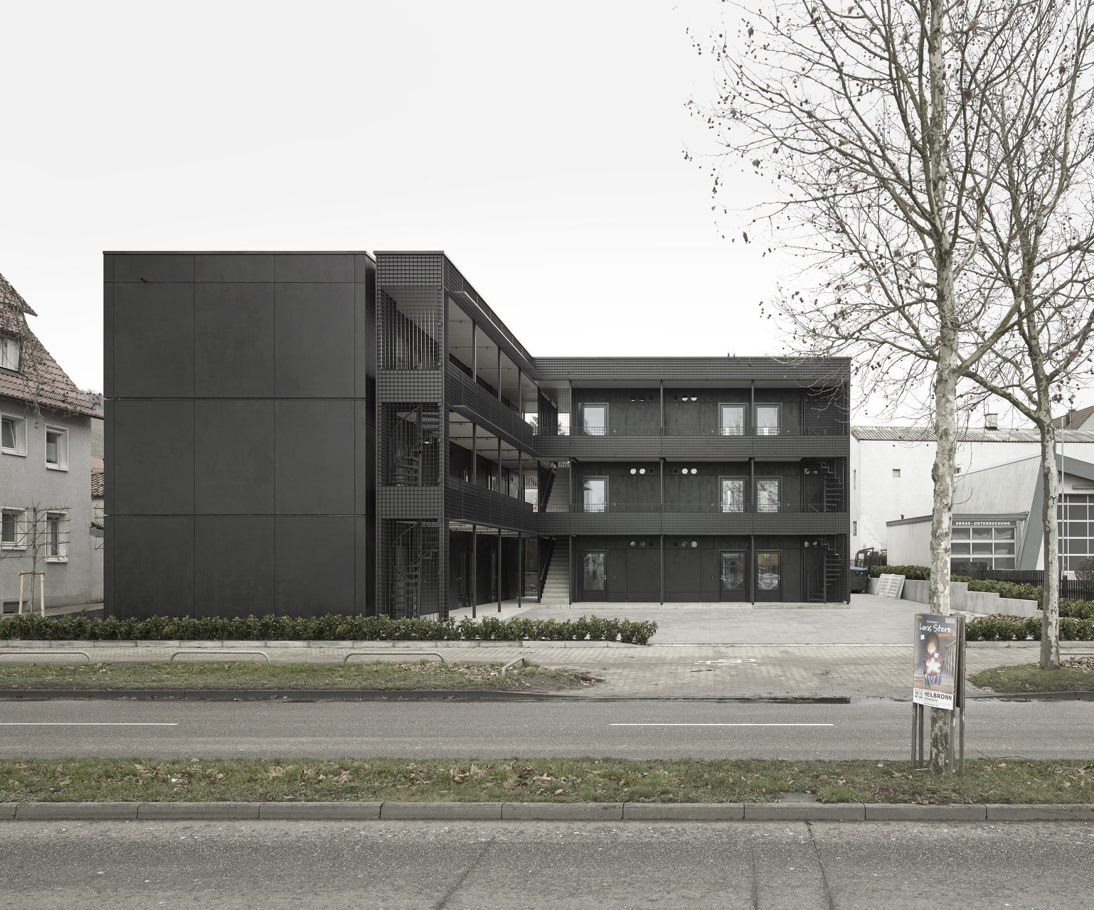 Die L-Form des Baukörpers ist einer Bauverbotszone im heutigen Hof des Gebäudes geschuldet. Auf drei Geschoßen verteilen sich die kompakten Wohneinheiten, zwanzig mit 17,5 m² und drei Doppelmodule mit 35 m² Wohnfläche. Der vorgelagerte Laubengang dient zum einen als Pufferzone zur Straße und Beschattung, zum anderen bietet dieser Bereich mit Süd-West-Orientierung eine Erweiterung des Wohnraums.