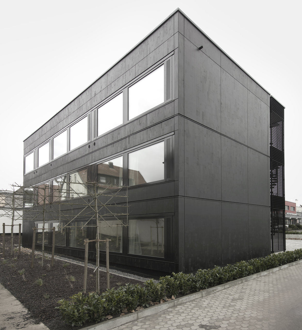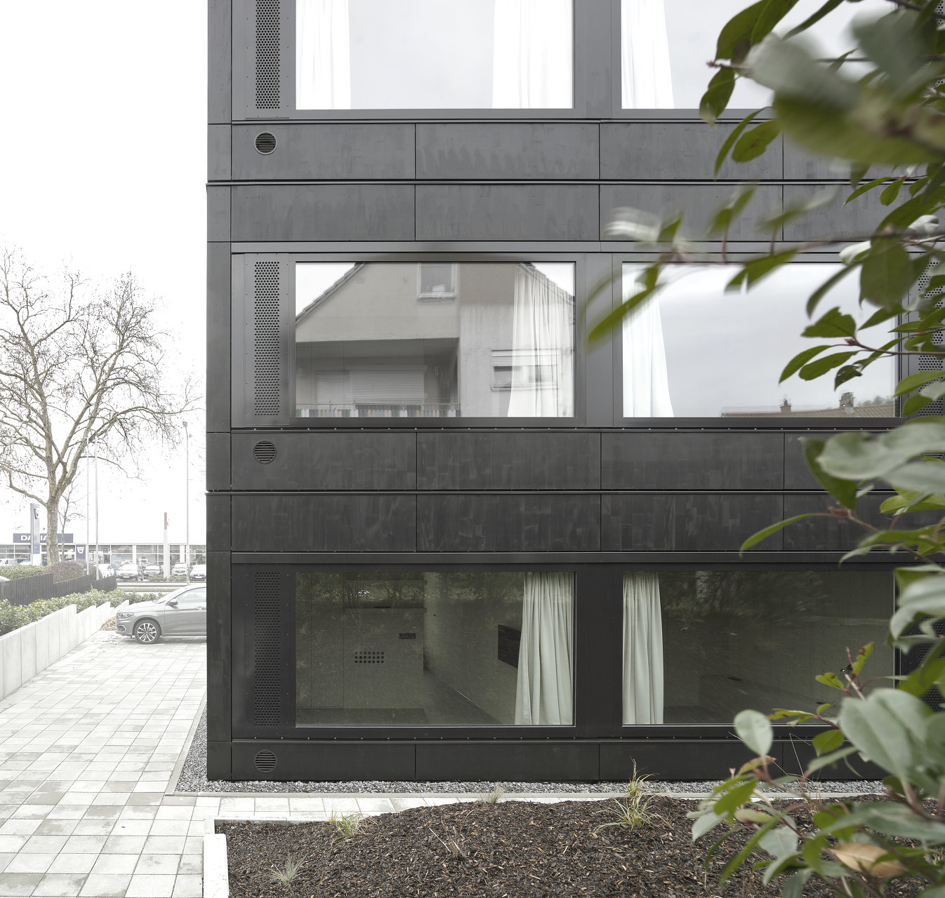 Die Fassade besteht aus großformatigen, dunkel lasierten 3-Schicht-Platten. Am Laubengang schaffen Stahl-Vollroste eine stabile Absturzsicherung und lassen reichlich Tageslicht ein. Das Energiekonzept ist auf weitgehende Selbstversorgung mit erneuerbaren Energien ausgerichtet: Eine Photovoltaikanlage erzeugt Strom und speichert ihn in der Hausbatterie. Fußbodenheizung, eine dezentrale kontrollierte Wohnraumlüftung mit Wärmerückgewinnung und die guten bauphysikalischen Werte der Holzkonstruktion lassen den KFW-55-Standard problemlos erreicht werden. (Text: Architekt, bearbeitet)