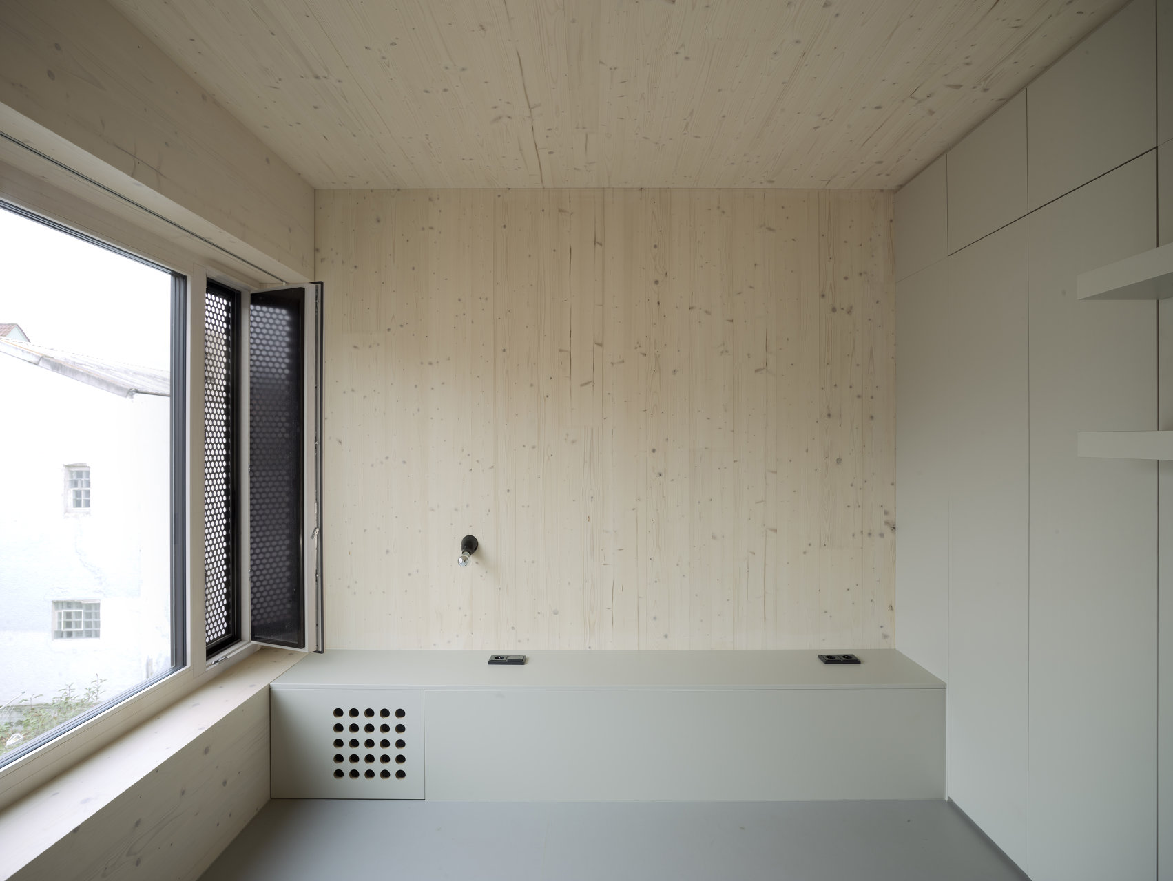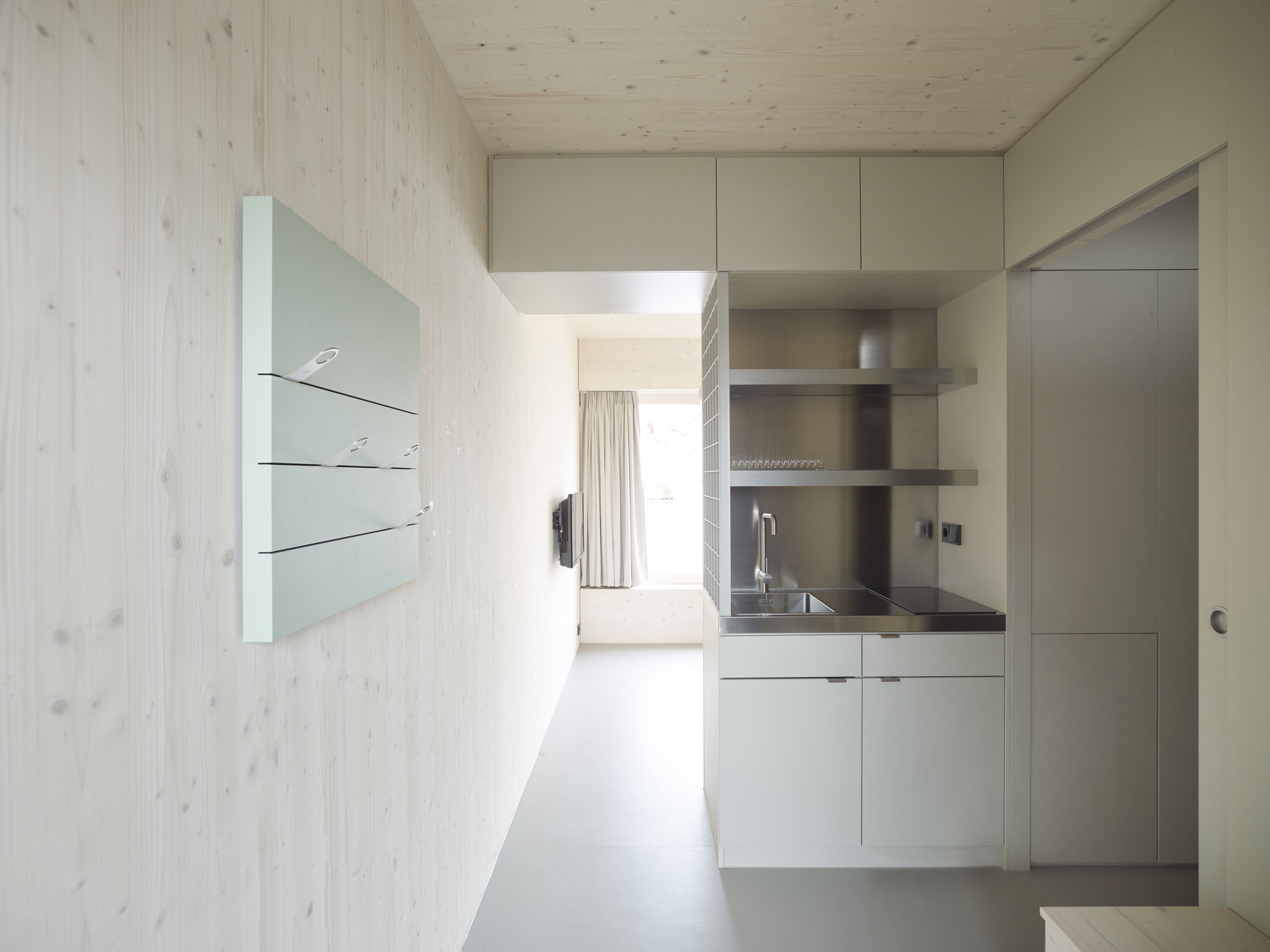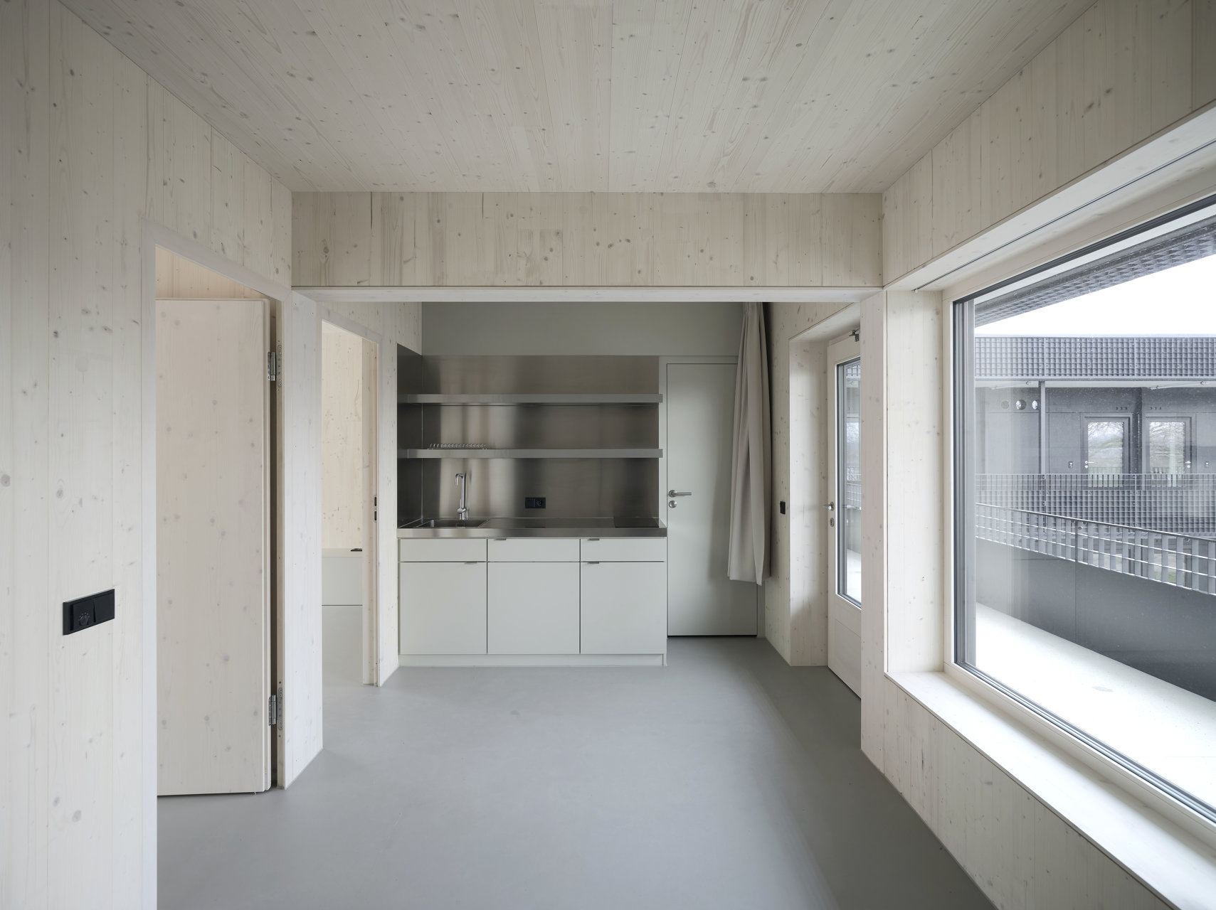 Für das flächeneffiziente und ökologische Bauen ist die Holzmodulbauweise ideal: Hoher Vorfertigungsgrad, optimierte Lösungen, Wirtschaftlichkeit. Zudem schafft das sichtbare Konstruktionsholz im Inneren eine klimatisch wie wohnlich angenehme Atmosphäre. Weitere Materialien sind unempfindliche Schichtstoffoberflächen, Linoleumboden und Edelstahl. Raumtrennende Einbauten gliedern die Einheiten. Die Fenster sind fassadenbündig eingebaut, dadurch entstehen Sitz- und Ablageflächen. Durch Koppelung zweier Holzmodule entsteht eine 35 m²-Einheit mit zwei Zimmern.