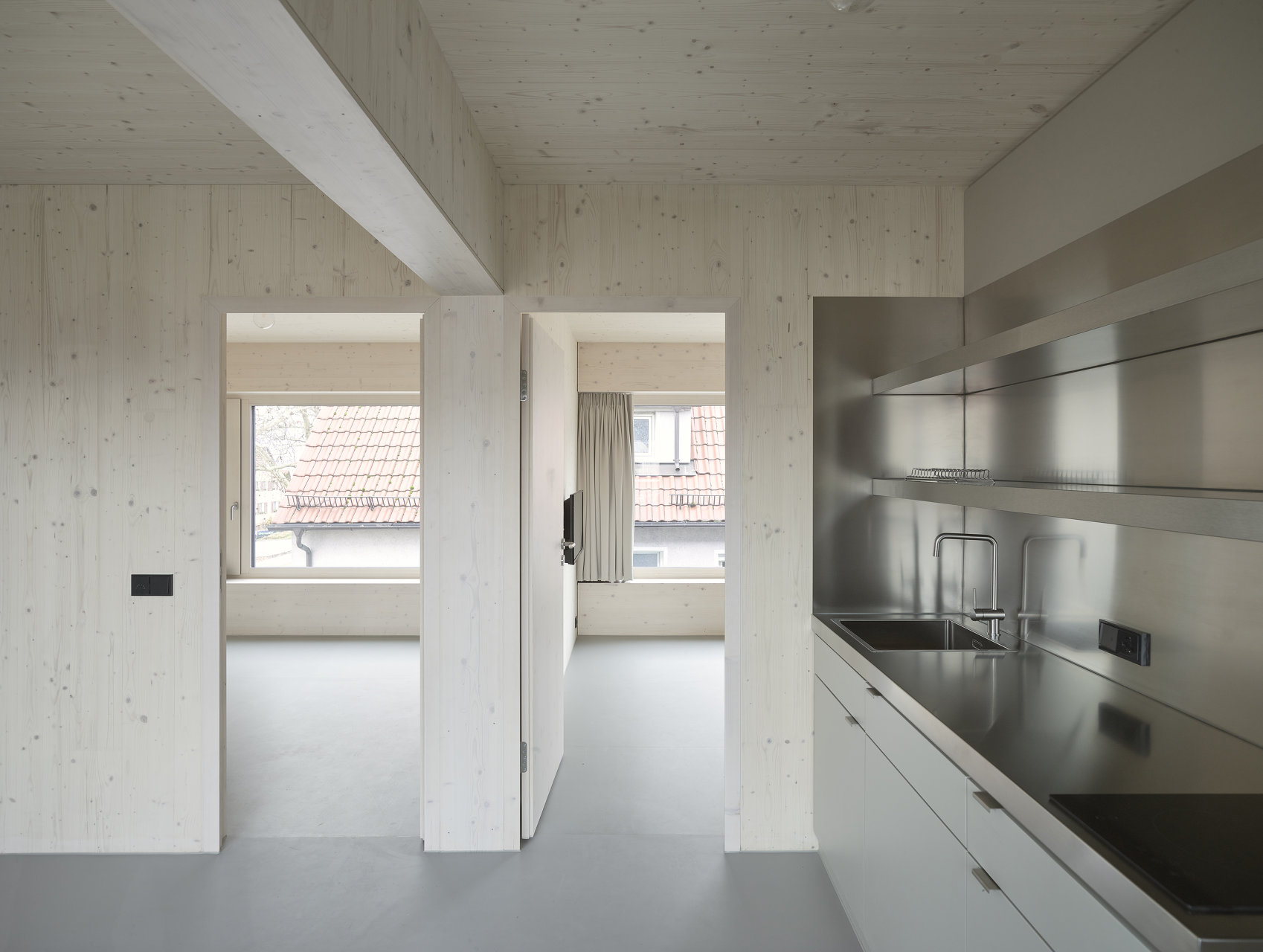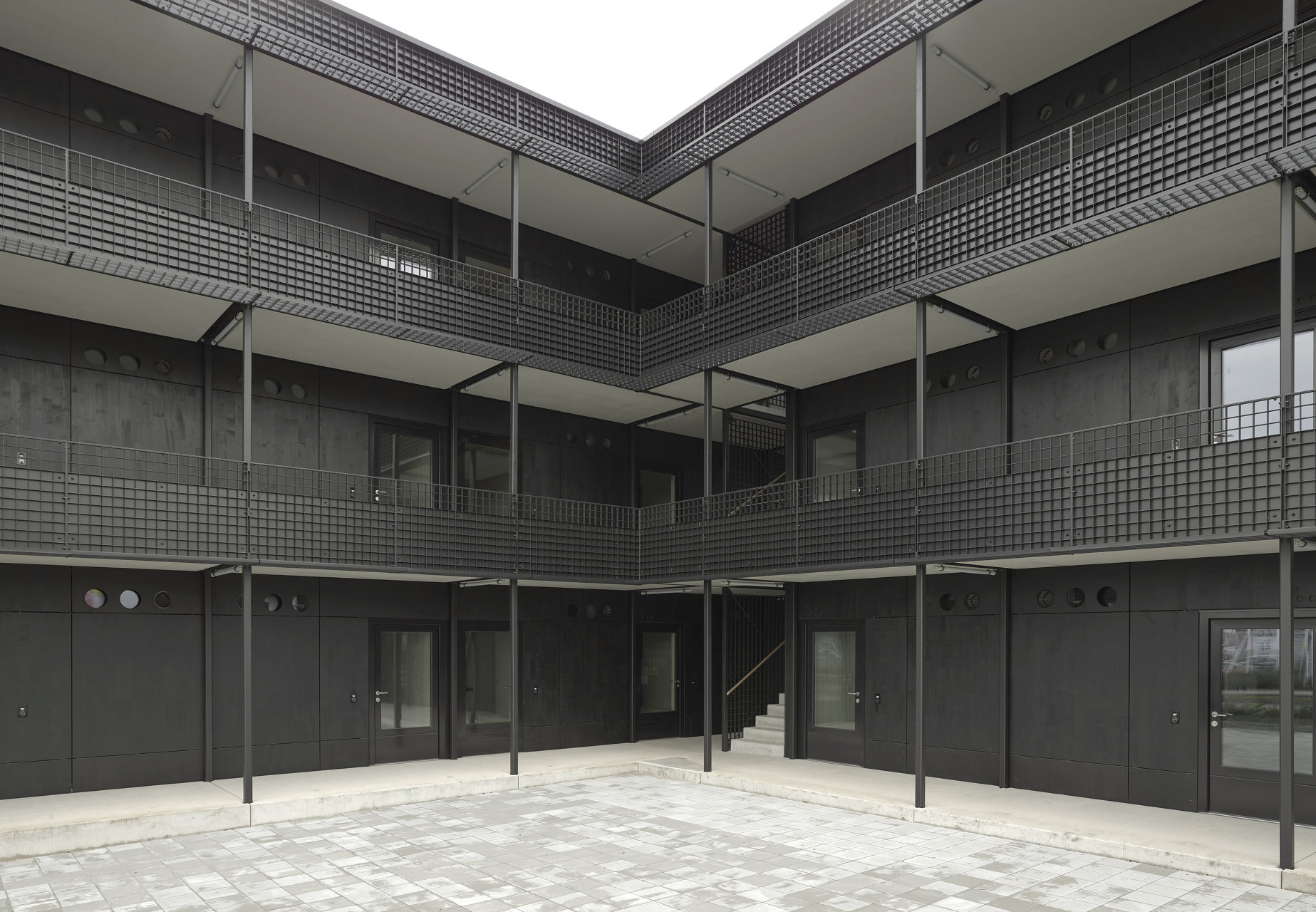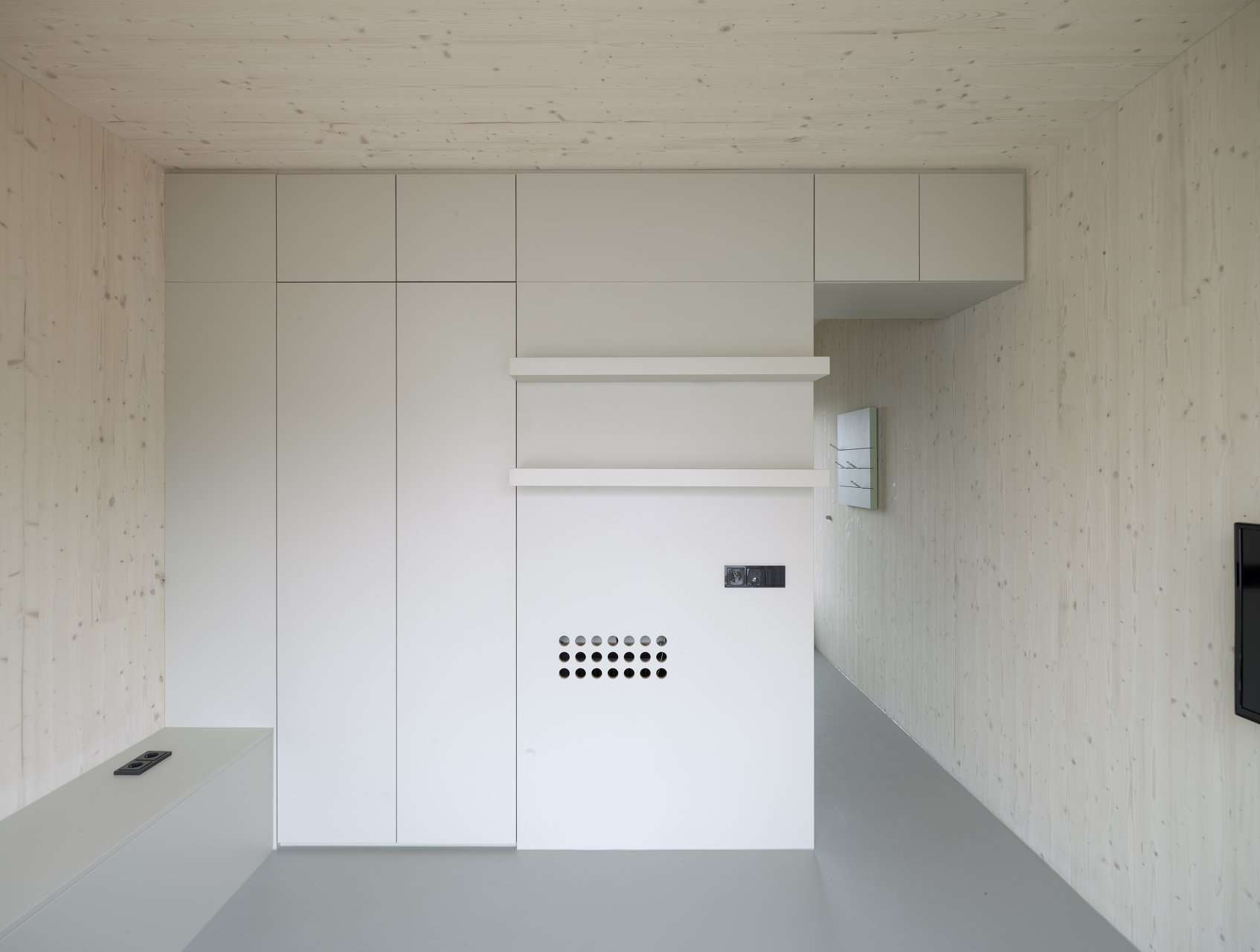 Für das flächeneffiziente und ökologische Bauen ist die Holzmodulbauweise ideal: Hoher Vorfertigungsgrad, optimierte Lösungen, Wirtschaftlichkeit. Zudem schafft das sichtbare Konstruktionsholz im Inneren eine klimatisch wie wohnlich angenehme Atmosphäre. Weitere Materialien sind unempfindliche Schichtstoffoberflächen, Linoleumboden und Edelstahl. Raumtrennende Einbauten gliedern die Einheiten. Die Fenster sind fassadenbündig eingebaut, dadurch entstehen Sitz- und Ablageflächen. Durch Koppelung zweier Holzmodule entsteht eine 35 m²-Einheit mit zwei Zimmern.