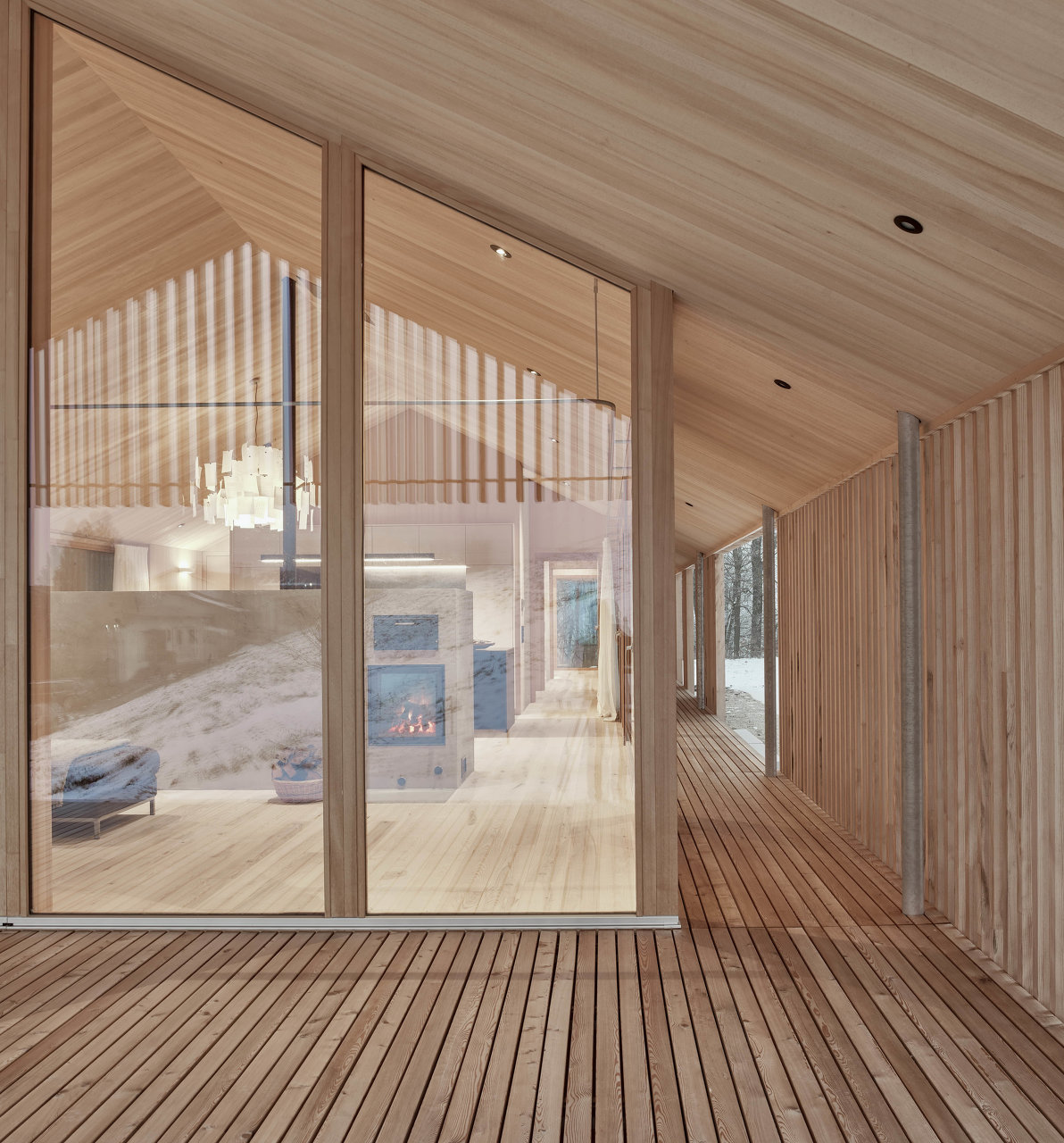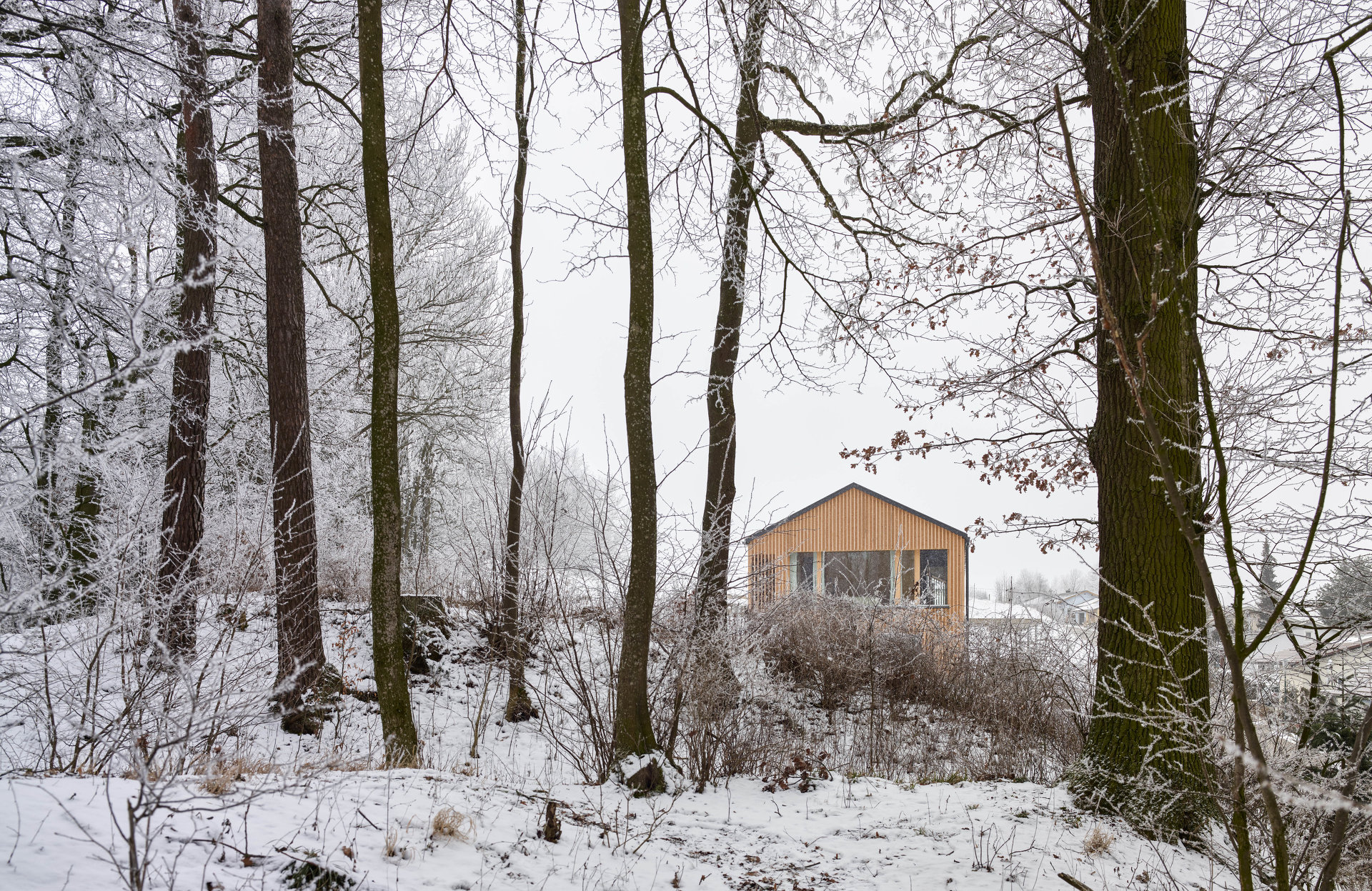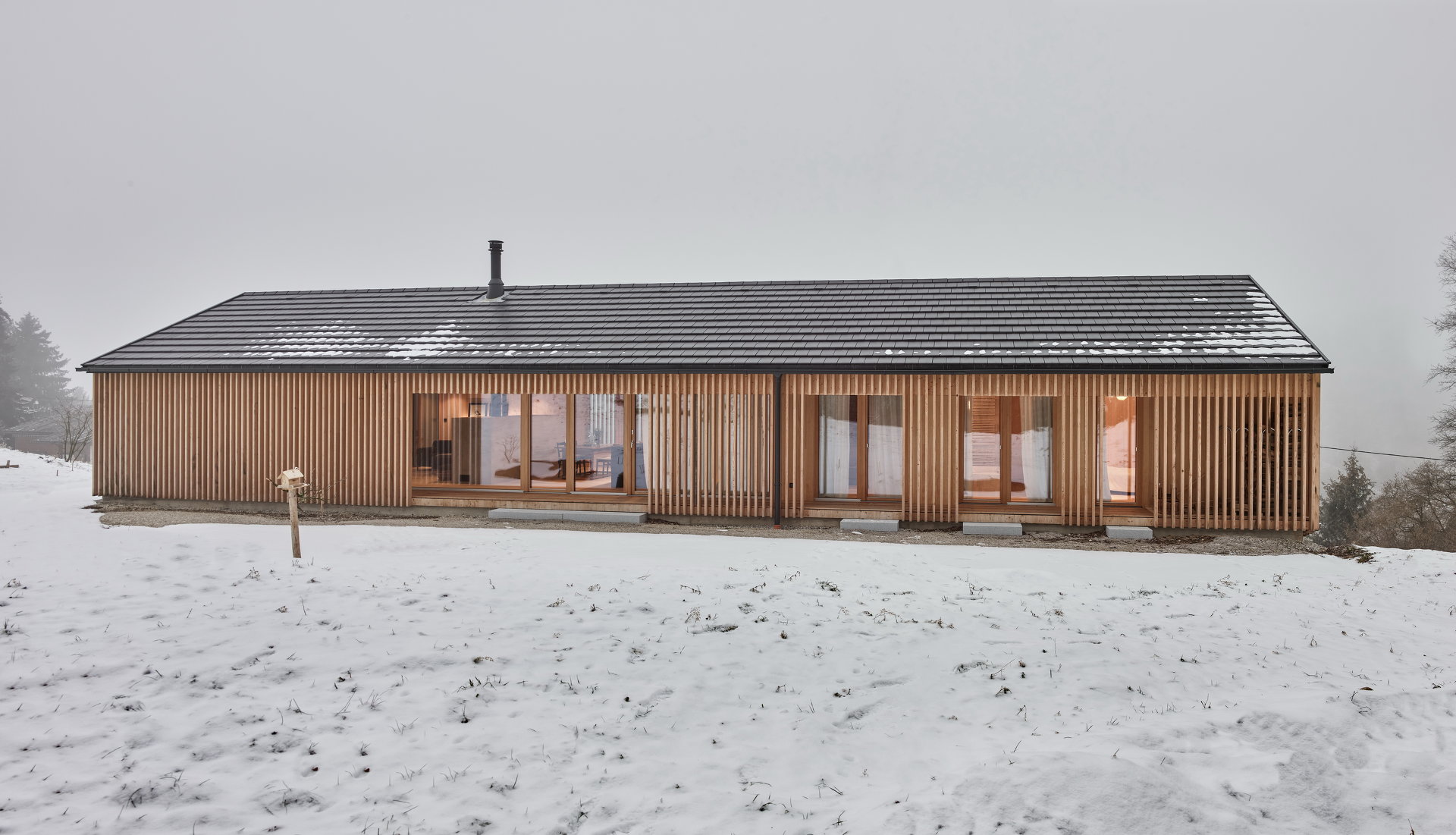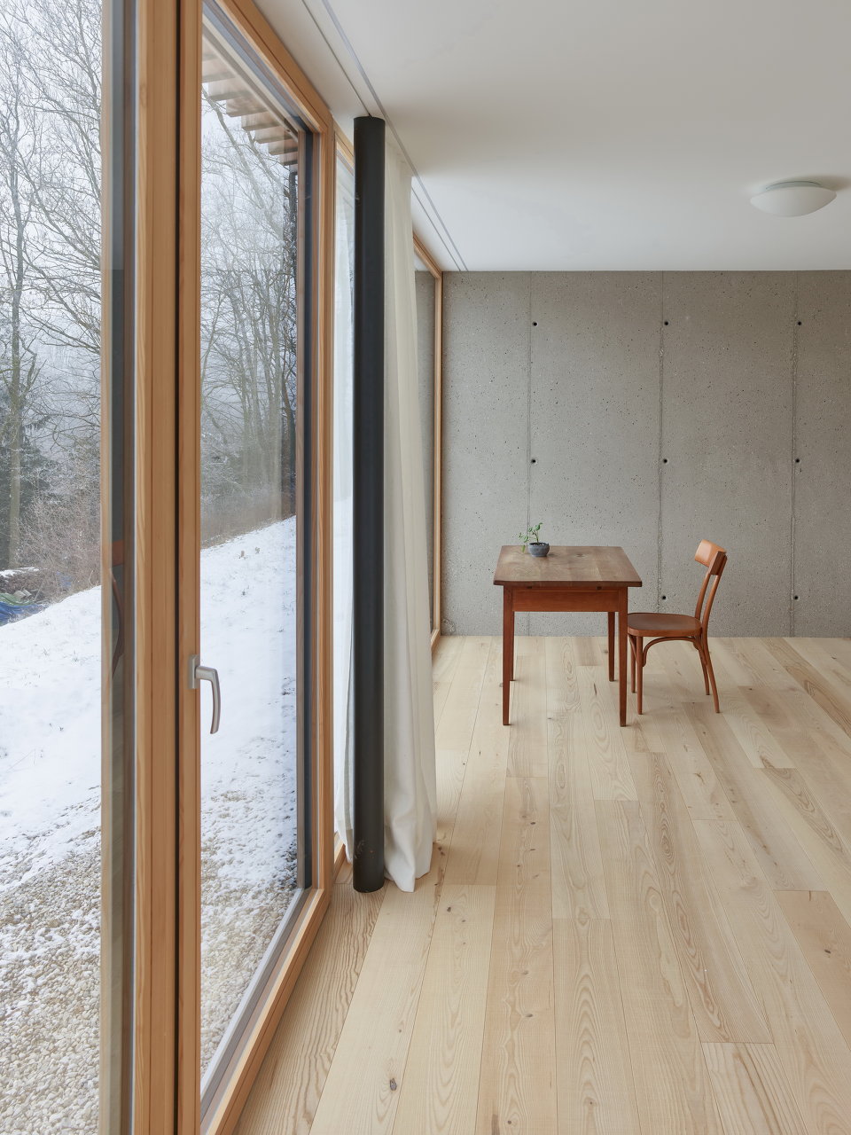 Dezent steht das Haus am Hang und bildet den Übergang der Siedlung zum Wald. Ein einfaches, in sich ruhendes Langhaus mit umlaufenden Wegen und fließenden Räumen. Wie ein Schleier umhüllt die leichte Holzverschalung Eingang und Terrasse und verleiht dem Volumen Atmosphäre und Leichtigkeit. Die durchdringenden Strahlen werden leicht gebrochen, das so entstehende Zusammenspiel aus Licht, Schimmer und Reflexen lässt eine verträumte, poetische Stimmung aufkommen. (Vorarlberger Holzbaupreis 2019 - Begründung der Jury)
