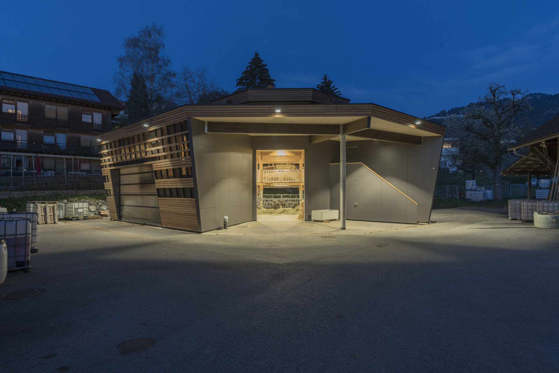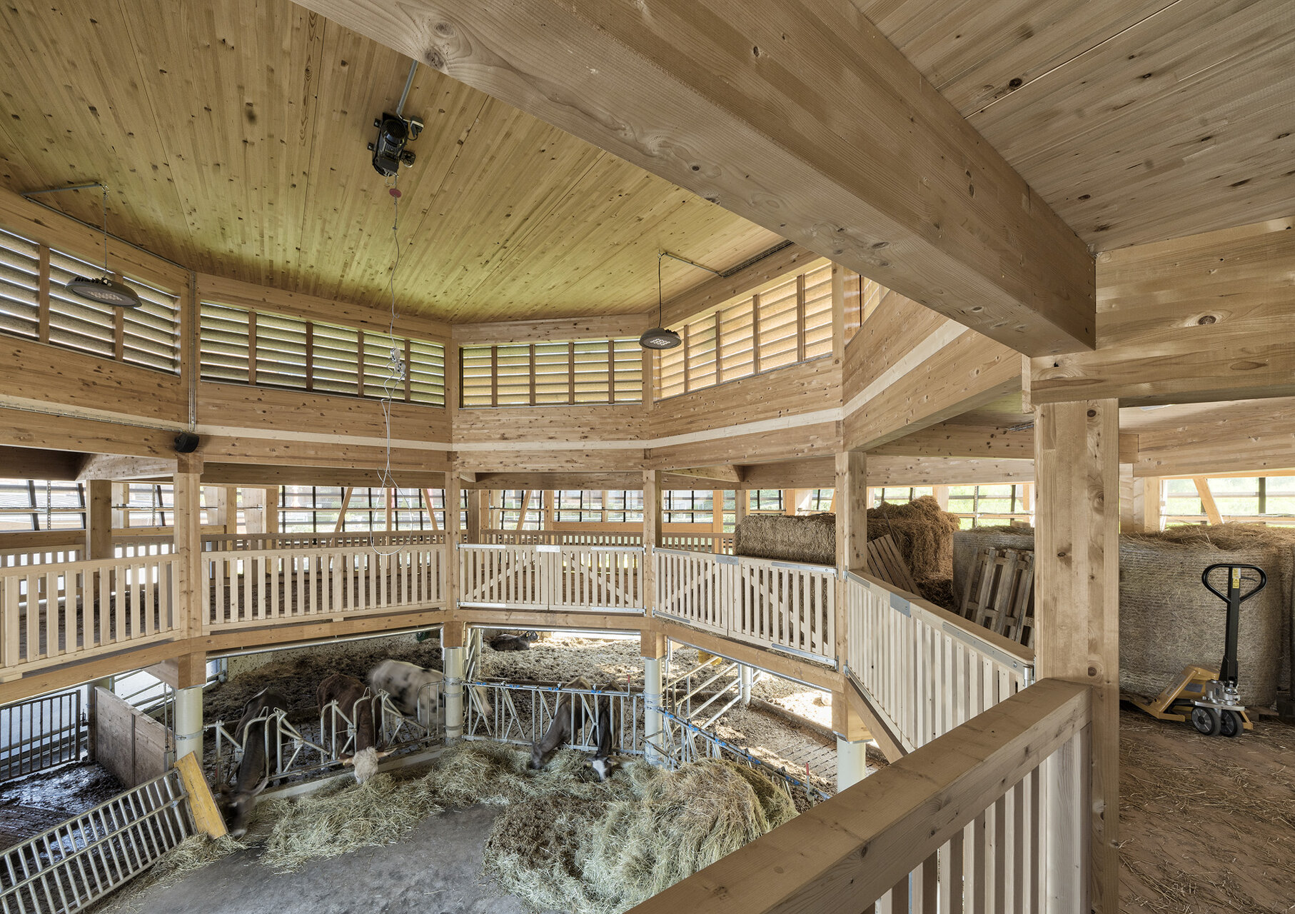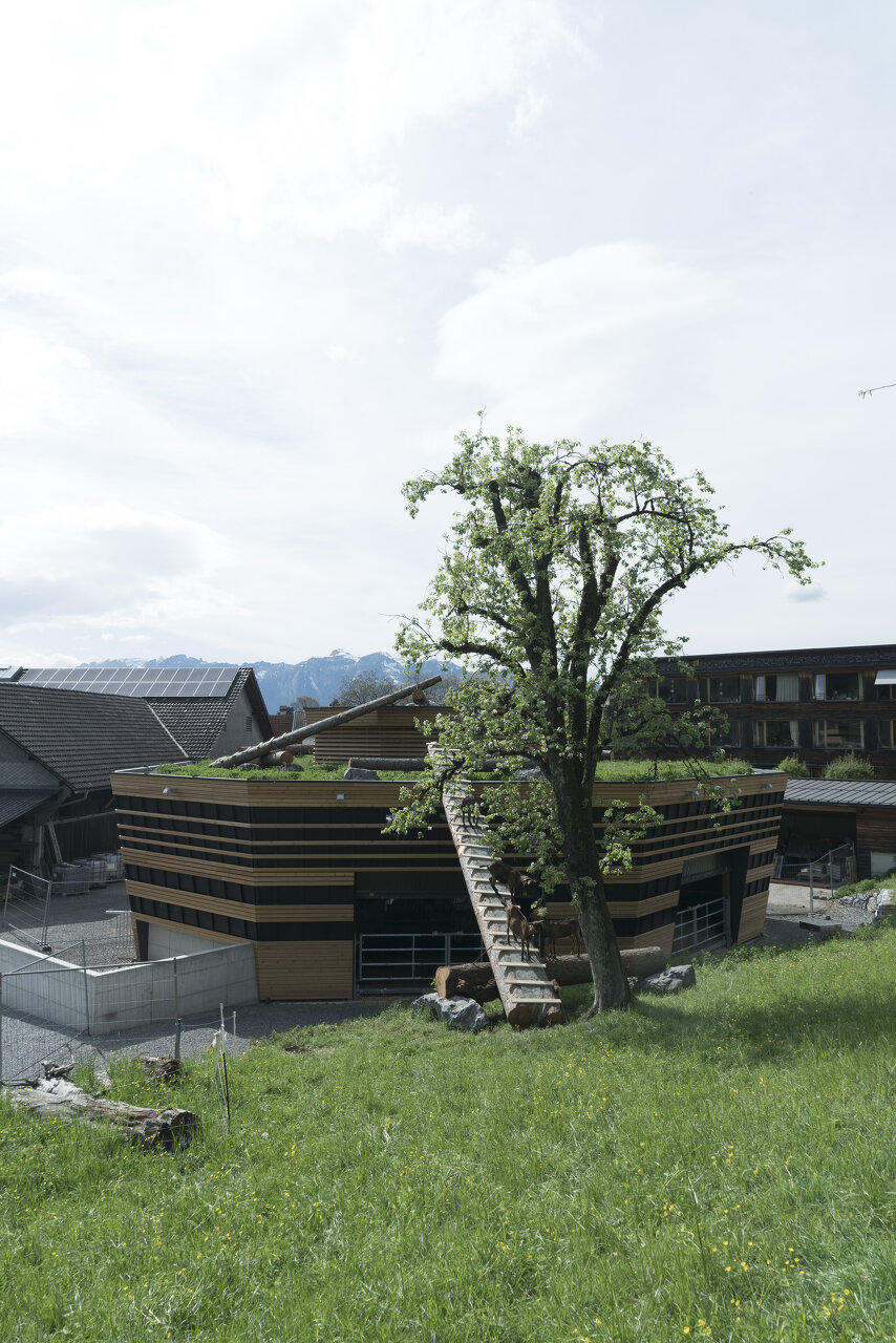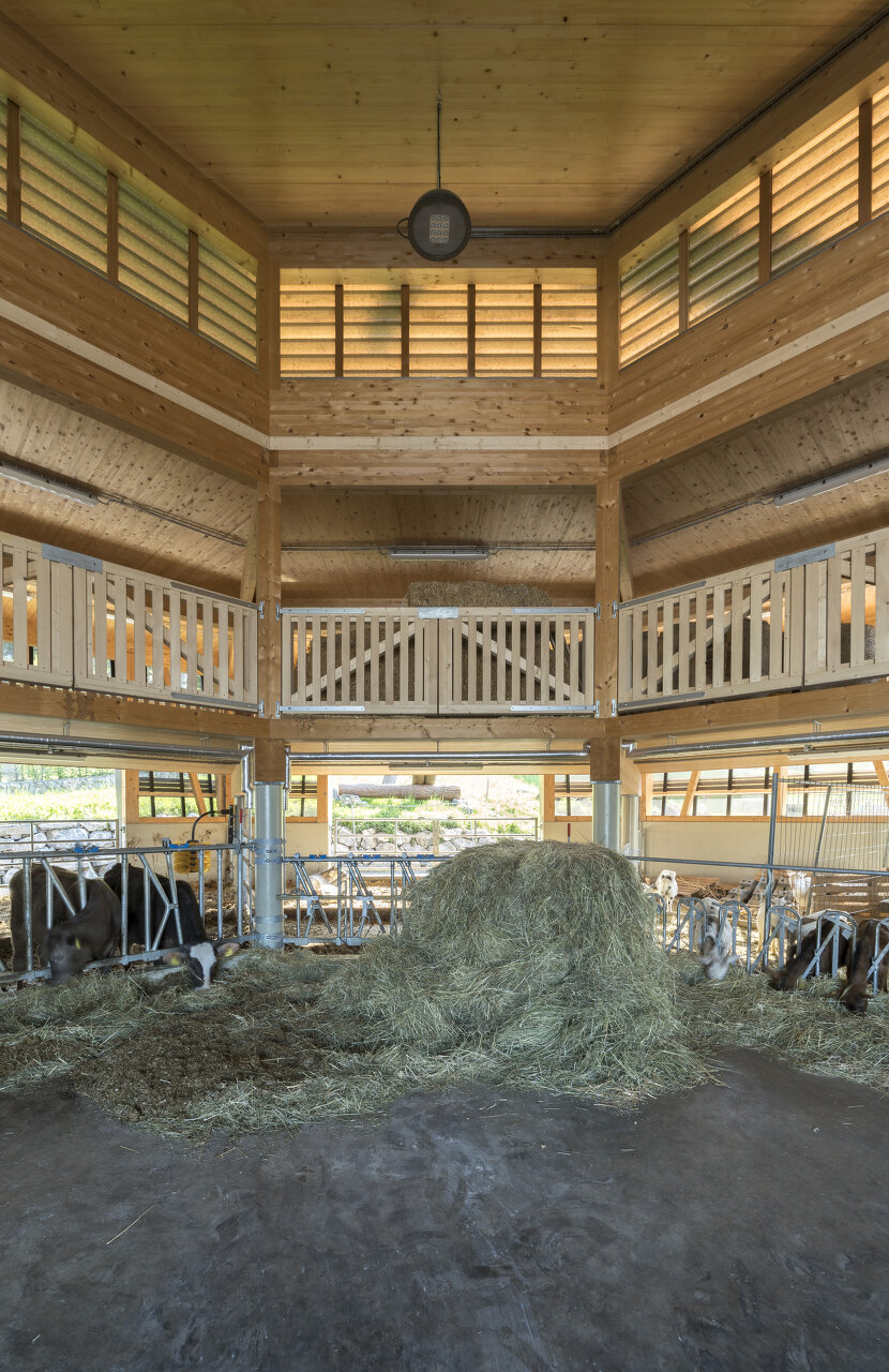 Im Erdreich versenkt, bildet die kreisrunde Düngersammelanlage die unsichtbare Basis des oktogonalen Gebäudes. Die Bodenplatte darüber dient mittig als Futtertisch und Aktionsbereich für Mensch und Maschine, rundherum wurden die Liege- und Laufbereiche für die unterschiedlichen Tierarten angeordnet. Ein Teilsegment des Achtecks enthält die gesamte technische Infrastruktur. Zwei Segmente sind als Vorbereich und Einfahrt freigehalten, sodass Heulager und Futtertisch für den Traktor vom Hofbereich aus ideal erreichbar sind.