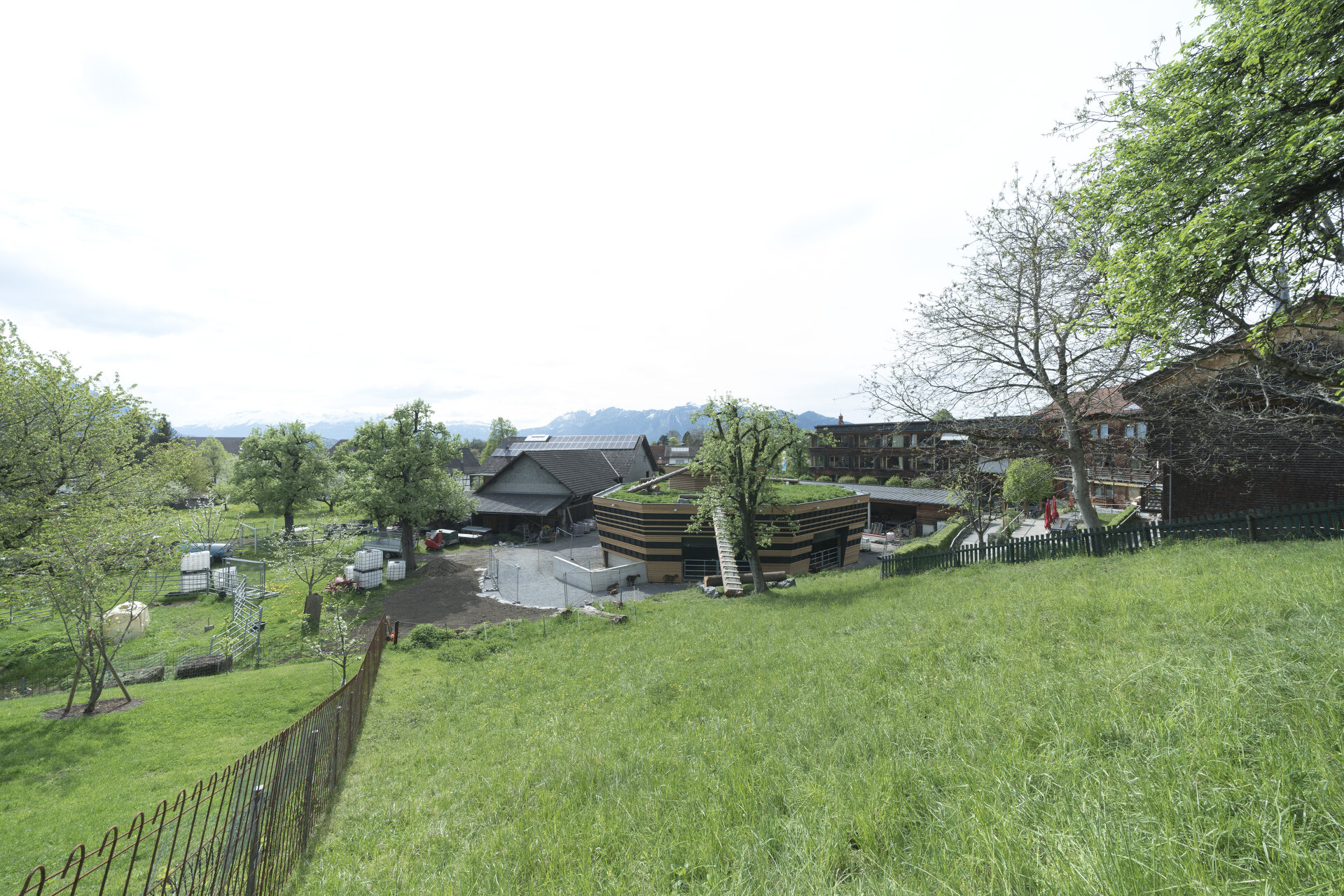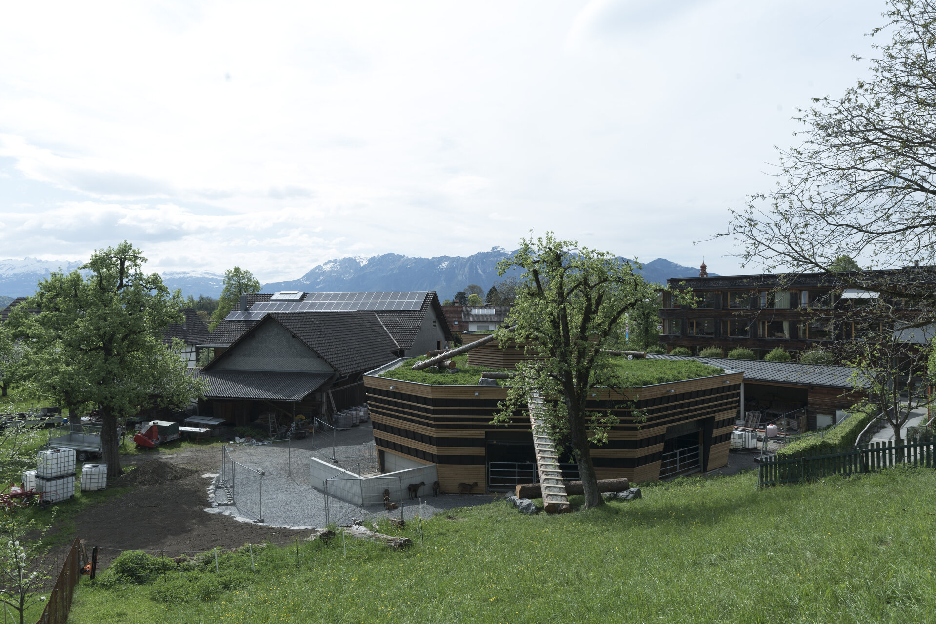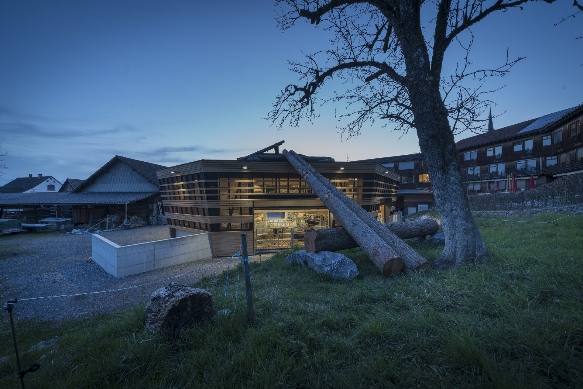 Im Erdreich versenkt, bildet die kreisrunde Düngersammelanlage die unsichtbare Basis des oktogonalen Gebäudes. Die Bodenplatte darüber dient mittig als Futtertisch und Aktionsbereich für Mensch und Maschine, rundherum wurden die Liege- und Laufbereiche für die unterschiedlichen Tierarten angeordnet. Ein Teilsegment des Achtecks enthält die gesamte technische Infrastruktur. Zwei Segmente sind als Vorbereich und Einfahrt freigehalten, sodass Heulager und Futtertisch für den Traktor vom Hofbereich aus ideal erreichbar sind.