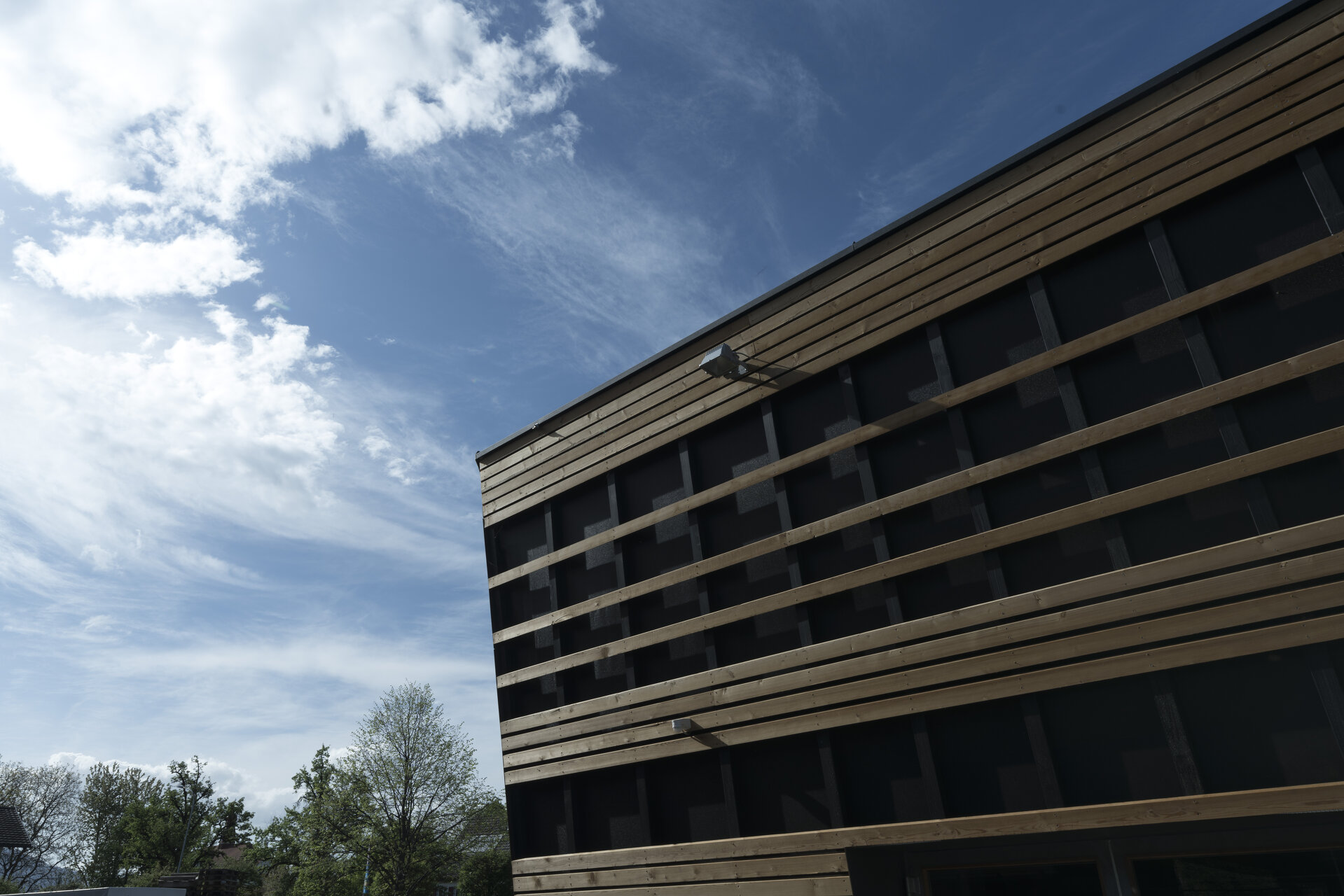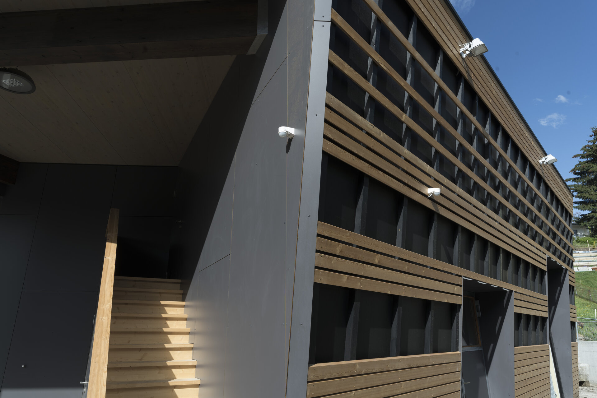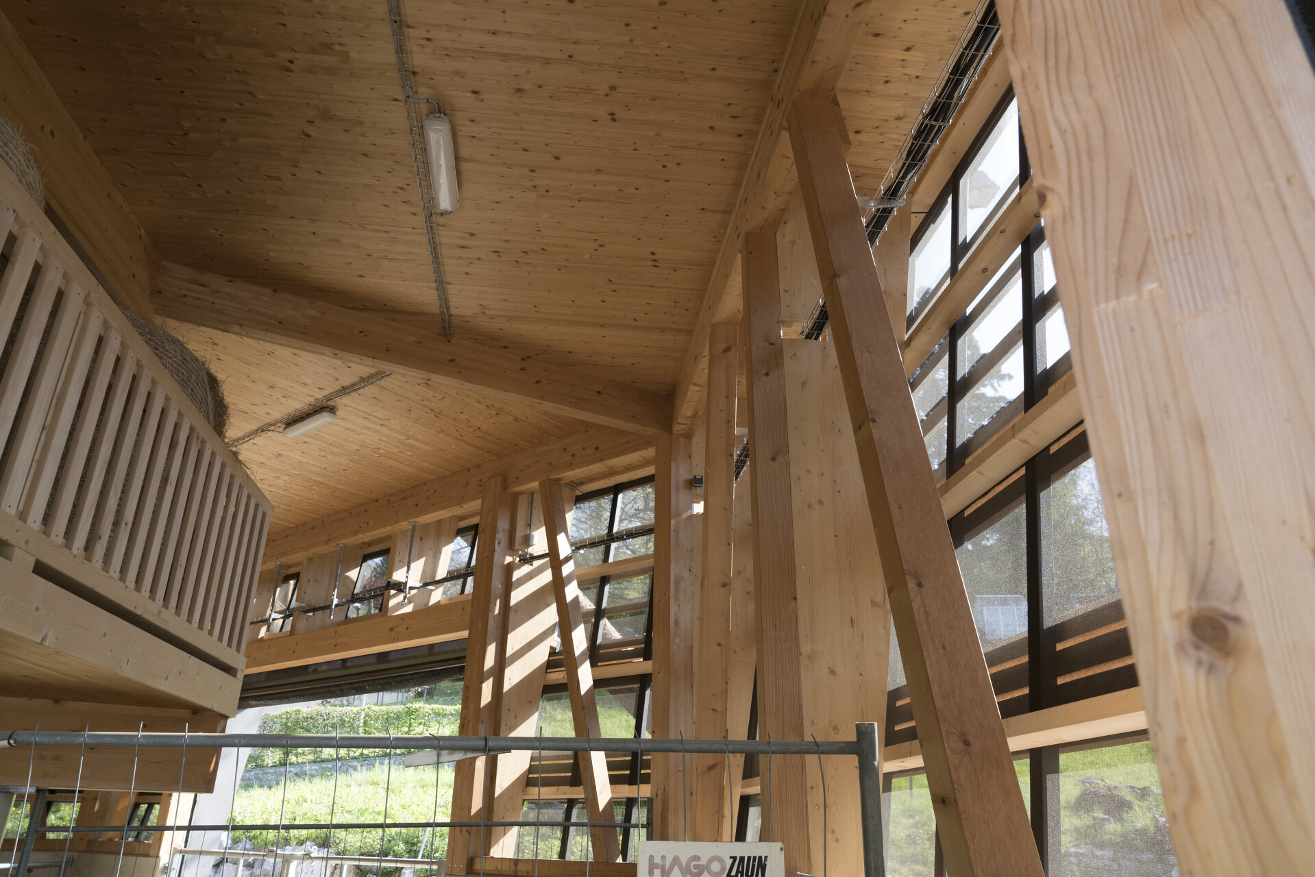 Das „Galeriegeschoß“ über den Tieren, der Dachaufbau mit Lüftungslaterne und die Fassaden wurden in unbehandeltem Holz ausgeführt. Die weite Auskragung des Daches und die schrägen Fassadenflächen gewährleisten den konstruktiven Holzschutz. Durch das dunkle, aber licht- und luftdurchlässige Netz hinter dem lockeren Fassadenschirm aus Lärchenholz wird das Bauwerk natürlich belüftet. (Text: Tobias Hagleitner)