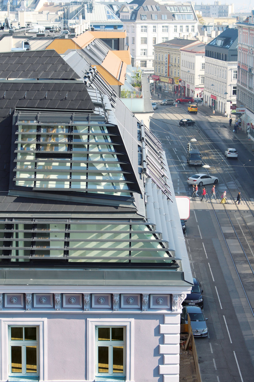 Im neu ausgebauten Dachgeschoß wurden sieben Maisonette-Wohnungen mit großzügigen Wohnräumen, die sich zu den innenhofseitigen Dachterrassen und -gärten öffnen, und zwei kleine Einliegerwohnungen geschaffen. Besonderen Wert wurde auf einen hohen energietechnischen Standard gelegt, der Dachgeschoßausbau erfüllt den Passivhausstandard. Auf der flach geneigten, innenhofseitigen Dachfläche sind die Module der Solaranlage aufgestellt. Die beiden Dachgaupen rechts und links der Eckgaupe klappen am Eck aus der Dachfläche heraus und betonen so den von weitem gut sichtbaren Eckbereich des Gebäudes. Von den dahinterliegenden Innenräumen öffnet sich ein Weitblick über die Stadt vom Wienerberg bis zur Gloriette in Schönbrunn. Die fixen Sonnenschutzlamellen an den Verglasungen schatten die hoch stehende Sonne optimal ab, während sie im Winter solare Energiegewinne ermöglichen.