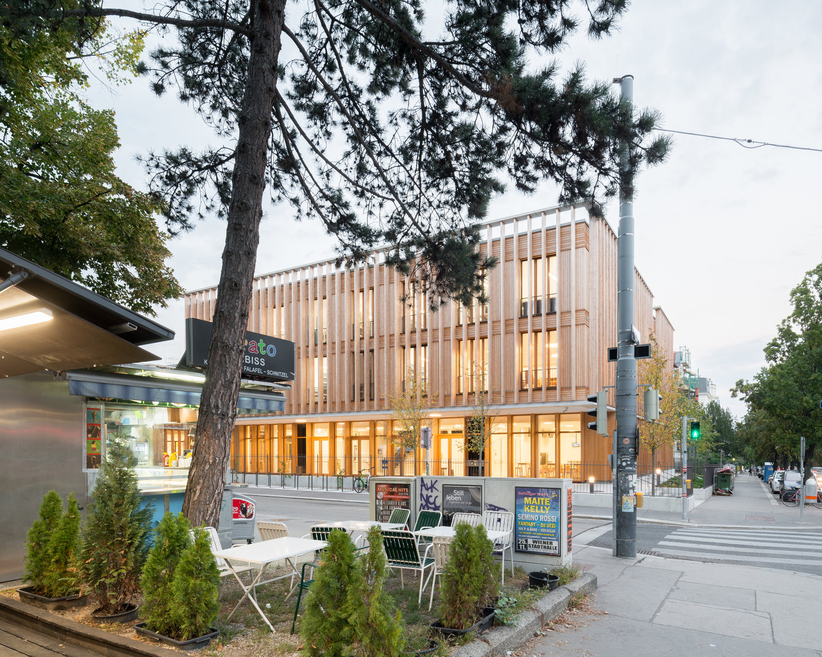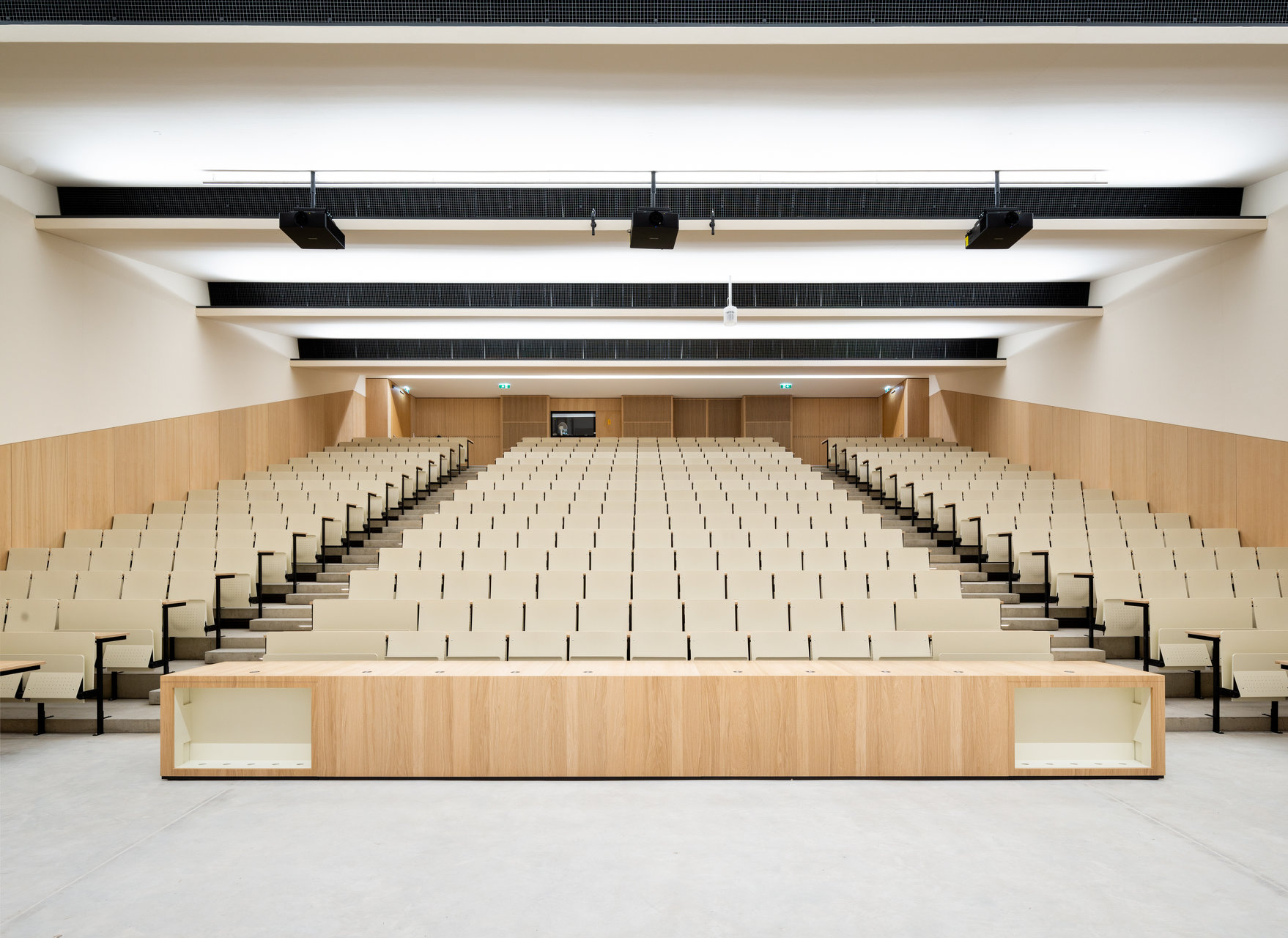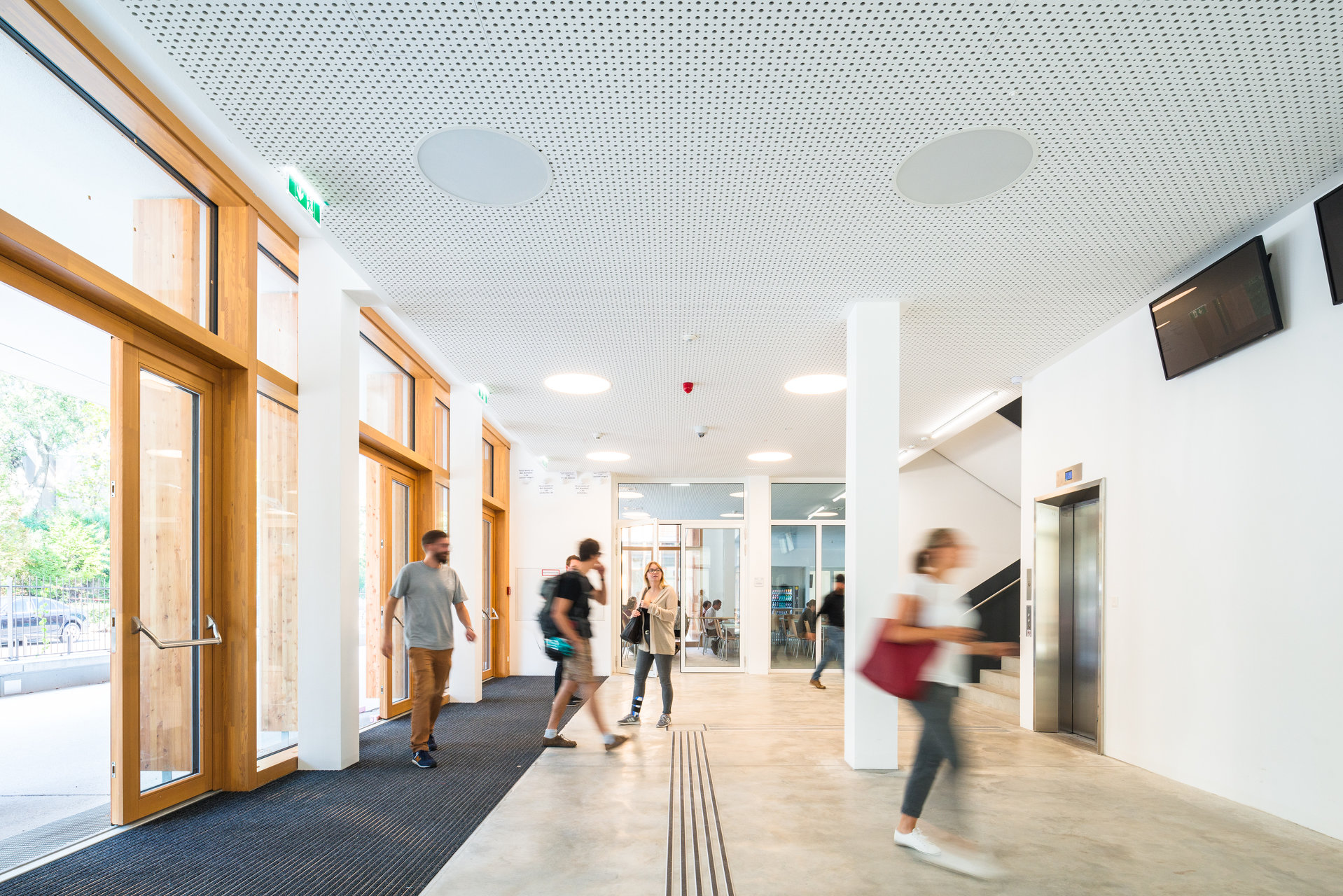 Die vorherrschende Atmosphäre ist die eines offenen Hauses, in dem Bereiche zwar abgetrennt sind, in dem aber Übergänge fließend gestaltet werden können und so ein hohes Maß an Austausch entstehen kann. Das Hauptgebäude wird im Erdgeschoss über einen großzügigen, gedeckten und platzähnlichen Bereich betreten. Dieser setzt sich im Innern in einer ausgedehnten Halle fort.Der Baukörper des Neubaus reagiert in seiner Maßstäblichkeit auf seine Umgebung. Es war eine grundlegende Entscheidung des Entwurfs, das oberirdisch errichtete Volumen baurechtlich nicht maximal auszunutzen sondern möglichst viele Nutzungen unterirdisch anzuordnen. Ein eingeschnittener Patio schafft belichtete Flächen im ersten Untergeschoss. Dadurch wurde bewusst auf die Errichtung eines Staffelgeschosses verzichtet und somit die Möglichkeit einer späteren Erweiterung geschaffen. Trotz der Widmung in zwei unterschiedliche Trakttiefen und zwei unterschiedliche Gebäudehöhen tritt das Gebäude durch die gewählten Fluchten als ein Baukörper in Erscheinung.