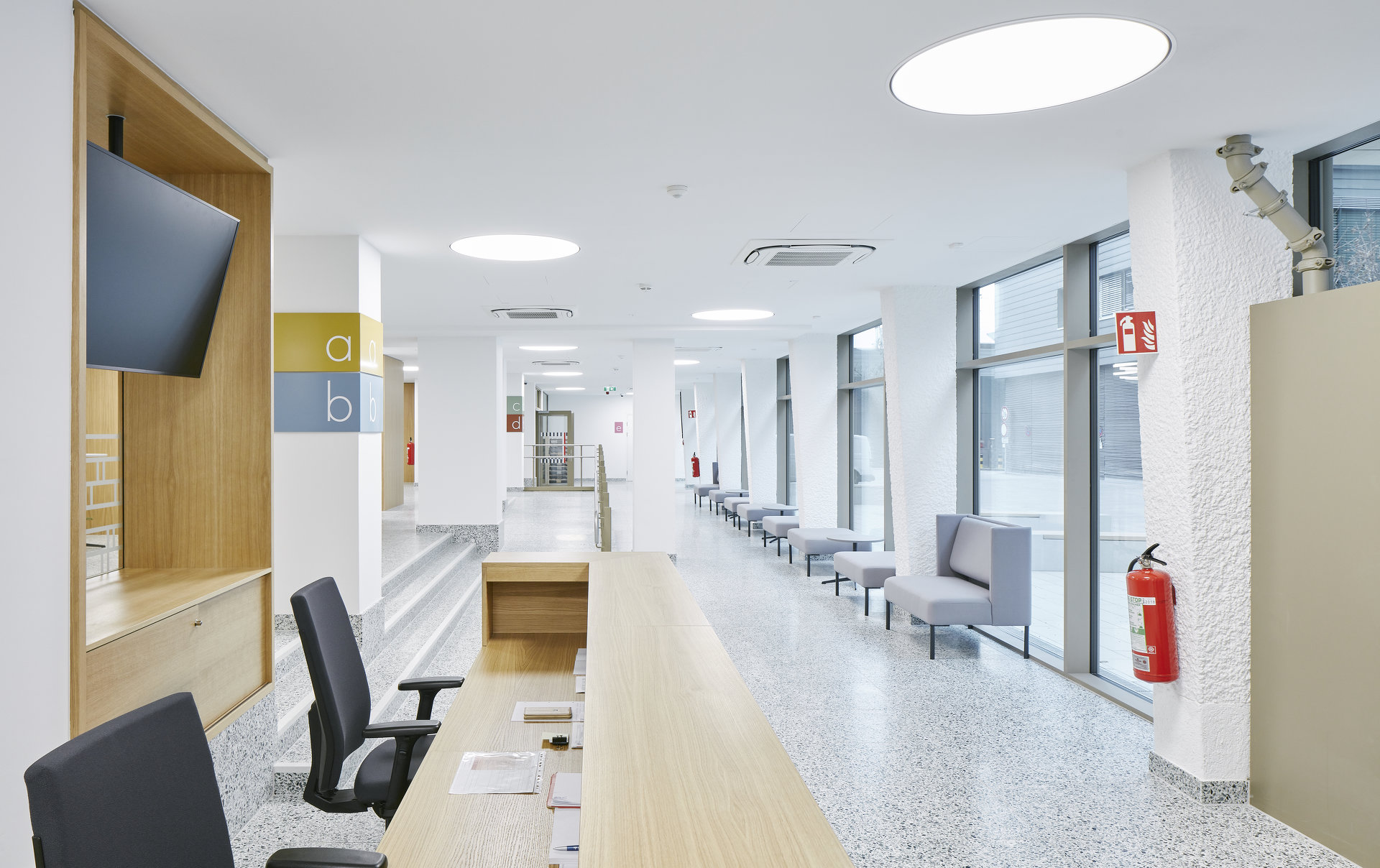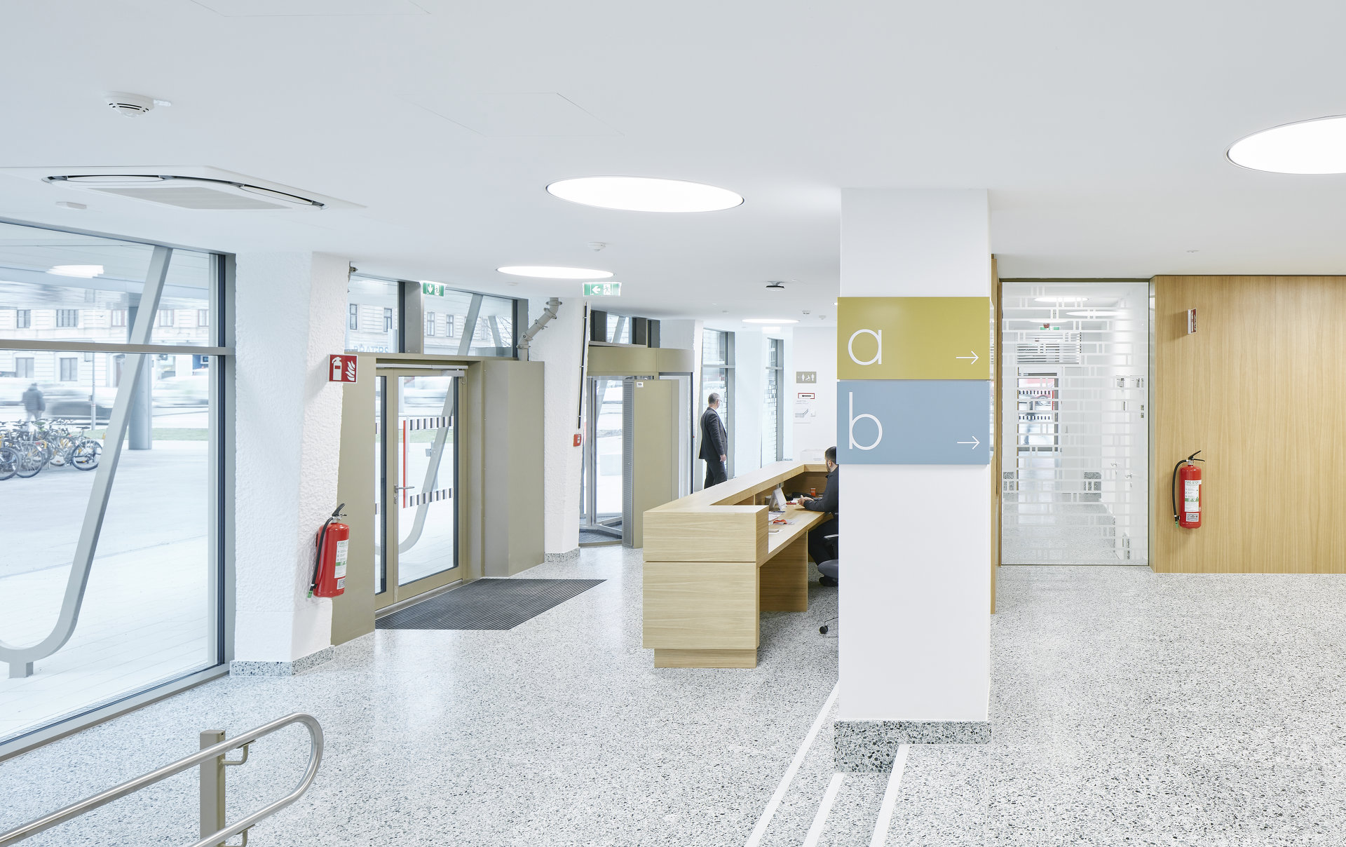 Die Eingangssituation wurde mit einem hellen, einladenden Foyer mit einem werthaltigen Terrazzoboden zu einer klaren Adresse geklärt. Auf dem Dach im 8. OG wurde eine begrünte Terrassenlandschaft für die Mitarbeiter:innen geschaffen. (Text: Architekten)
