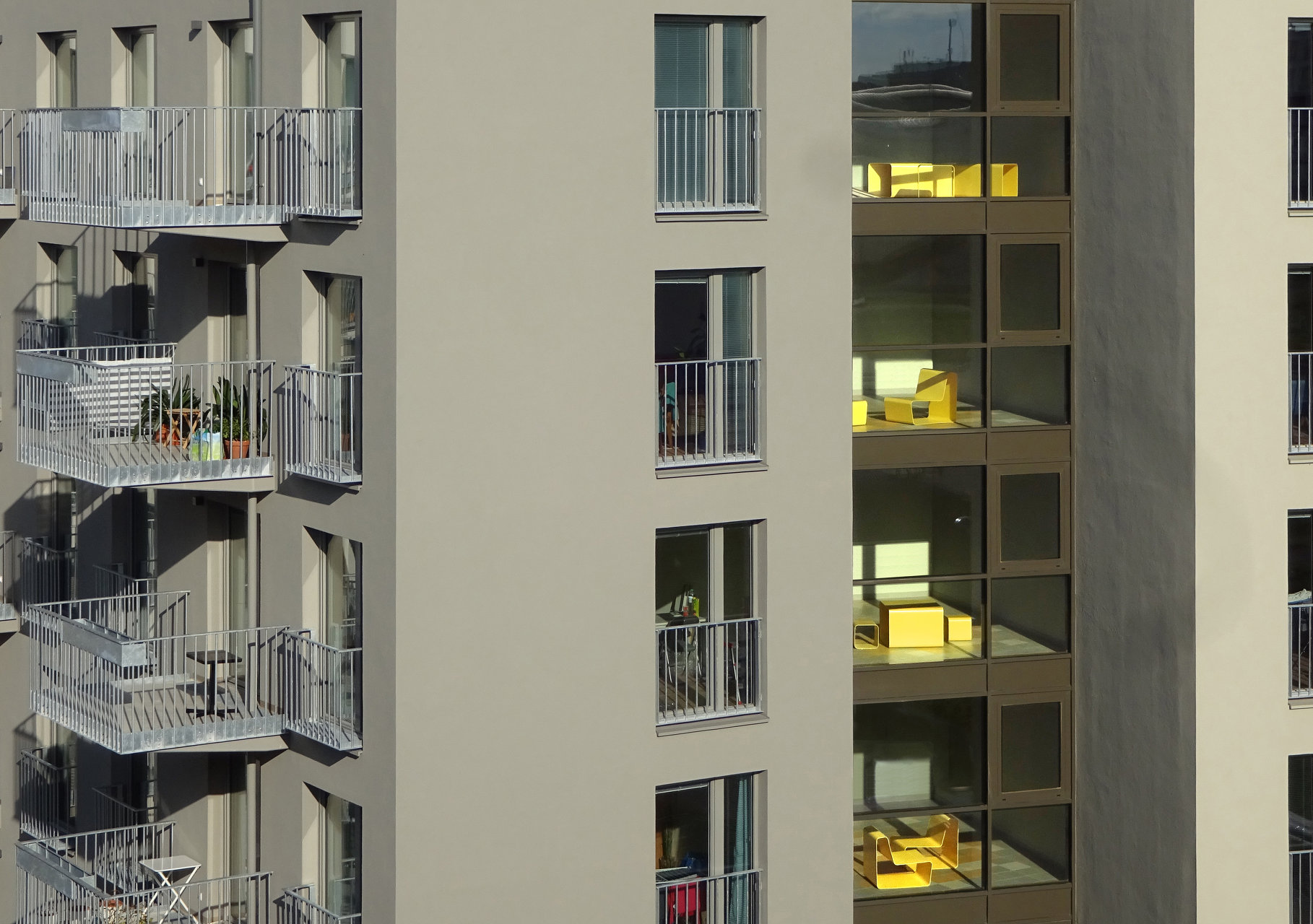 Nichts geht mehr im geförderten Wohnbau, verlauten bundesweit alle damit Befassten unisono. Hohe Grundstücks- und Baupreise stehen der Großzügigkeit der Räume und einer über das Notwendige hinausgehenden Ausstaffierung meist entgegen. Durften die Architekten in der Bonsaigasse etwa urassen, oder werden die Mieter verstärkt zur Kasse gebeten? Nein, betonen Bernhard Weinberger und Andreas Gabriel. Man hat gespart, wo es nur ging und es nicht auffällt. Zwei Fenstergrößen und verzinkte Geländer mussten genügen. Für die Fassadenfarben wählte man verschiedene Beigenuancen aus der RAL-Palette, womit auch Fensterrahmen und außen liegende Fallrohre keiner Extrabehandlung bedurften und sich dennoch harmonisch einfügen. In Stiegenhäusern und den Erschließungsflächen suchte man möglichst günstige Fliesen in Grautönen und Gelb. Am billigsten sind die grauen, von denen es am meisten gibt, zu den Flächen erhöhter Aktion hin verdichten sich die gelben, die teurer sind und daher stückgenau kalkuliert werden mussten.