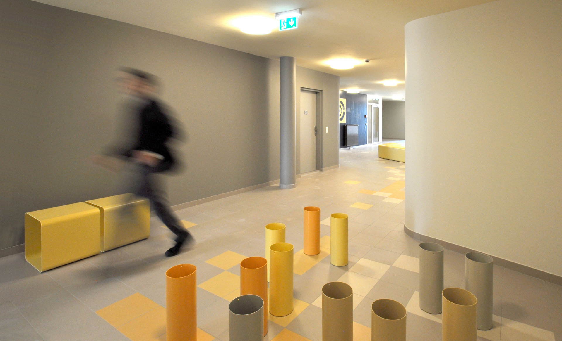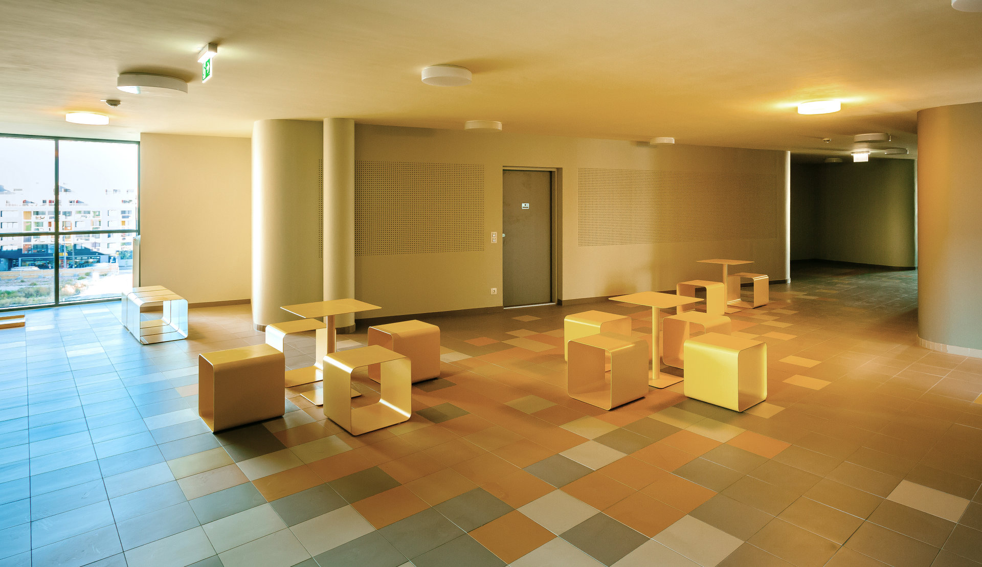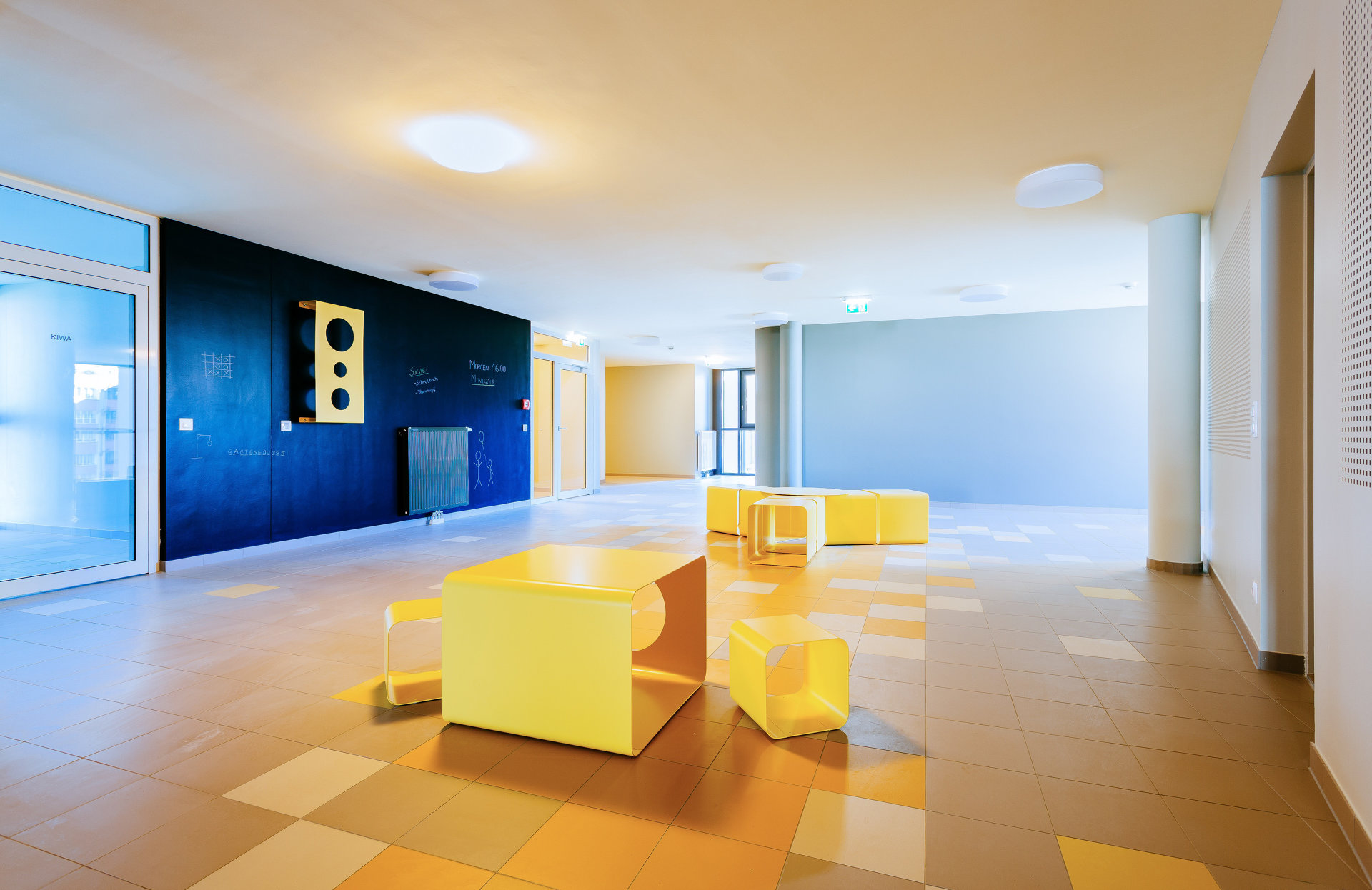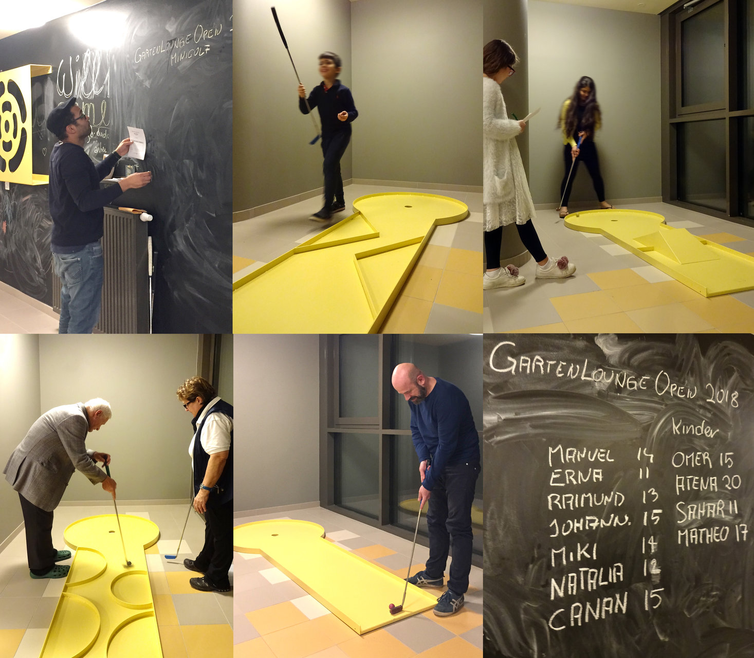 Einen Gemeinschaftsraum im üblichen Sinn gibt es nicht. Die Plätze und Gassen übernehmen diese Funktion viel besser und vielfältiger, als ein abgetrennter Raum dies je könnte. Die Architekten entwarfen dafür Mobiliar, das nach Kartonmodellen vom Schlosser gebaut wurde. Sitzmodule in Form von an zwei Seiten offenen Hohlkörpern wurden um Tische angeordnet oder zu Bänken gruppiert. Den Kindern dienen sie als Kriechtunnel. Aus dem gleichen gelb beschichteten Stahlblech wurden Minigolfbahnen produziert, für jeden Stock eine andere; zusammen ergibt sich ein vertikaler Minigolfparcours. Brettspiele wie Schach und „Mensch ärgere dich nicht“ wurden ins Großformat übertragen, die Spielfeldmarkierung bildet das Fliesenmuster des Bodens. Auf schwarzen Tafelwänden werden per Kreide Botschaften ausgetauscht. Kleine Eye-Catcher sind die darauf angebrachten, jeweils anders gestalteten Wurfspiele. Es entstanden geschoßweise kleine Nachbarschaften, eine Art halböffentlicher Raum im Inneren, der dank Minigolf über die Geschoße hinweg der Bewohnerschaft – darunter jener von zwei Studierenden-Wohngemeinschaften – Anlass gibt, immer wieder das ganze Haus zu erkunden. Ausblick in die Umgebung gewähren aus diesen Binnenräumen Verglasungen zwischen den Wohnungsgruppen. Die Gebäudekonfiguration fördert die Kommunikation, sorgt zudem dafür, dass keine nur nach Norden gerichteten Wohnungen entstehen, sondern zweiseitig orientierte Kopfwohnungen, nur ein Stiegenhaus das ganze Gebäude erschließen kann und zu ebener Erde verschiedene Freiraumqualitäten (EGKK Landschaftsarchitektur) und eine gewisse Durchlässigkeit zur Umgebung entstehen kann.