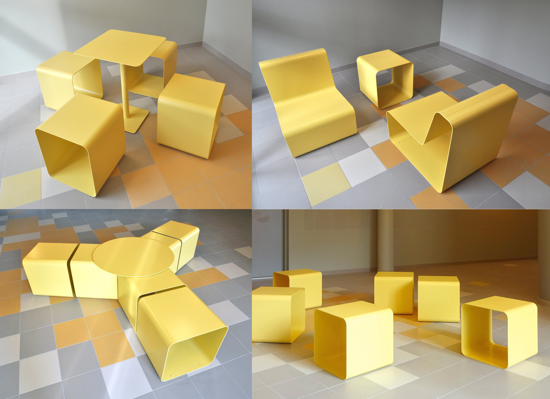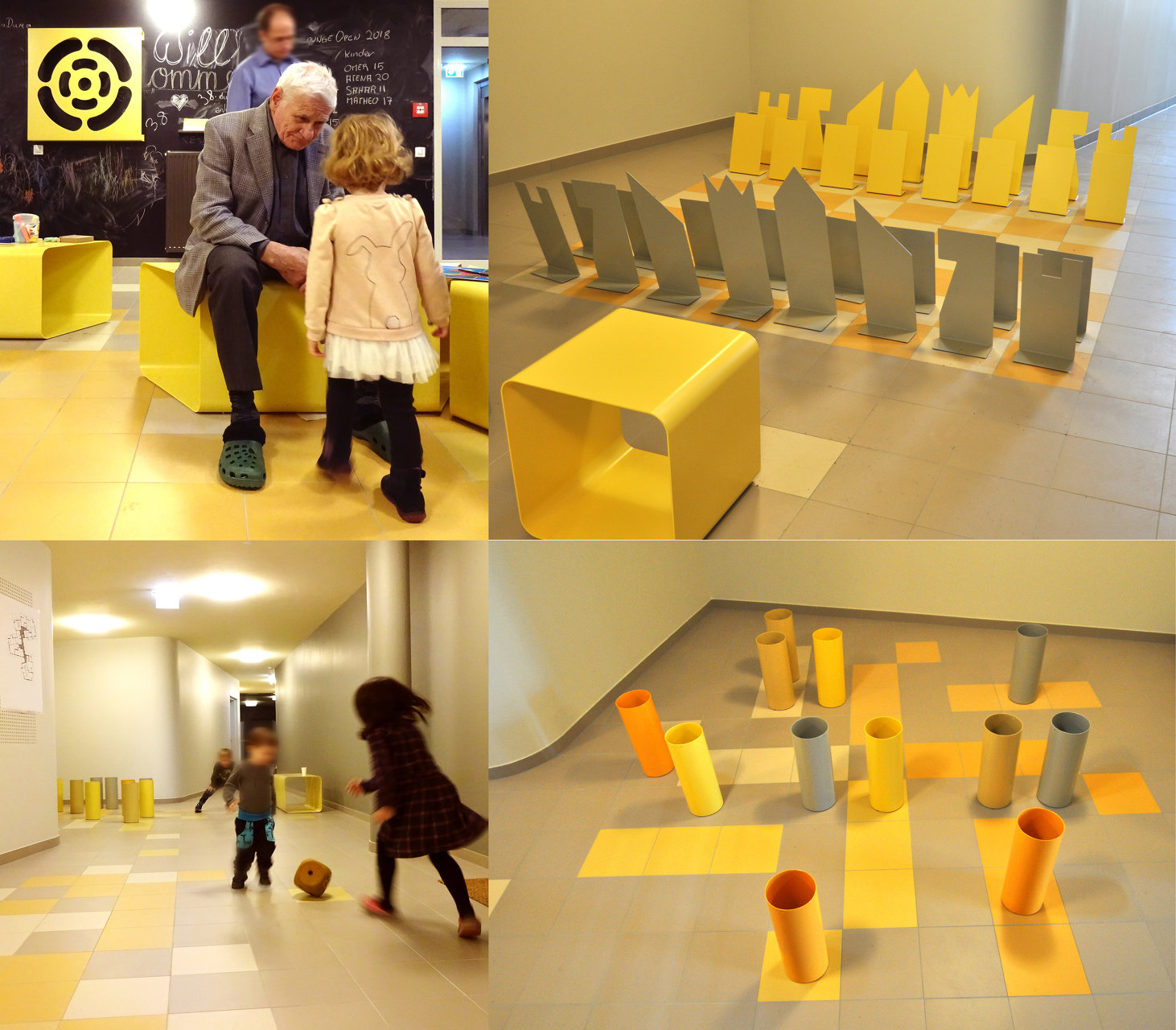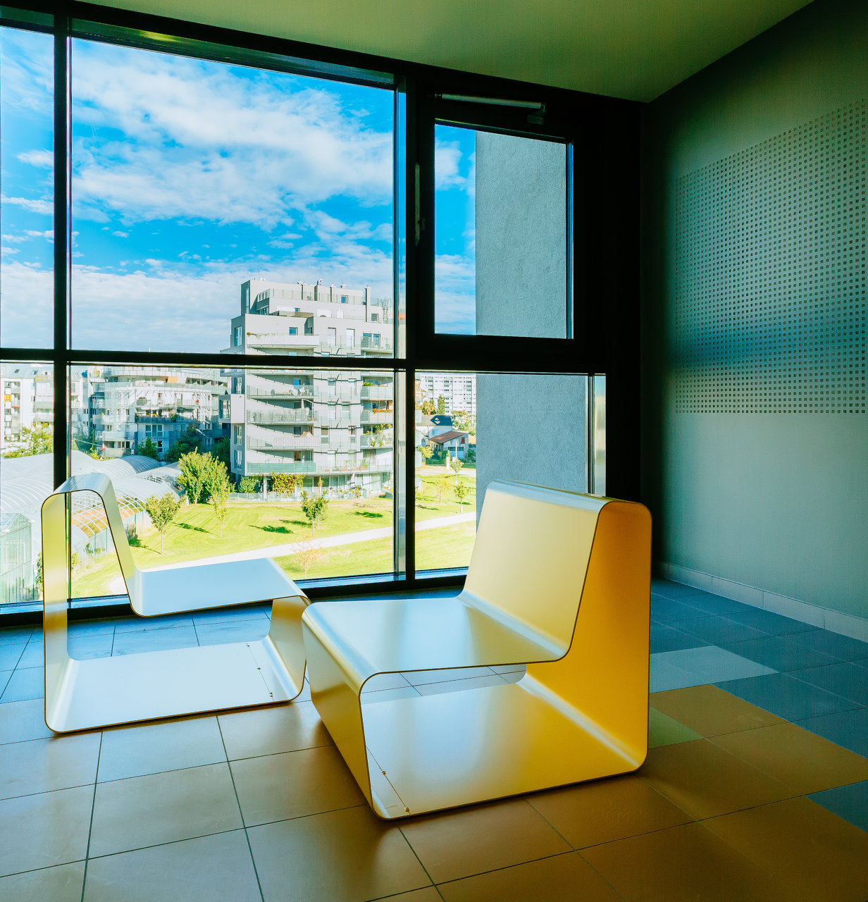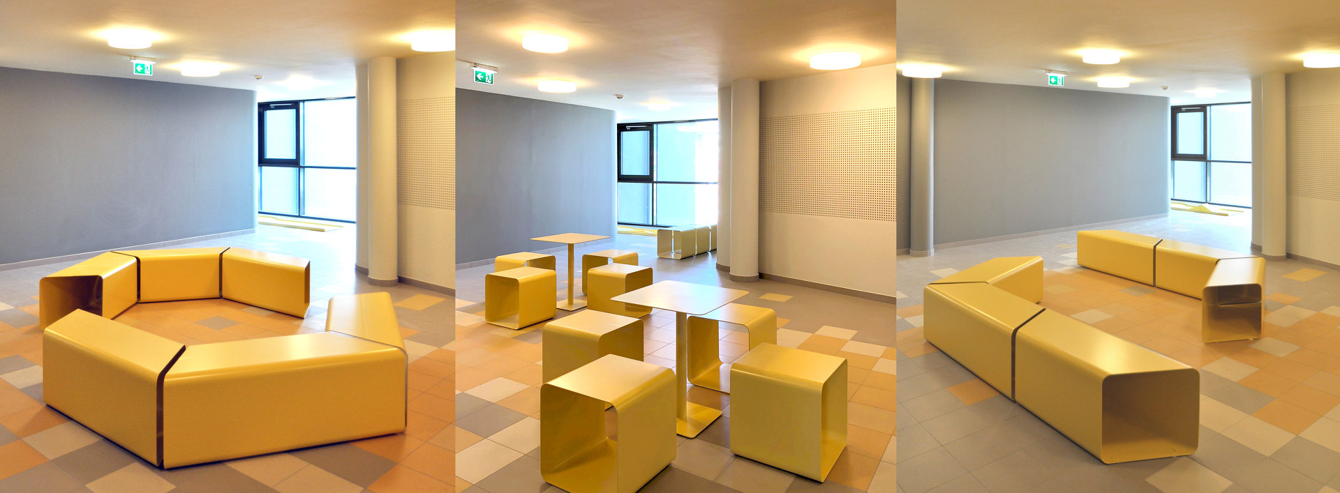 Einen Gemeinschaftsraum im üblichen Sinn gibt es nicht. Die Plätze und Gassen übernehmen diese Funktion viel besser und vielfältiger, als ein abgetrennter Raum dies je könnte. Die Architekten entwarfen dafür Mobiliar, das nach Kartonmodellen vom Schlosser gebaut wurde. Sitzmodule in Form von an zwei Seiten offenen Hohlkörpern wurden um Tische angeordnet oder zu Bänken gruppiert. Den Kindern dienen sie als Kriechtunnel. Aus dem gleichen gelb beschichteten Stahlblech wurden Minigolfbahnen produziert, für jeden Stock eine andere; zusammen ergibt sich ein vertikaler Minigolfparcours. Brettspiele wie Schach und „Mensch ärgere dich nicht“ wurden ins Großformat übertragen, die Spielfeldmarkierung bildet das Fliesenmuster des Bodens. Auf schwarzen Tafelwänden werden per Kreide Botschaften ausgetauscht. Kleine Eye-Catcher sind die darauf angebrachten, jeweils anders gestalteten Wurfspiele. Es entstanden geschoßweise kleine Nachbarschaften, eine Art halböffentlicher Raum im Inneren, der dank Minigolf über die Geschoße hinweg der Bewohnerschaft – darunter jener von zwei Studierenden-Wohngemeinschaften – Anlass gibt, immer wieder das ganze Haus zu erkunden. Ausblick in die Umgebung gewähren aus diesen Binnenräumen Verglasungen zwischen den Wohnungsgruppen. Die Gebäudekonfiguration fördert die Kommunikation, sorgt zudem dafür, dass keine nur nach Norden gerichteten Wohnungen entstehen, sondern zweiseitig orientierte Kopfwohnungen, nur ein Stiegenhaus das ganze Gebäude erschließen kann und zu ebener Erde verschiedene Freiraumqualitäten (EGKK Landschaftsarchitektur) und eine gewisse Durchlässigkeit zur Umgebung entstehen kann.