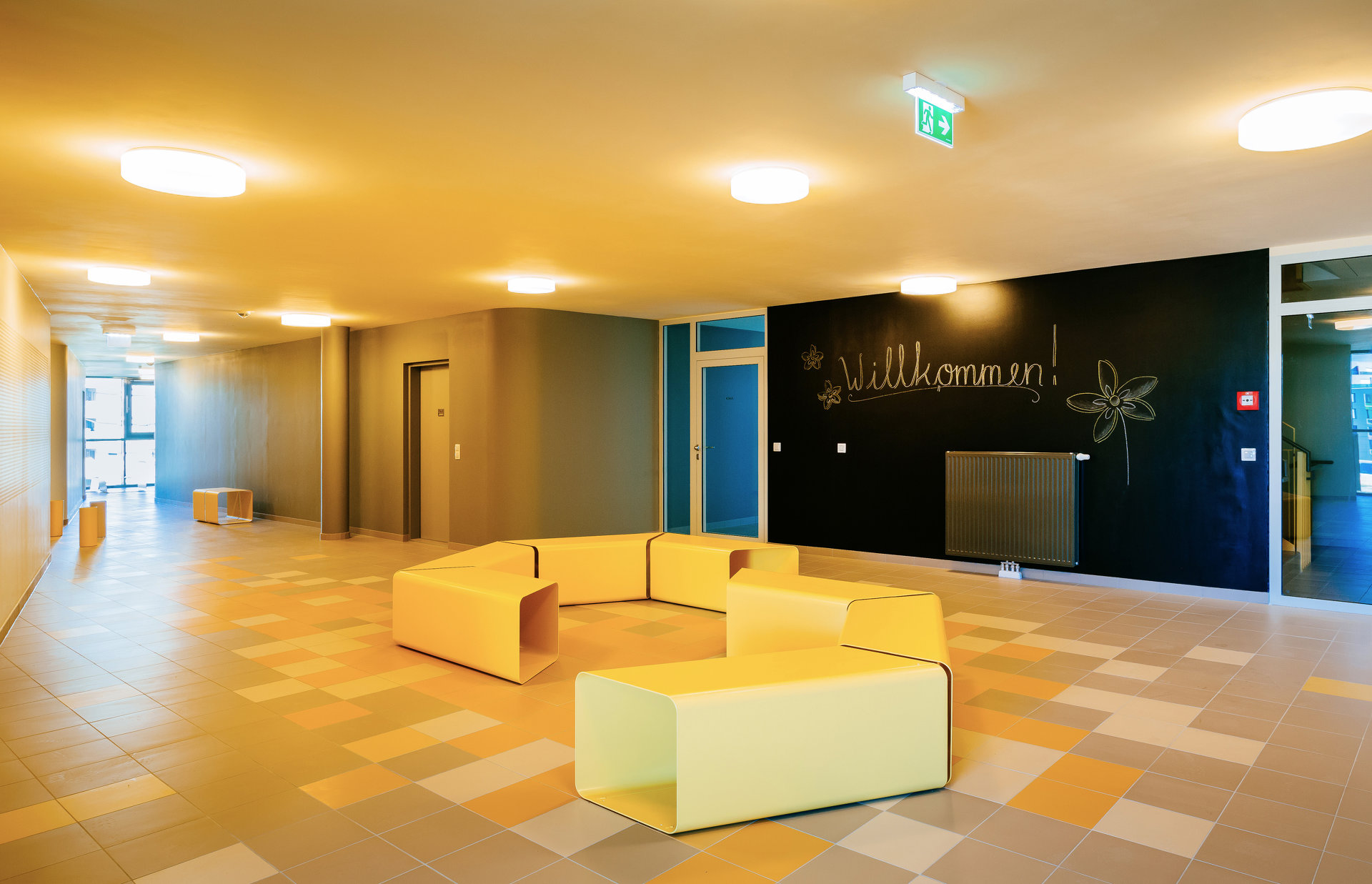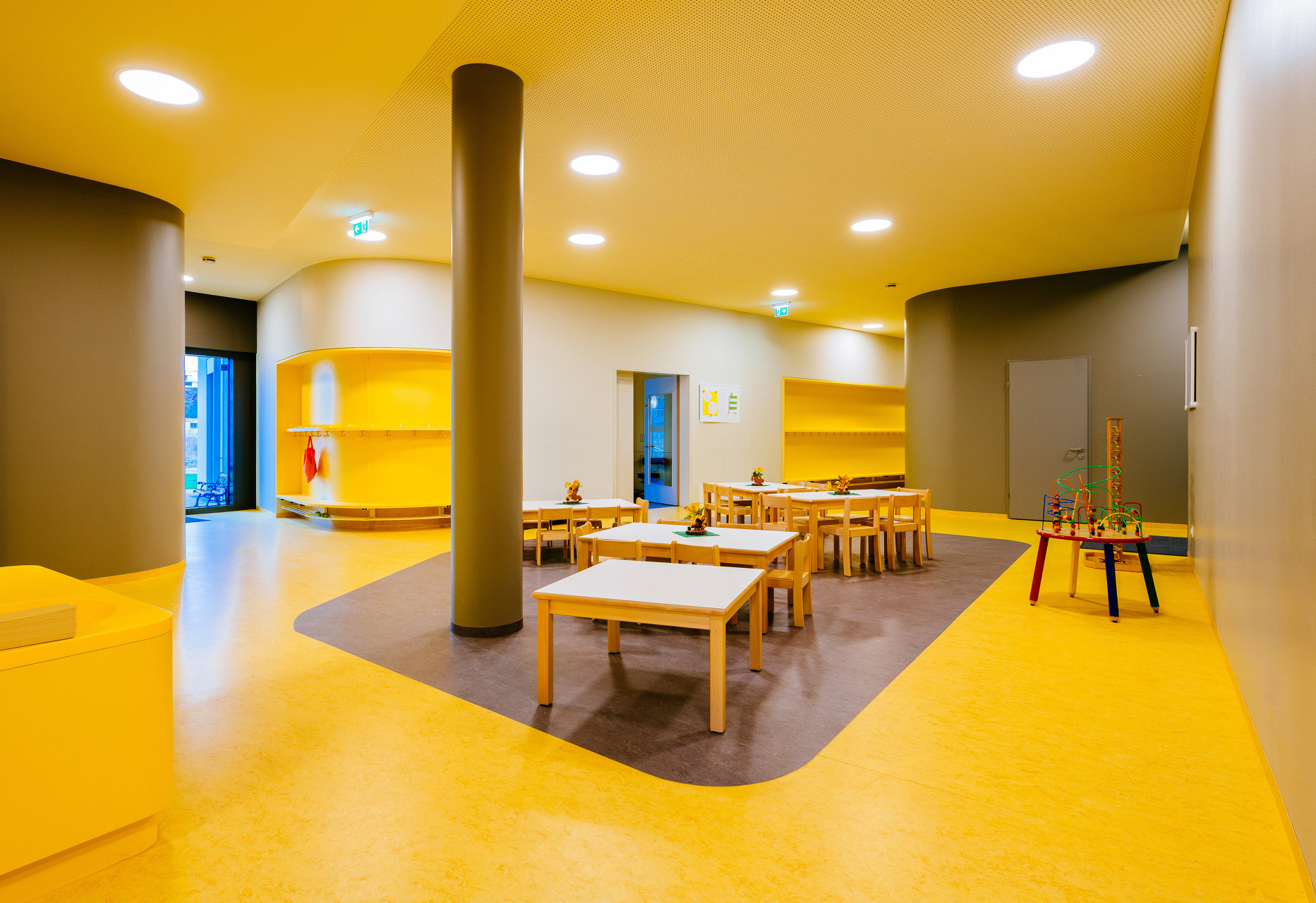 Einen Flügel des Erdgeschoßes besetzt ein von der Volkshilfe betreutes Seniorenwohnprojekt, die anderen ein Kindergarten und dazwischen der überdeckte gemeinsame Vorplatz – mit Sitzbänken und Tischtennistisch ebenso ein Ort der Begegnung. Bereits in der Rohbauphase fanden Workshops statt, um die Ideen der Architekten zu kommunizieren und Mieterwünsche berücksichtigen zu können. Eine moderierte Begleitung zumindest bis zur Einzugsphase schafft früh die Grundlagen für ein gedeihliches Zusammenleben und ist eine Investition, die später viel Ärger spart.