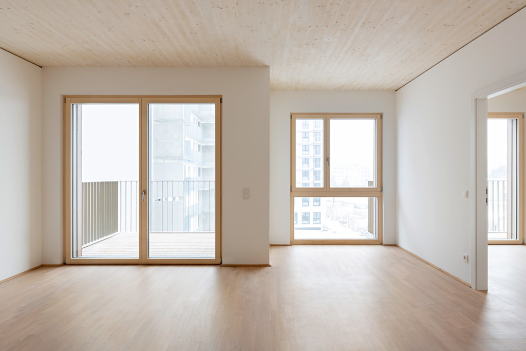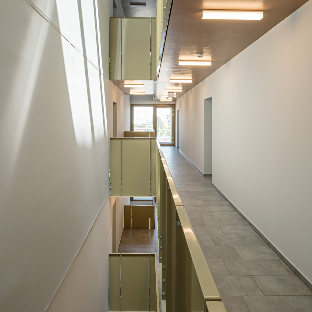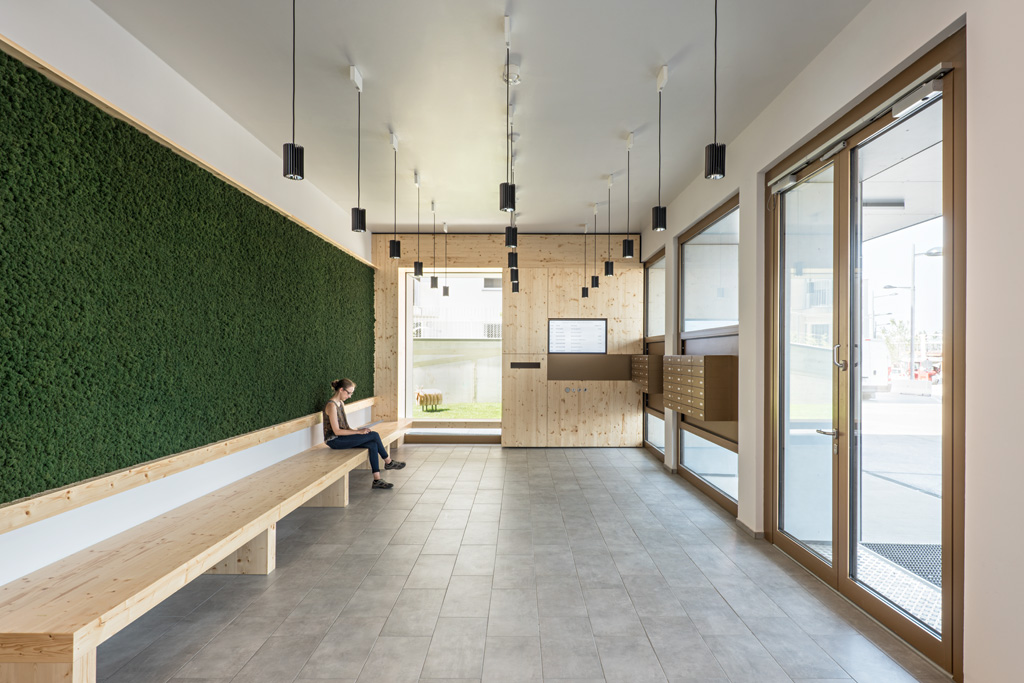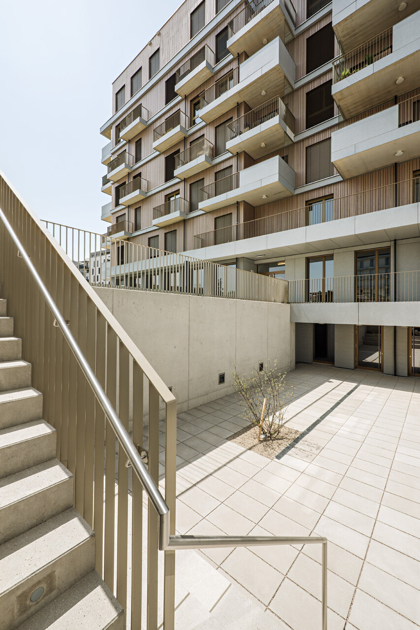 - Holz-Hybridbauweise bindet CO2 und reduziert den Primärenergieverbrauch; einfache statische Grundstruktur mit natürlich belichteter Erschließung.