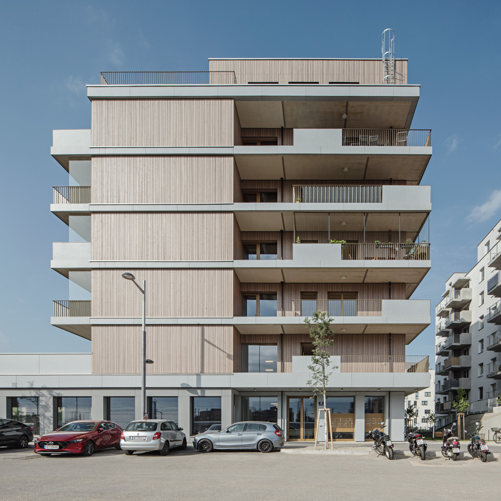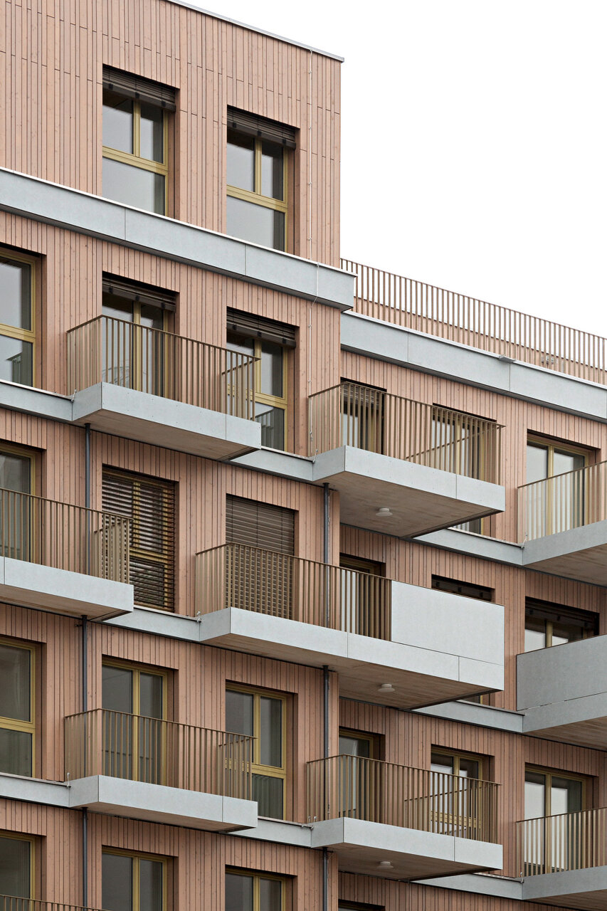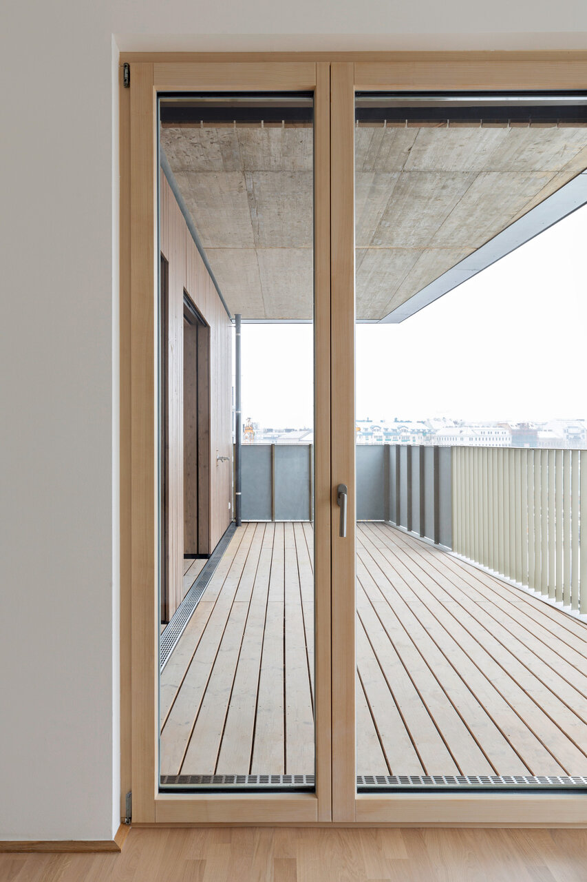 - Holz-Hybridbauweise bindet CO2 und reduziert den Primärenergieverbrauch; einfache statische Grundstruktur mit natürlich belichteter Erschließung.