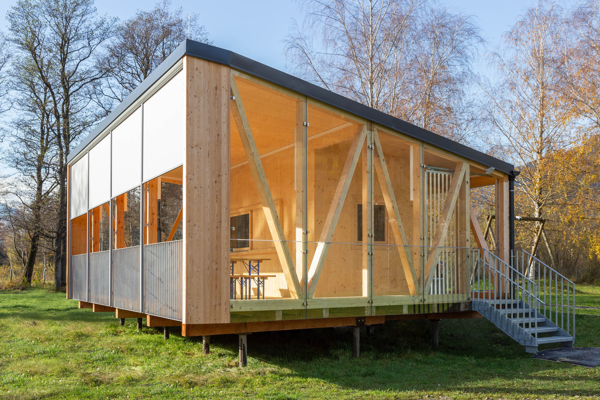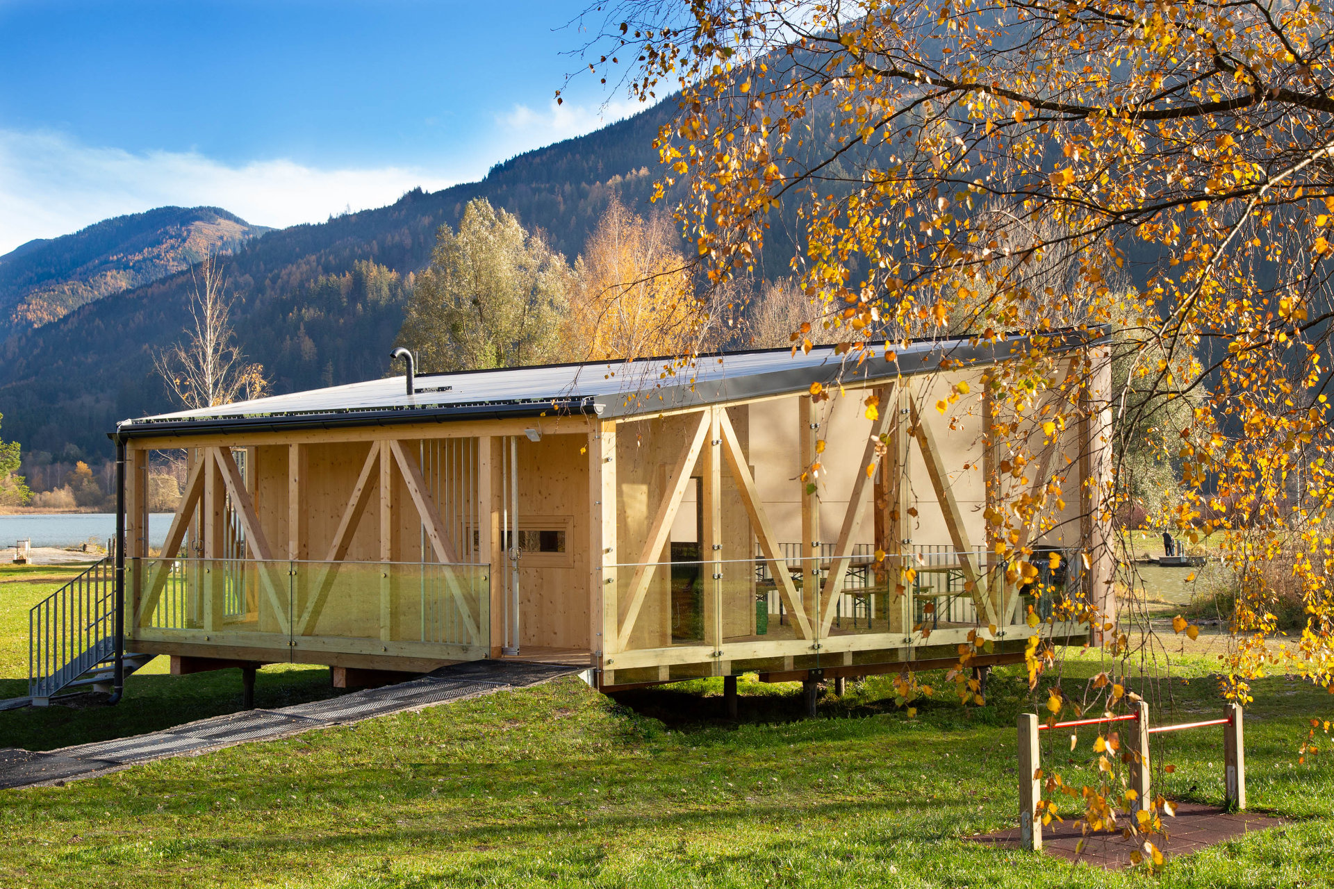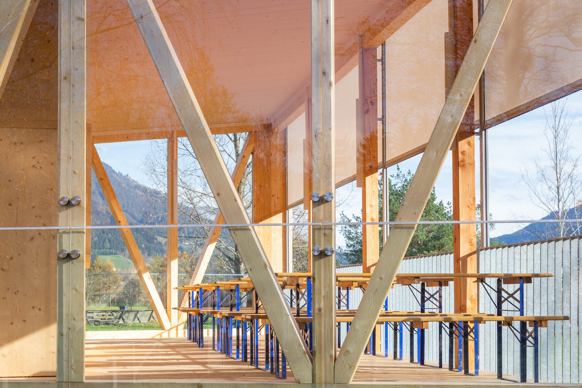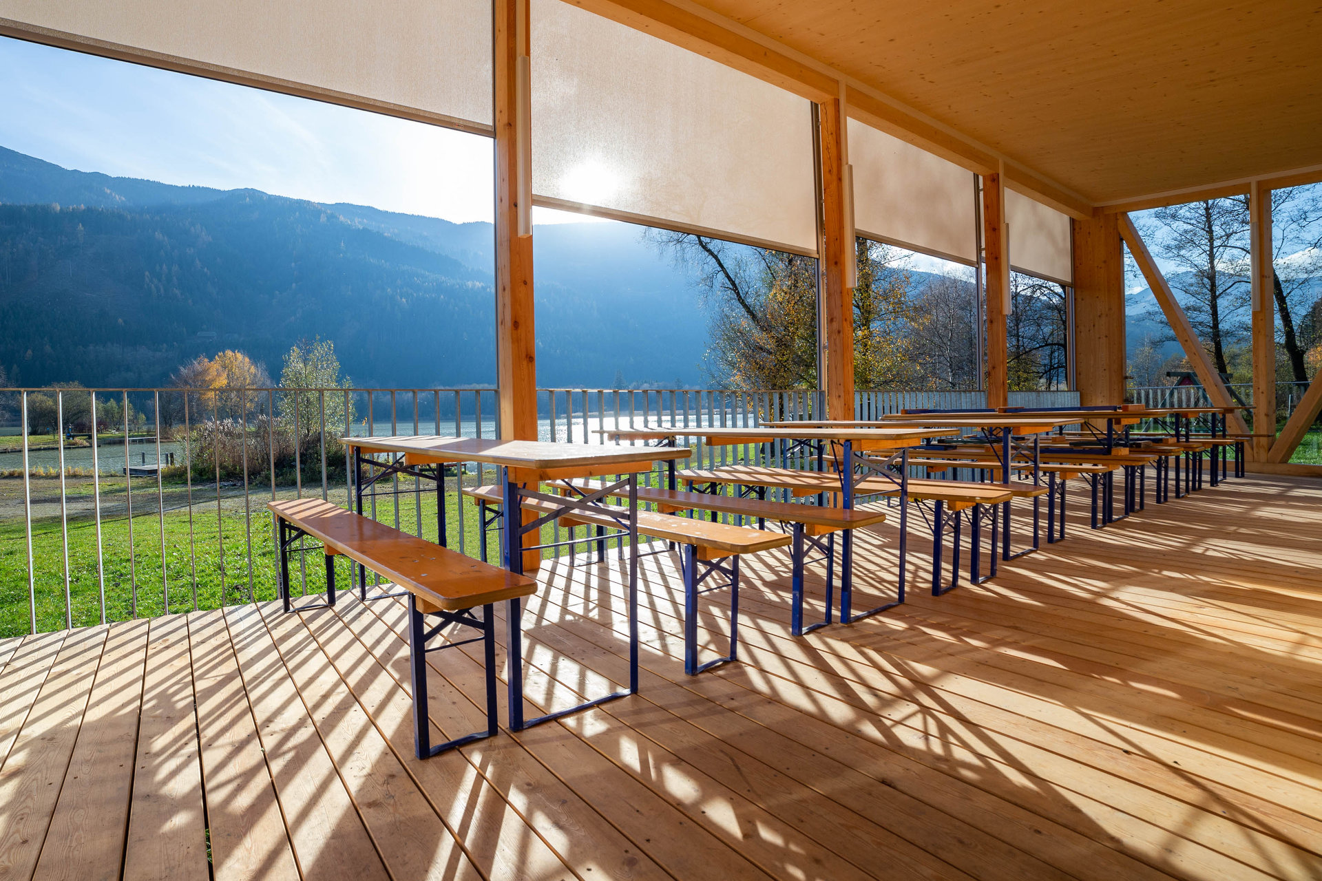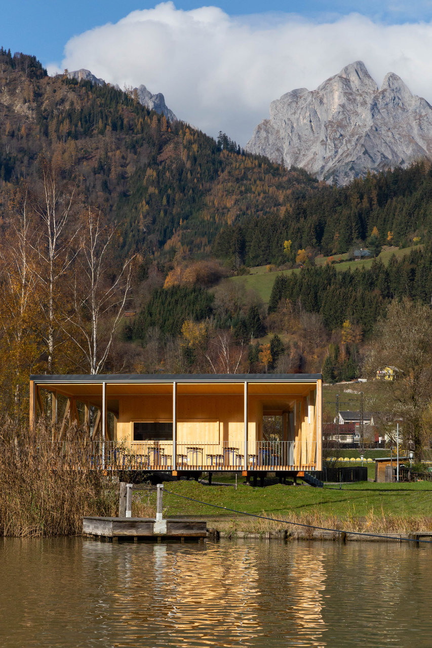 Die Begrenzung der Verkaufsraumfläche auf 14 m² ergibt sich aus der Ersatzbaufunktion. Diese ist in zwei Räume unterteilt, die Bar und ein Küchenlager. Eine weit ausladende, 56 m² große Terrassenkonstruktion umrundet das Bauwerk. Brettsperrholz an Decke und Wänden, ein Boden aus Lärchenbrettern reichen für Statik und Isolierung. Im Barbereich werden die Öffnungen mit massiven Schiebeläden und -türen aus Fichtenholz reguliert. Die Trapezform des Pavillons will die Aussicht auf den See inszenieren. Aus diesem Grund wurden die zwei Seitenfronten sowie die schmälere hintere Seite mit aussteifenden Holzkonstruktionen ausgeführt, der Gastbereich ist dagegen von Holzkonstruktionen soweit wie möglich befreit. Der Ausrichtung des Gebäudes zum See wird auch mit dem Pultdach unterstrichen. (Text: Achitekten, bearbeitet)