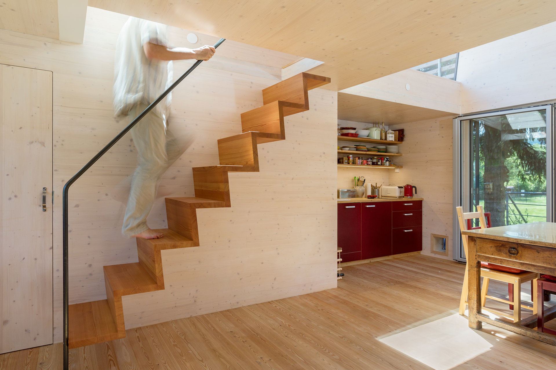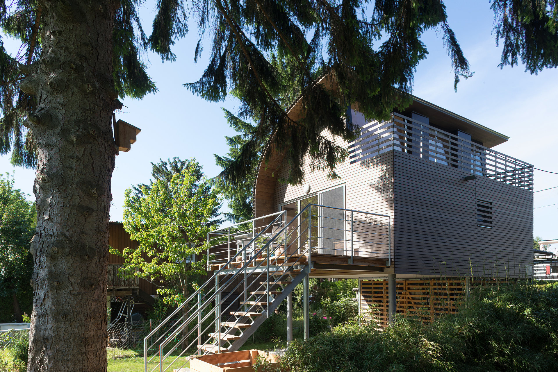 Das Haus ist aus Brettsperrholz-Fertigteilen auf konstruktiven Stahlbau errichtet. Da die Bauherrschaft seine Bewohnbarkeit übers ganze Jahr wünschten, ist es auch gut gedämmt. Eine horizontale Lärchenschalung prägt das äussere Erscheinungsbild, wobei das auffälligste Merkmal wohl das gekrümmte Dach aus verzinktem Wellblech ist. (Text: Architekt:innen)