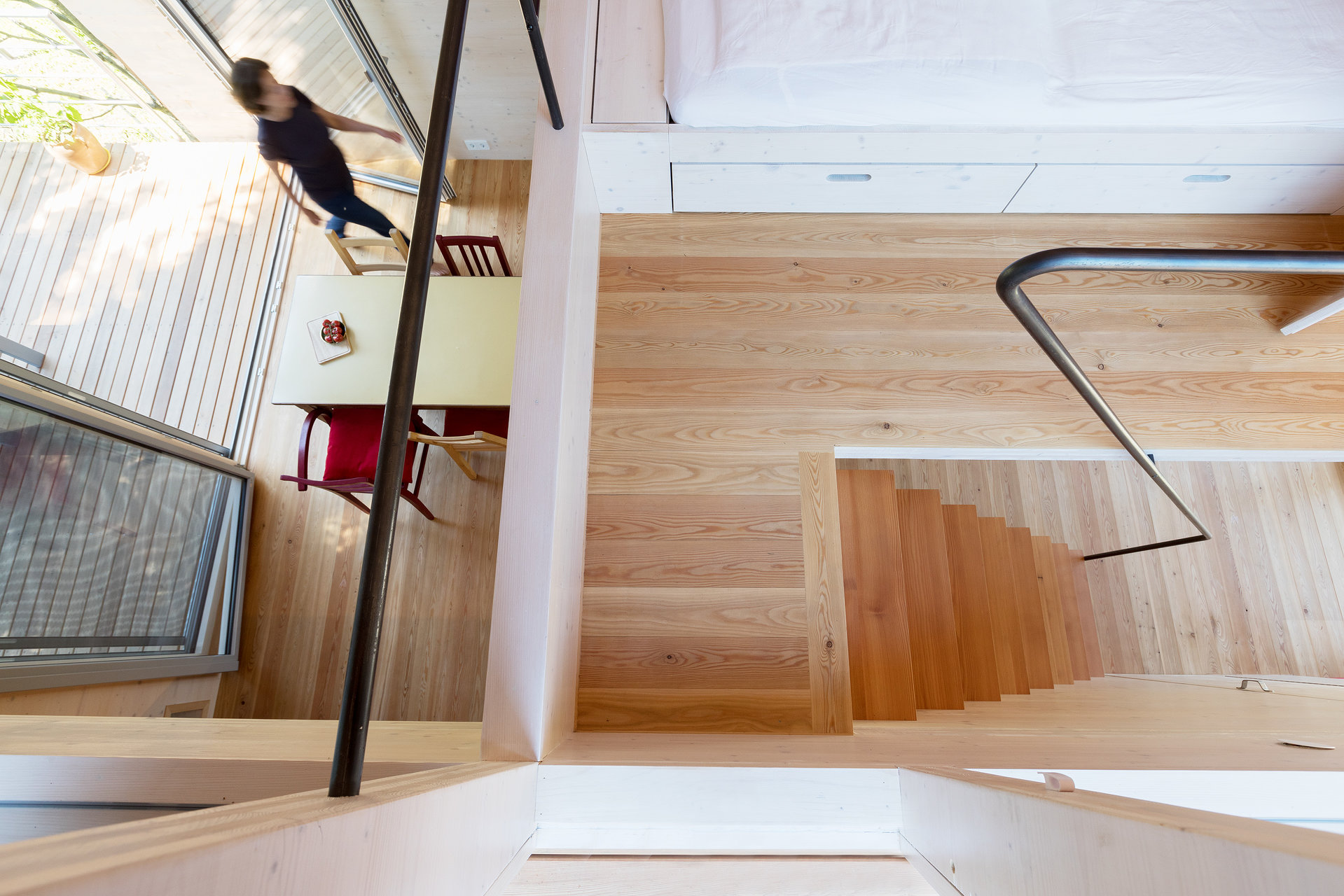 Es geht uns hier um eine zeitgenössische Interpretation des Themas Donau-Badehütte unter Berücksichtigung der baulichen Erleichterungen des NÖ-Kleingartengesetzes. Die Herausforderung ist es, auf 37,50m² Grundfläche alle Funktionen eines Einfamilienhauses unterzubringen. Das gelingt auf eineinhalb Geschossen unter dem tonnenförmigen Dach, das eine bestmögliche Raumausnutzung gewährleistet. Ähnlich wie bei der Einrichtung eines Bootes muss alles bis ins Detail gut organisiert sein. Eine wesentliche Anforderung war, trotz der Kleinteiligkeit ein grosszügiges Raumgefühl zu erzeugen. Der Wohnraum ist durchgängig, öffnet sich im Essbereich auch bis unters Dach und wird beidseitig durch Terrassen erweitert.