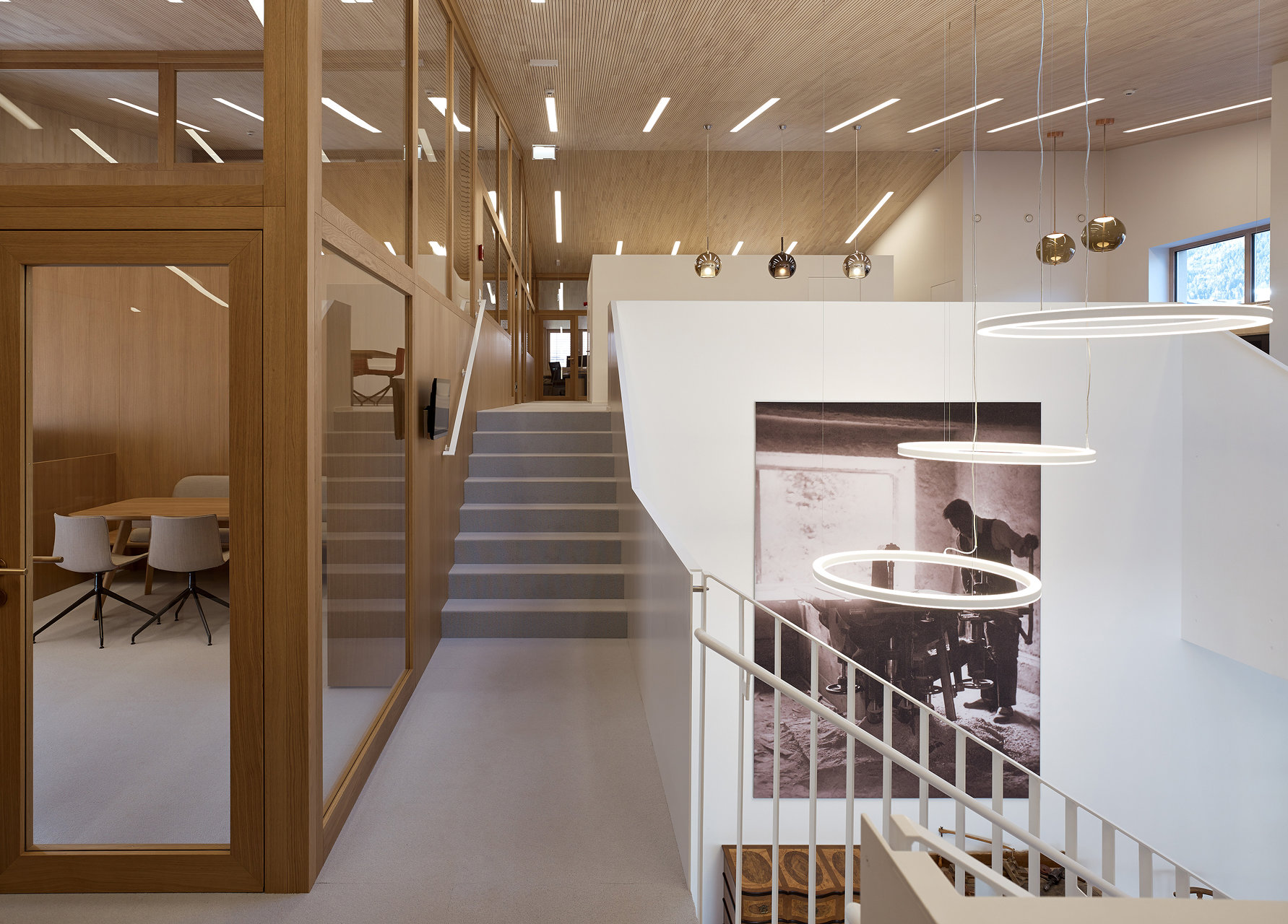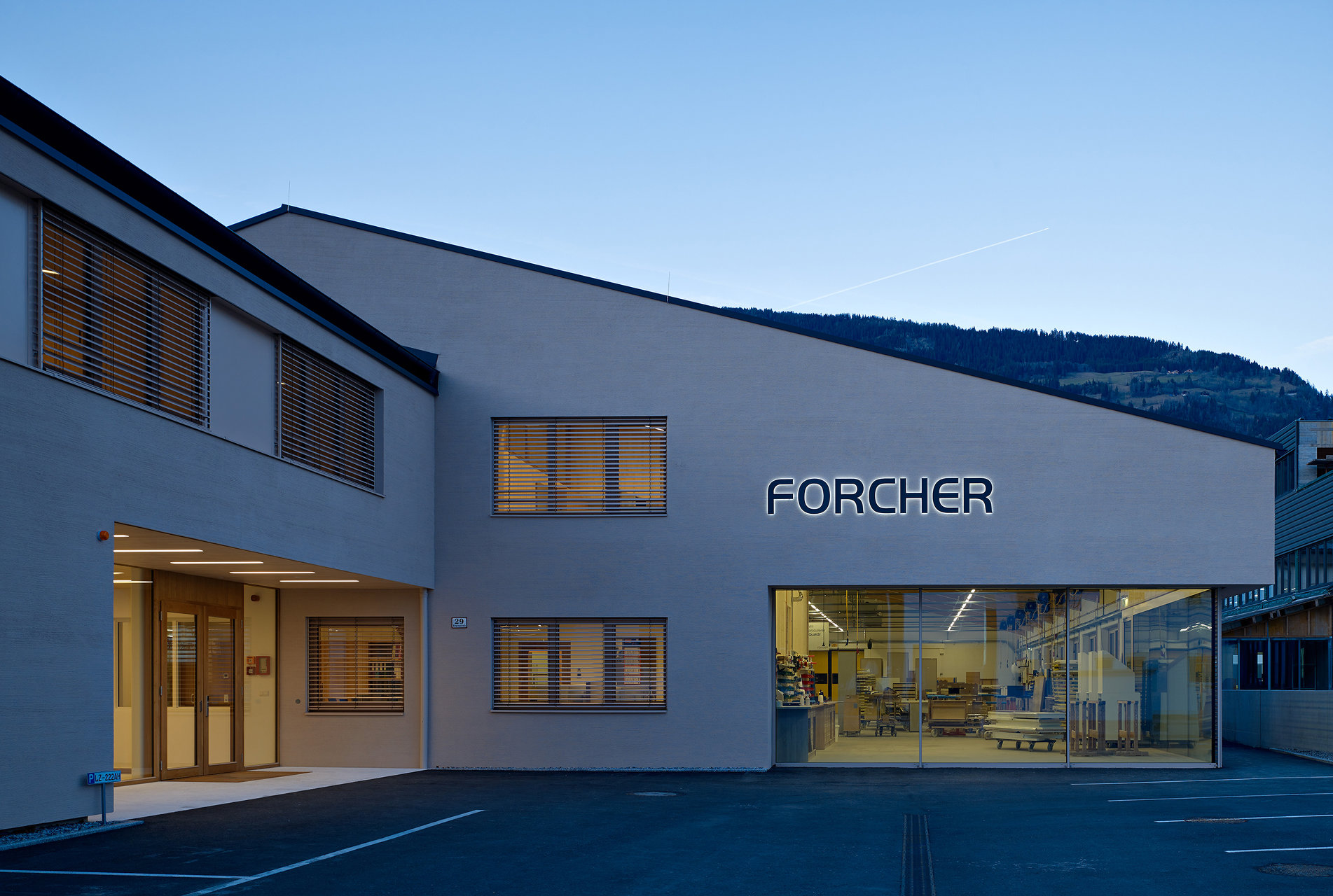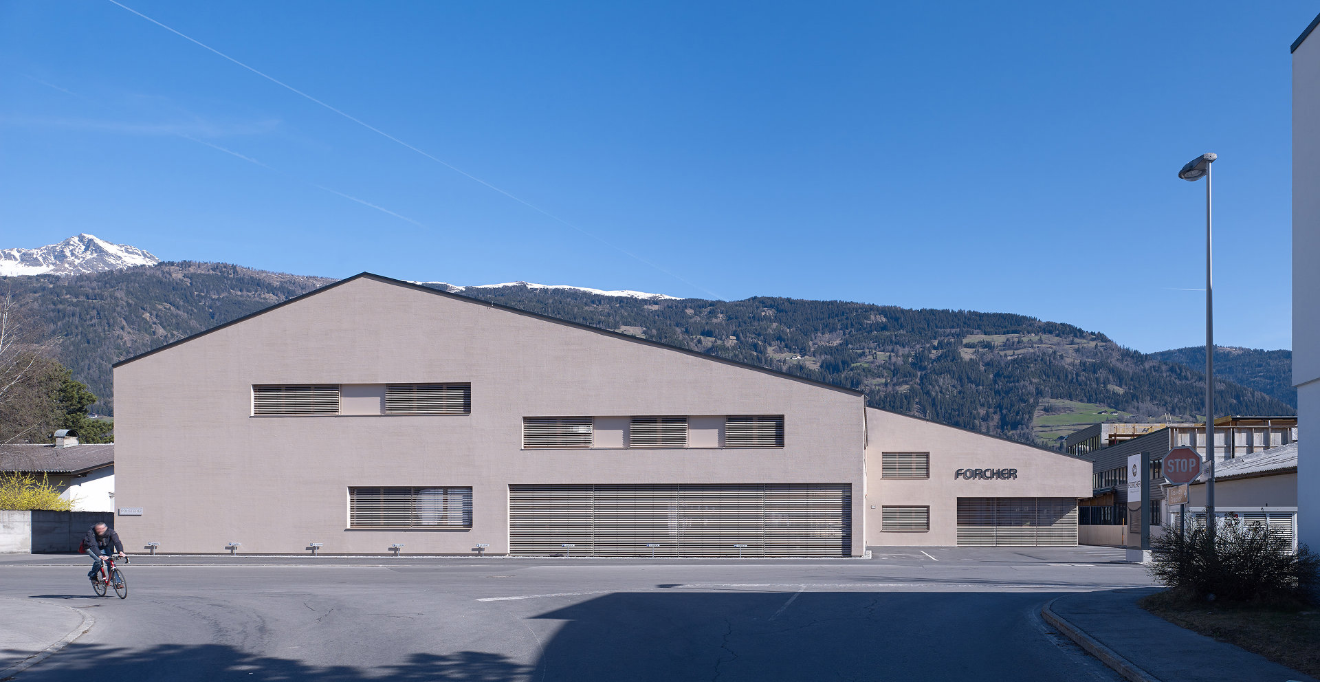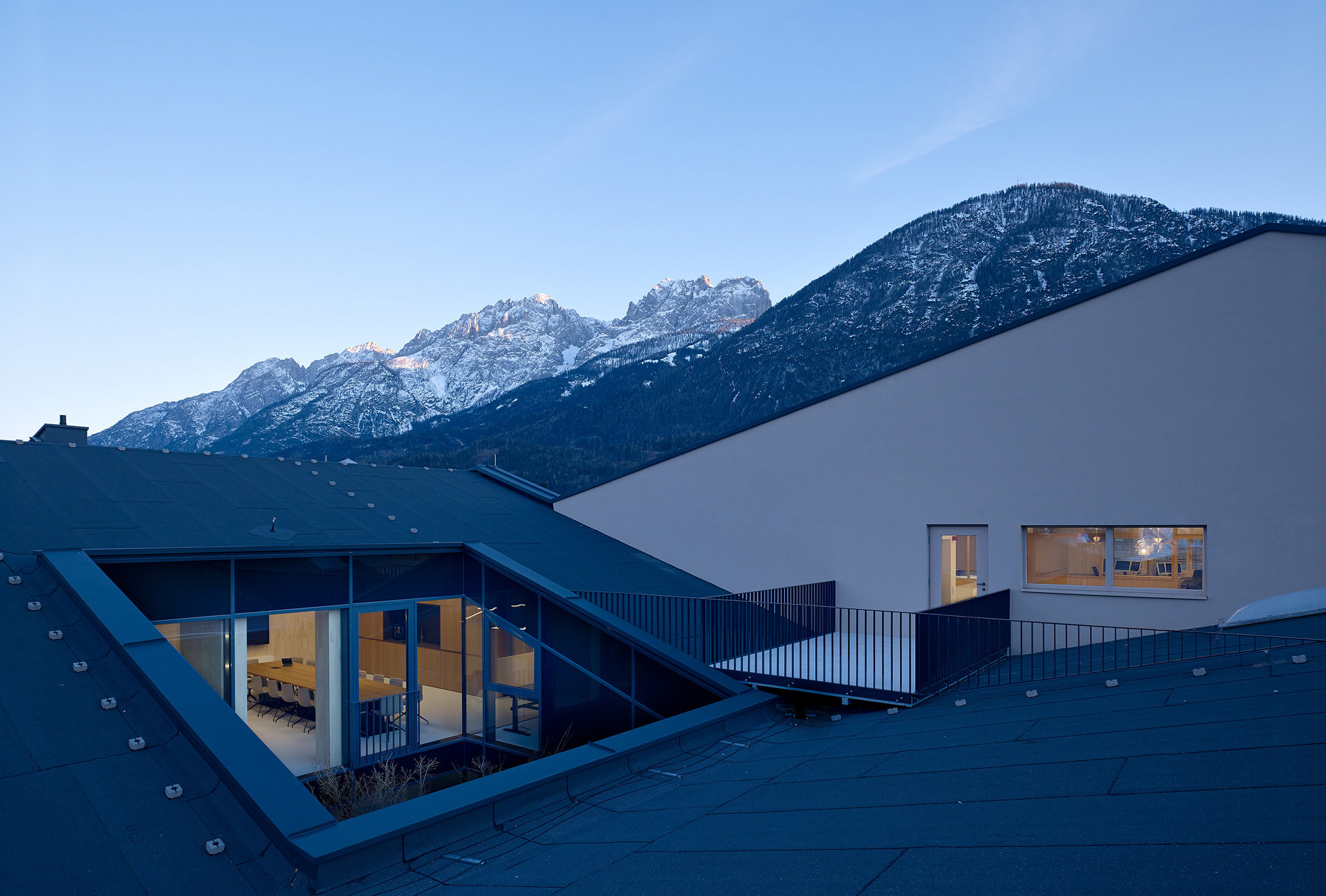 In der neuen Produktionshalle schafft die primäre Tragstruktur aus Leimbindern stützenlos Spannweiten bis zu dreißig Metern und gewährleistet damit eine flexible Nutzung. Der Konstruktionsraster folgt jener der angrenzenden Bestandshalle. Sowohl von der Werkhalle als auch von jedem Büroarbeitsplatz aus geben große Öffnungen den Blick nach Draußen auf das spektakuläre Bergmassiv der Dolomiten frei.