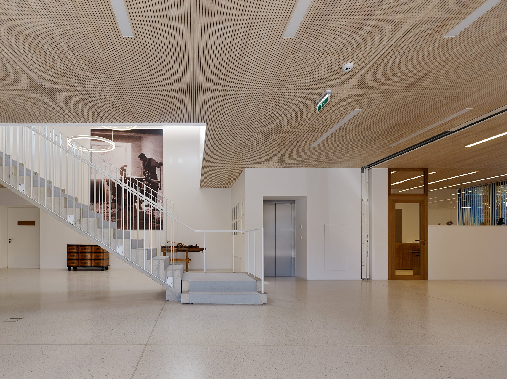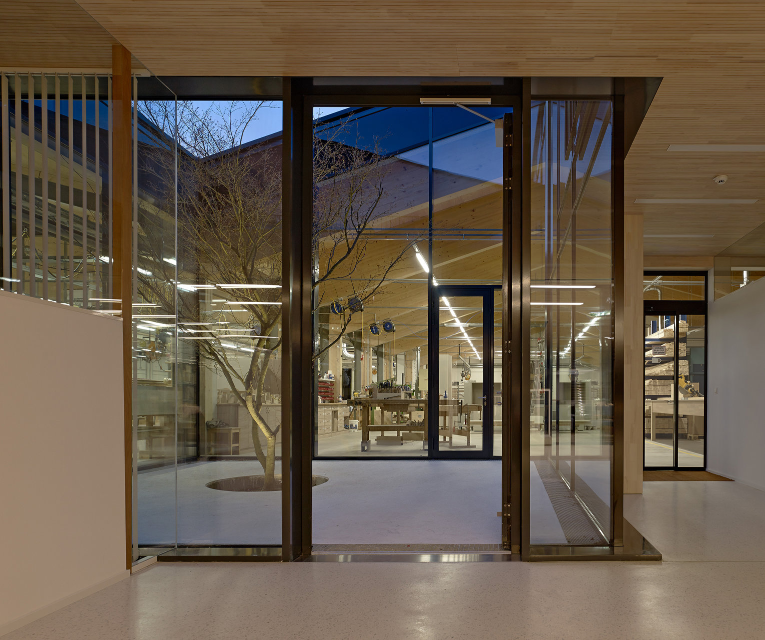 Man betritt das Gebäude durch ein lichtdurchflutetes Foyer, das zur Straße hin als Möbelausstellung fungiert. Weiße Wände, heller Terrazzoboden und eine Akustikdecke aus Weißtanne sind die Materialien. Als zentrales Element steckt ein vollverglaster Innenhof zwischen Bestandsgebäude, neuer Werkhalle und Foyer. Dieser schafft Sichtachsen zwischen Produktion, Büros und Schauraum und dient als Treffpunkt. In der Mitte des Innenhofs steht ein Schatten spendender Ahornbaum. Gleichzeitig symbolisiert er den nachwachsenden Rohstoff mit dem die Tischlerei täglich arbeitet.