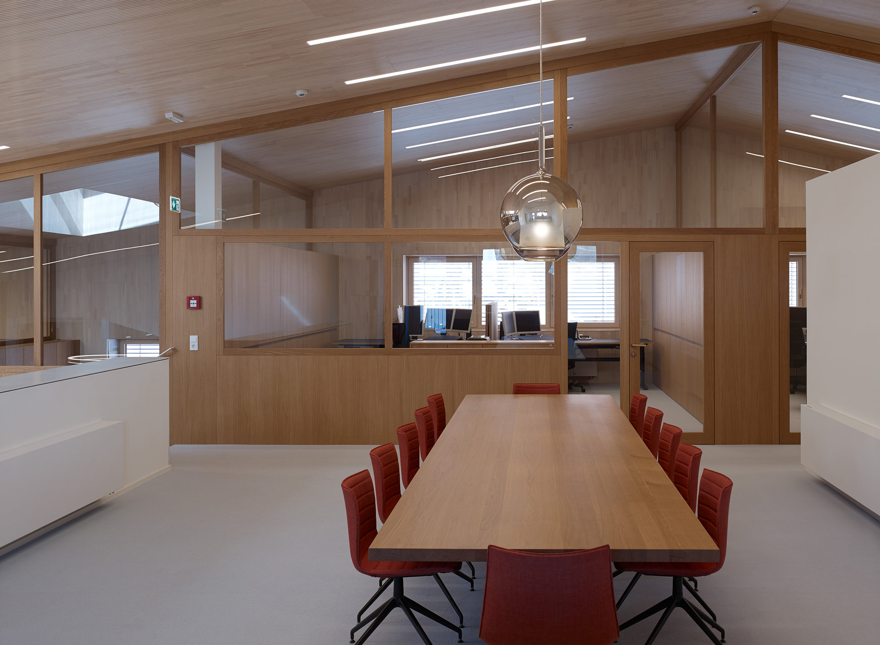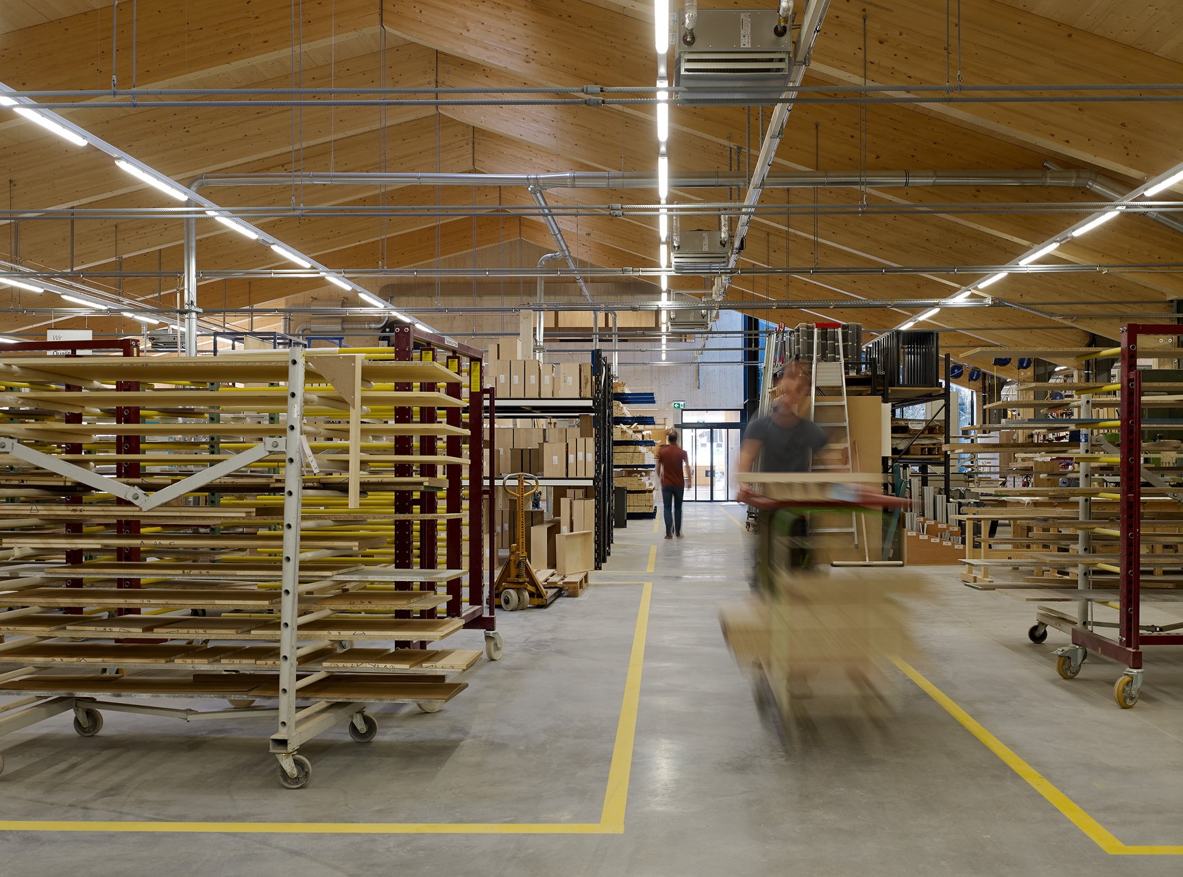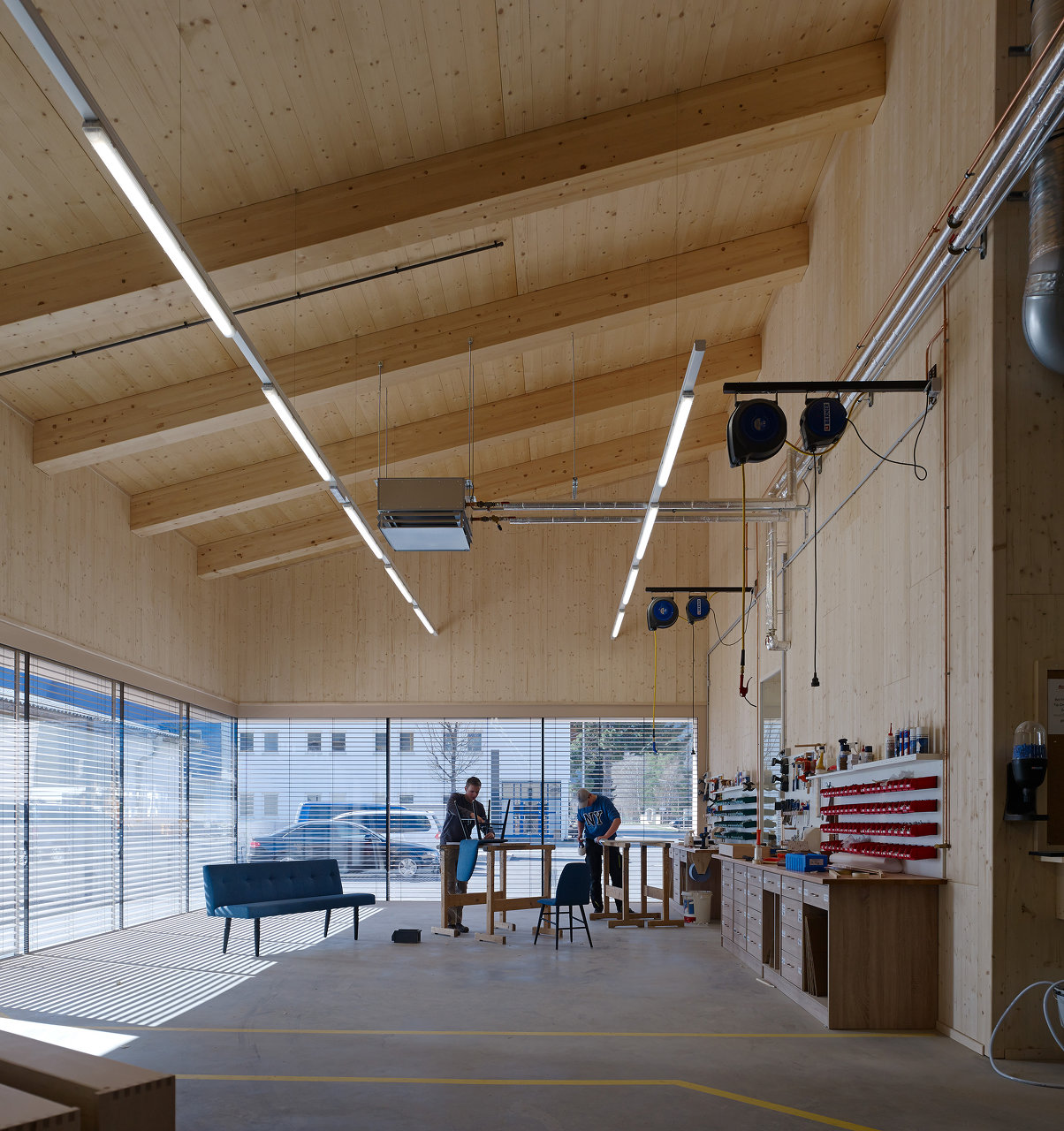 Alle Aspekte der Effizienz sind berücksichtigt. Den gesamten Innenausbau konnte die Tischlerei selbst herstellen, schwellenfrei sind alle Verbindungen der Arbeitsräume, die Außenflächen minimiert. Das Gebäude funktioniert energieautark und versorgt zudem ein benachbartes Unternehmen mit Fernwärme. (Text: Architektin, bearbeitet)