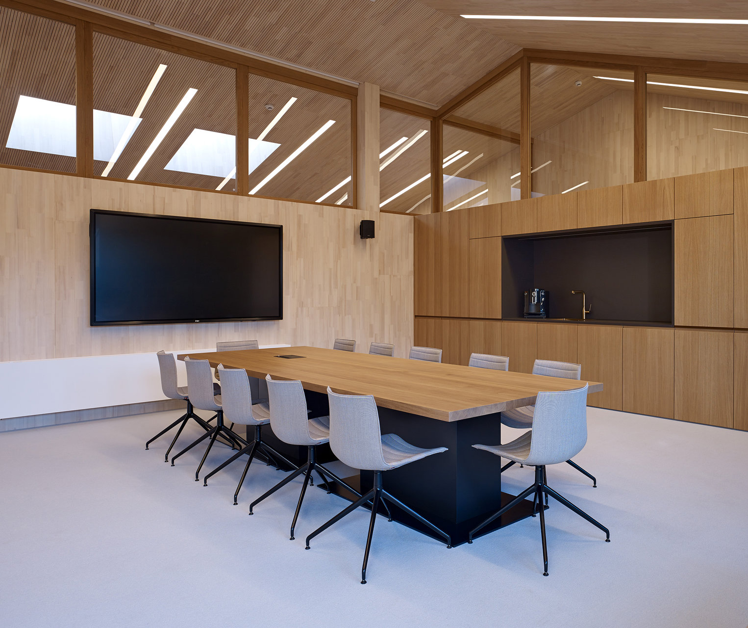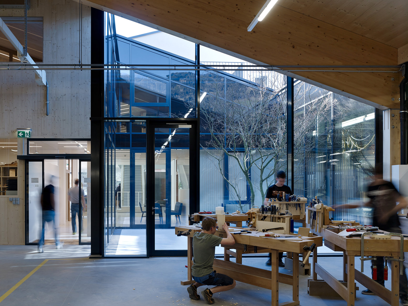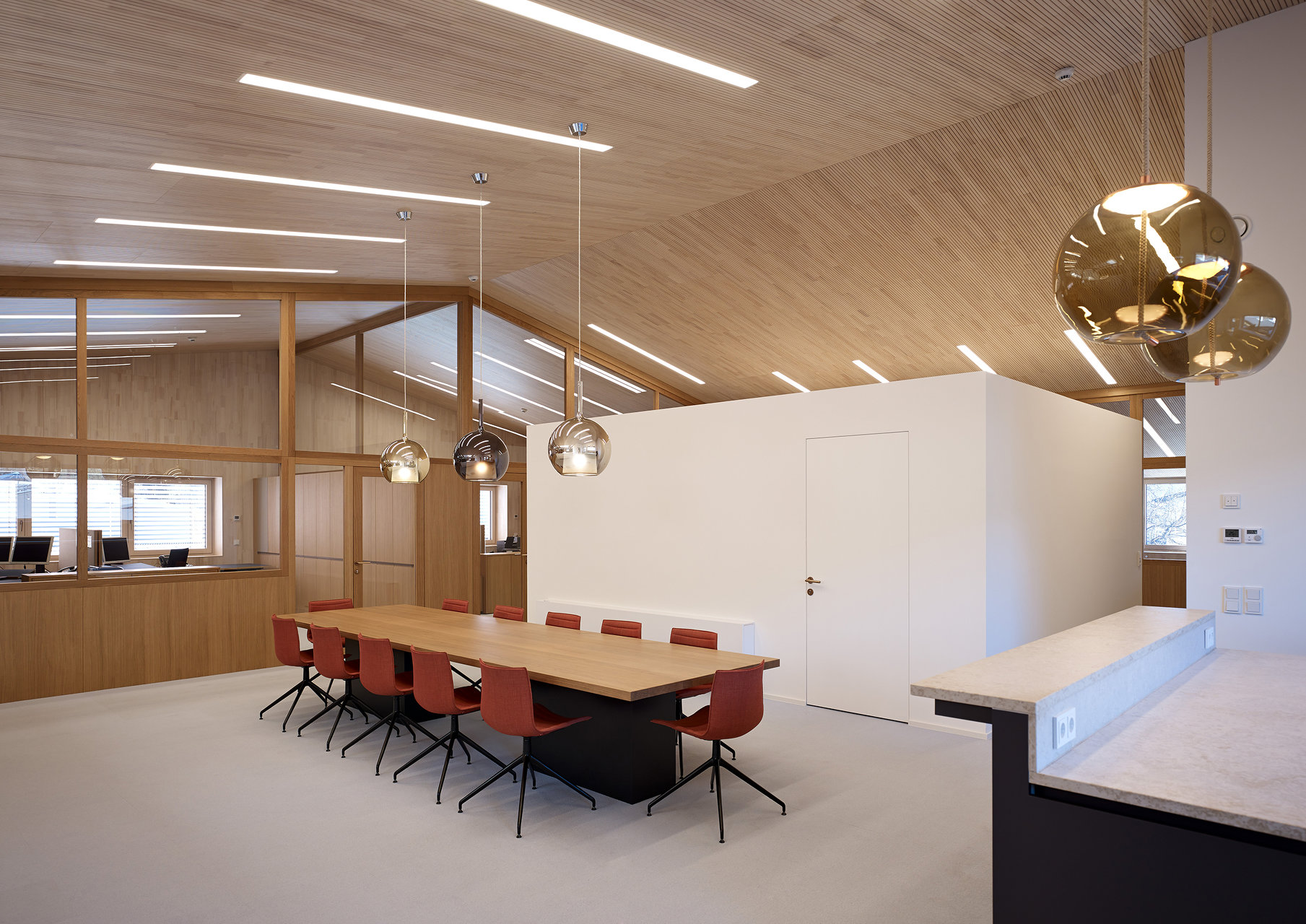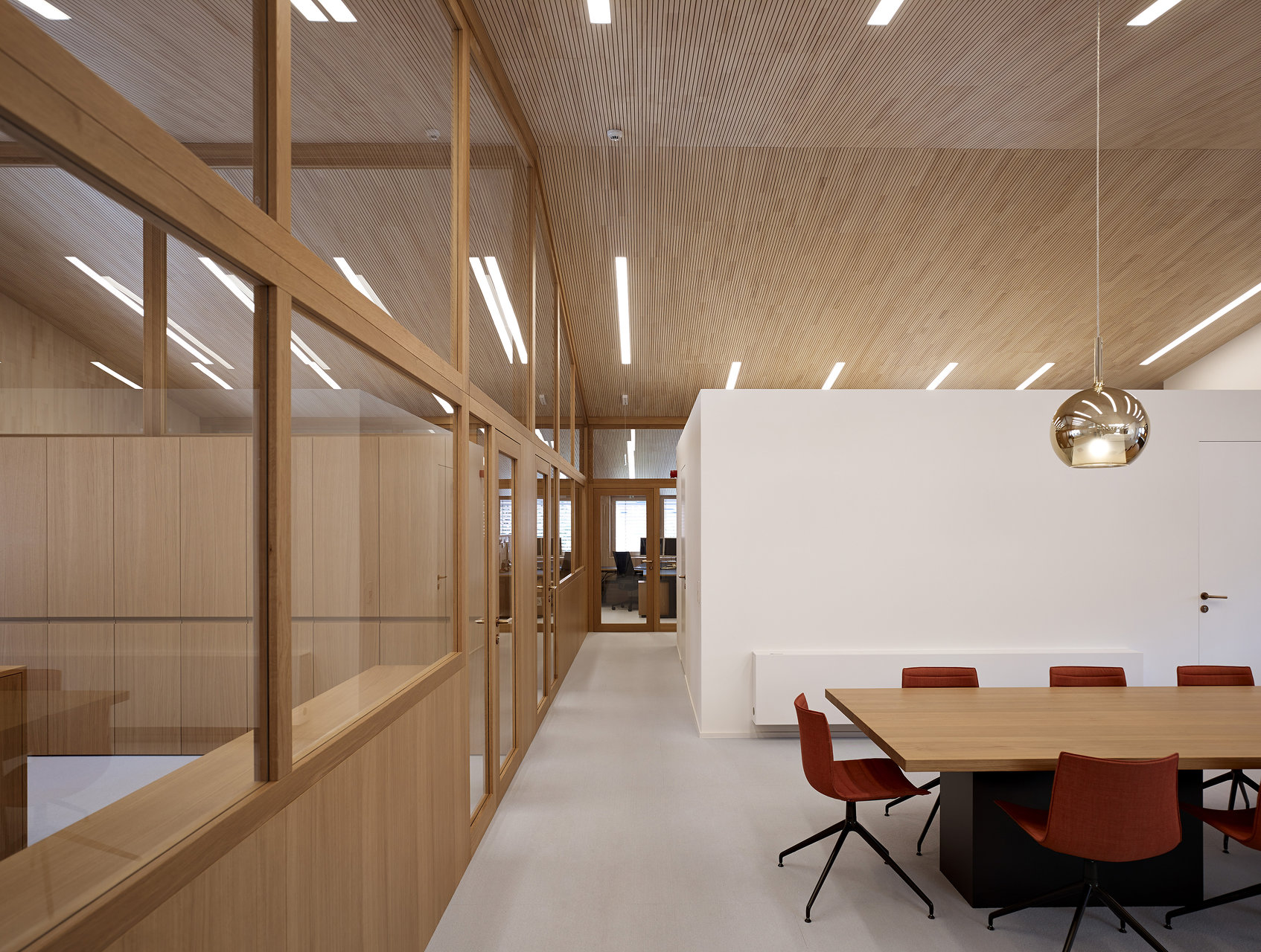 Alle Aspekte der Effizienz sind berücksichtigt. Den gesamten Innenausbau konnte die Tischlerei selbst herstellen, schwellenfrei sind alle Verbindungen der Arbeitsräume, die Außenflächen minimiert. Das Gebäude funktioniert energieautark und versorgt zudem ein benachbartes Unternehmen mit Fernwärme. (Text: Architektin, bearbeitet)
