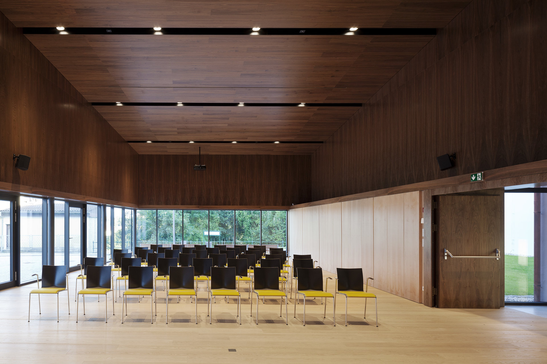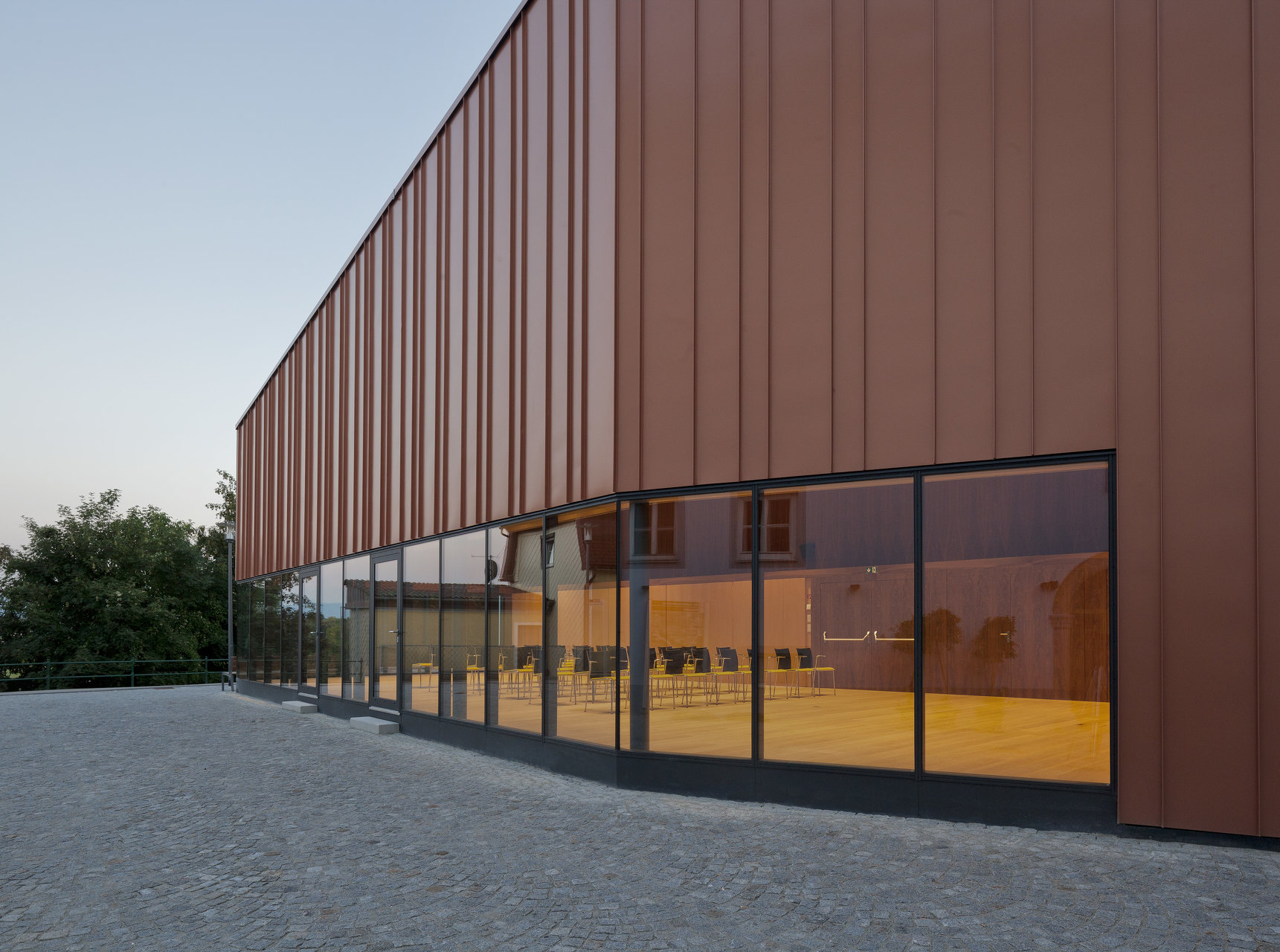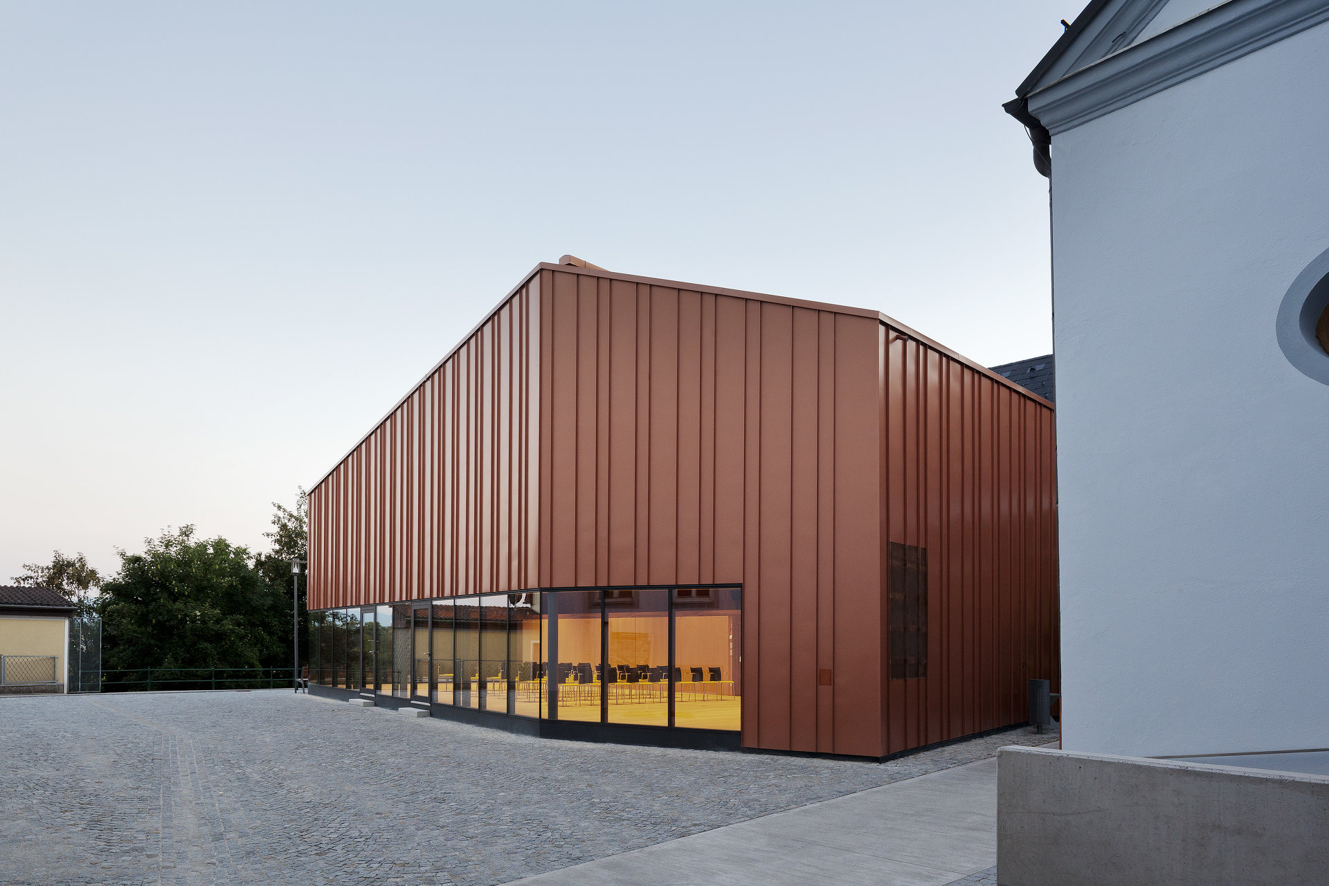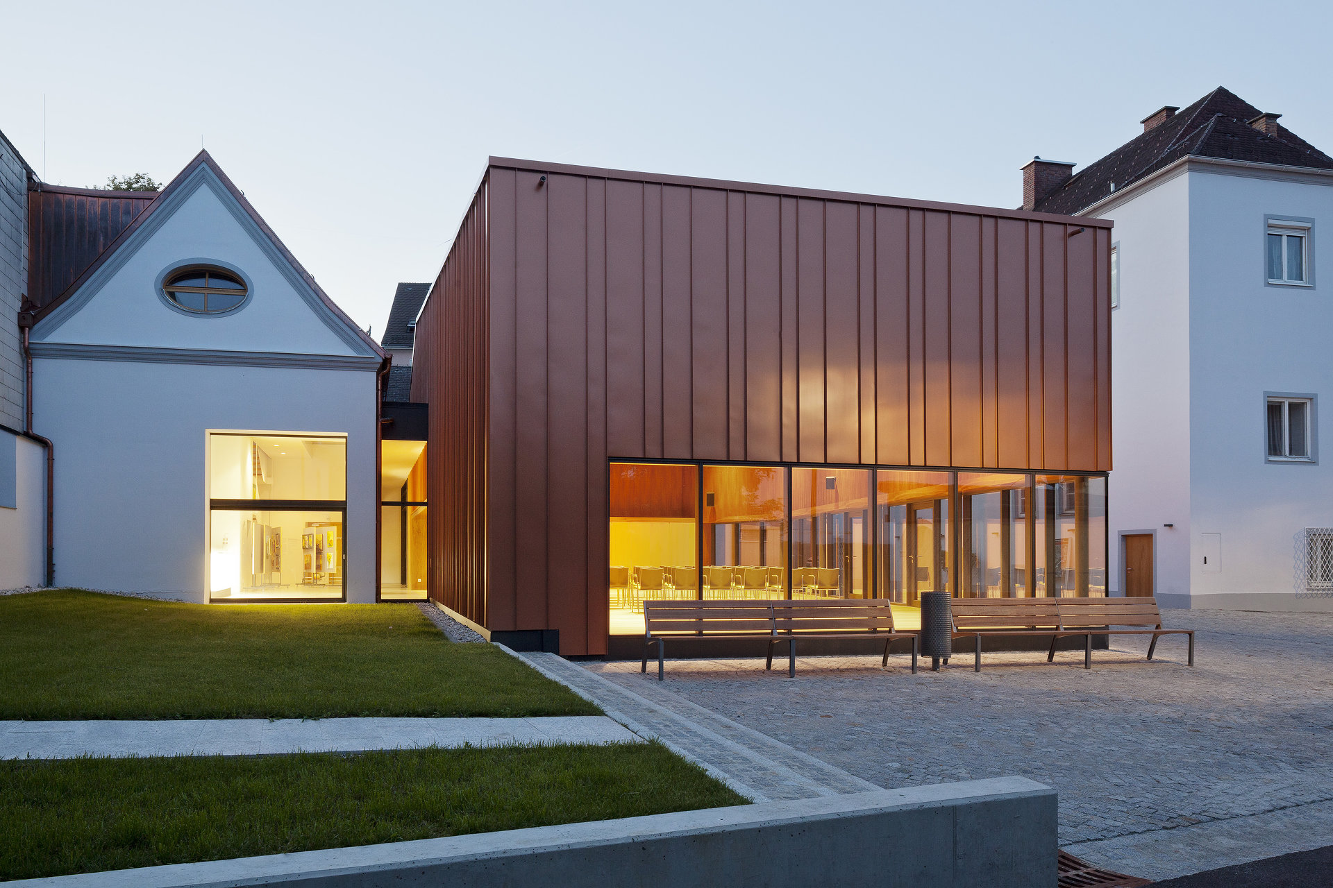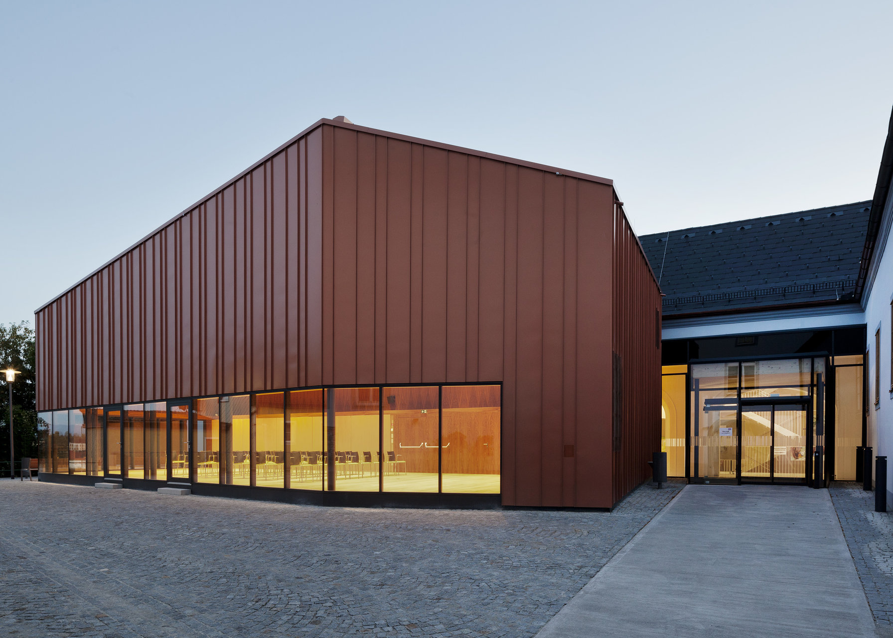 Dadurch wird der Platz zwischen Amtshaus und Rossstall zusammenhängend nutzbar. Die Grünfläche zur Nachbarschaft und Saal bzw. Foyer bleibt als Pufferzone erhalten. Der „Franzosenzaun“ wird teilweise als Fragment wieder aufgestellt. Im Sinne von Weiterbauen im vorhandenen Gefüge wird der Teil des Rossstalles als Foyer und Erschließungszone genutzt, mit neuer Stiegenanlage und Lift und einem Cateringbereich, der Gewölberaum wird ohne Einbauten belassen. Dazwischen wird der Saal als Baukörper in Holzriegelbauweise eingefügt, innen mit Holz ausgekleidet und außen mit bronzefarbenem Aluminium. Ein durchgängiges Fensterband ermöglicht Blickbeziehungen nach außen zum gepflasterten Platz. Im Untergeschoss sind noch entsprechend den Erfordernissen WC-Anlagen und Technikräume positioniert. (Text: Architekten, bearbitet)