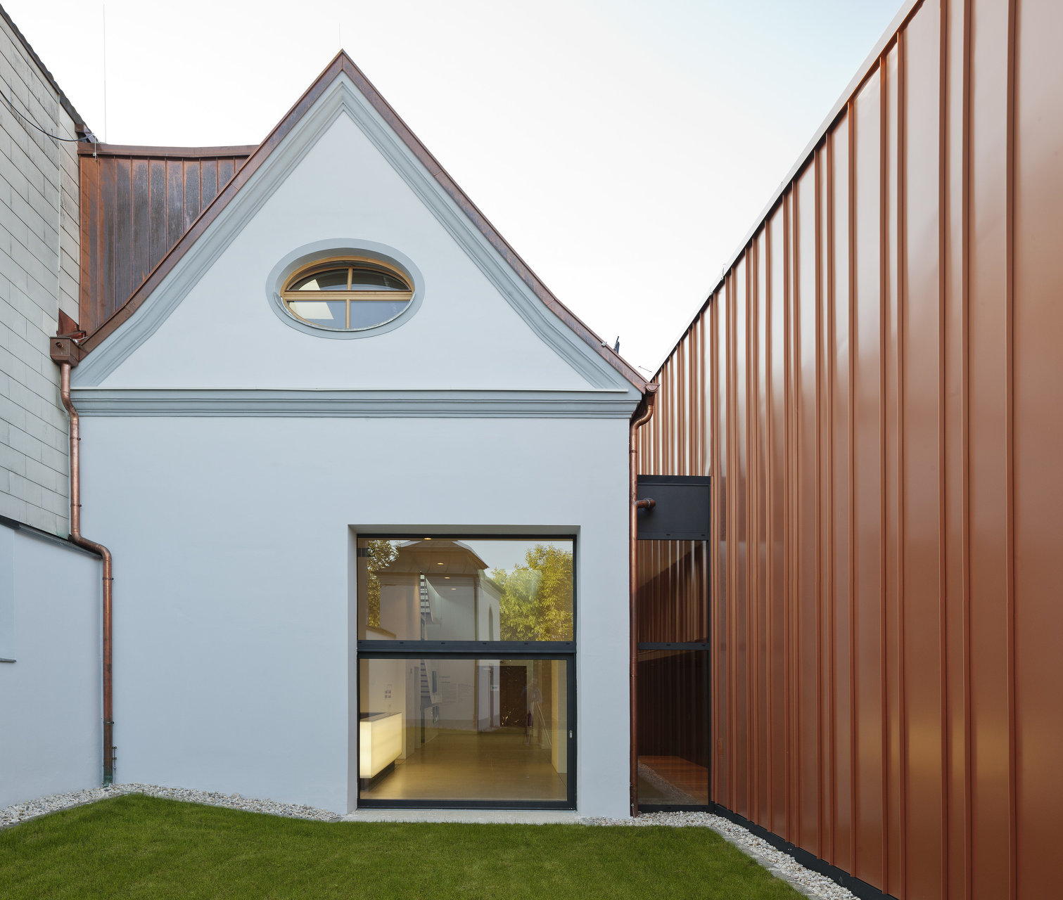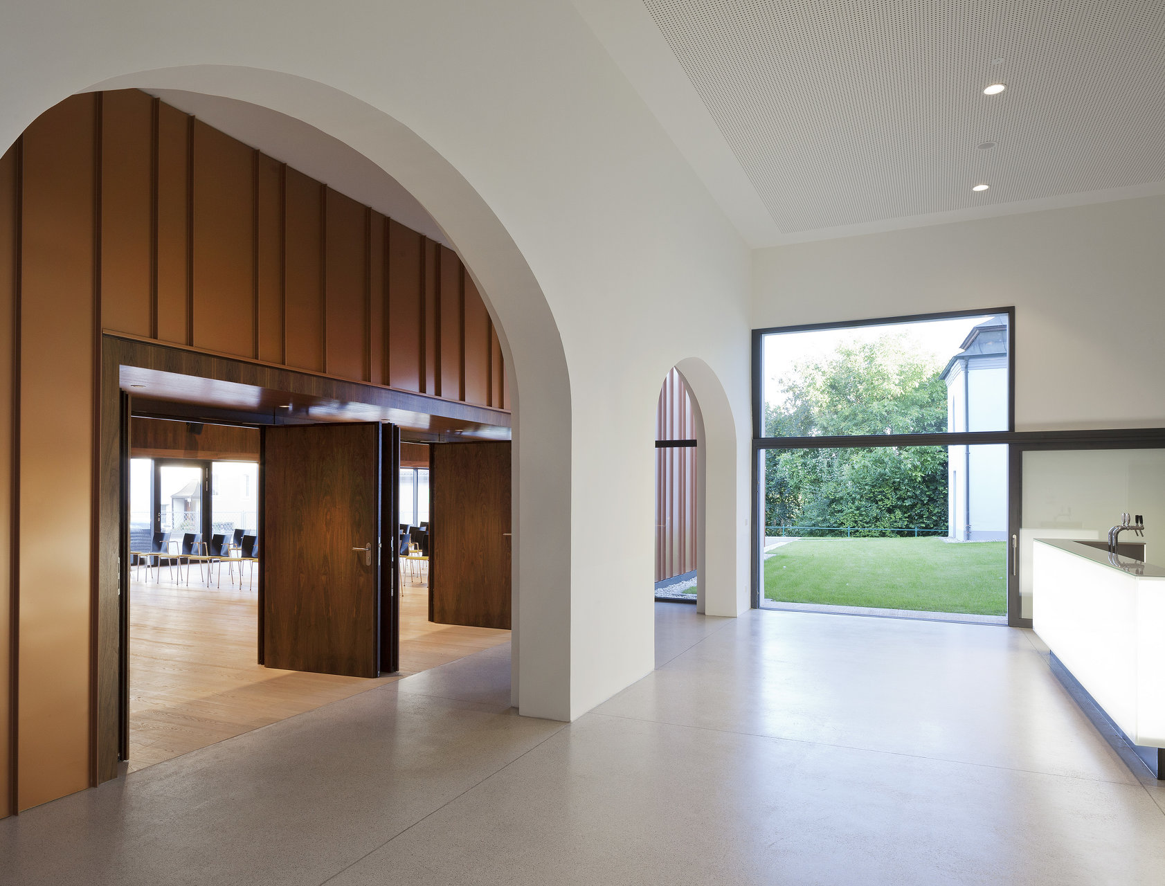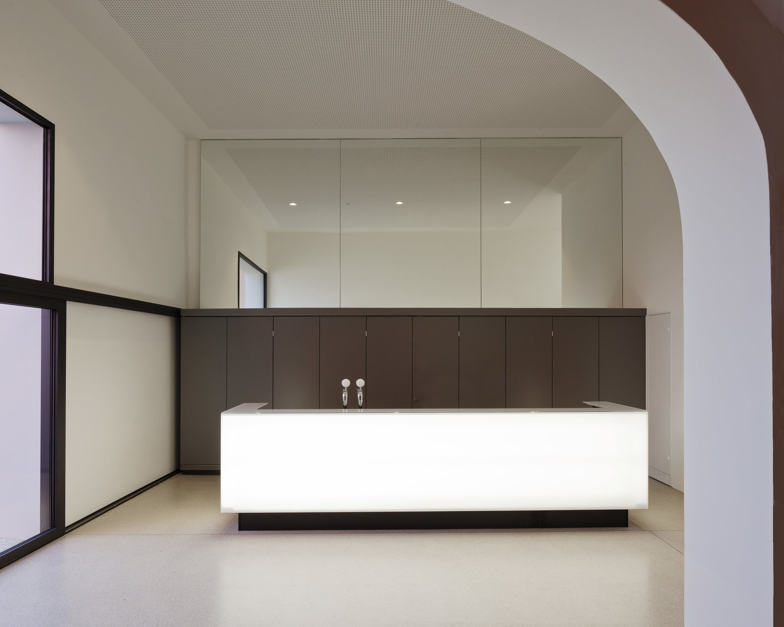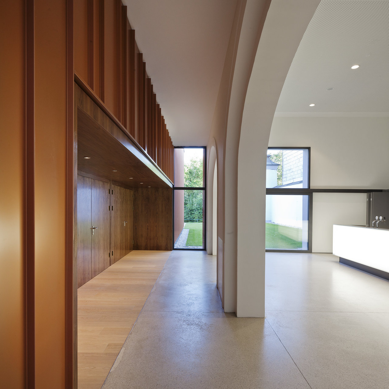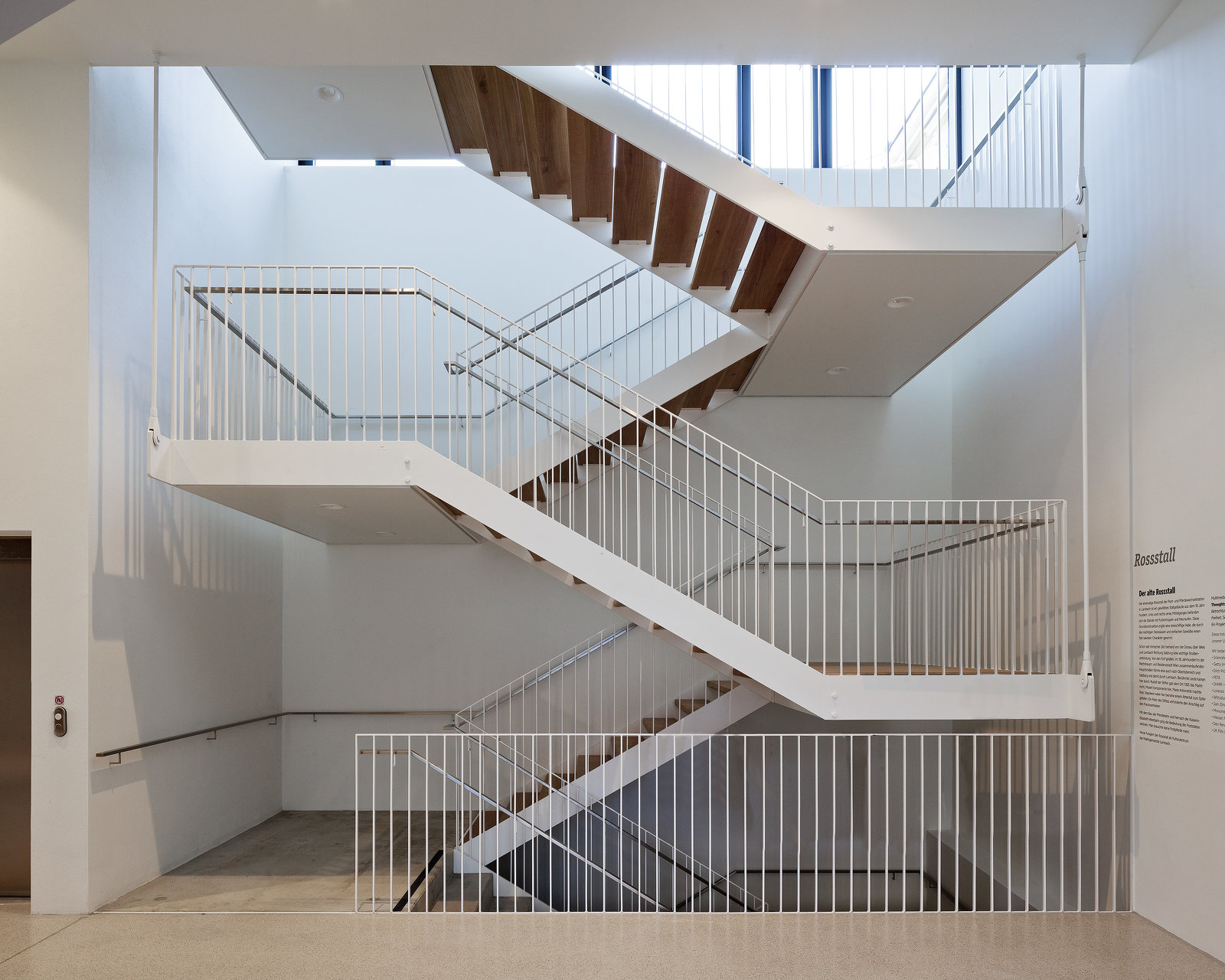 Dadurch wird der Platz zwischen Amtshaus und Rossstall zusammenhängend nutzbar. Die Grünfläche zur Nachbarschaft und Saal bzw. Foyer bleibt als Pufferzone erhalten. Der „Franzosenzaun“ wird teilweise als Fragment wieder aufgestellt. Im Sinne von Weiterbauen im vorhandenen Gefüge wird der Teil des Rossstalles als Foyer und Erschließungszone genutzt, mit neuer Stiegenanlage und Lift und einem Cateringbereich, der Gewölberaum wird ohne Einbauten belassen. Dazwischen wird der Saal als Baukörper in Holzriegelbauweise eingefügt, innen mit Holz ausgekleidet und außen mit bronzefarbenem Aluminium. Ein durchgängiges Fensterband ermöglicht Blickbeziehungen nach außen zum gepflasterten Platz. Im Untergeschoss sind noch entsprechend den Erfordernissen WC-Anlagen und Technikräume positioniert. (Text: Architekten, bearbitet)