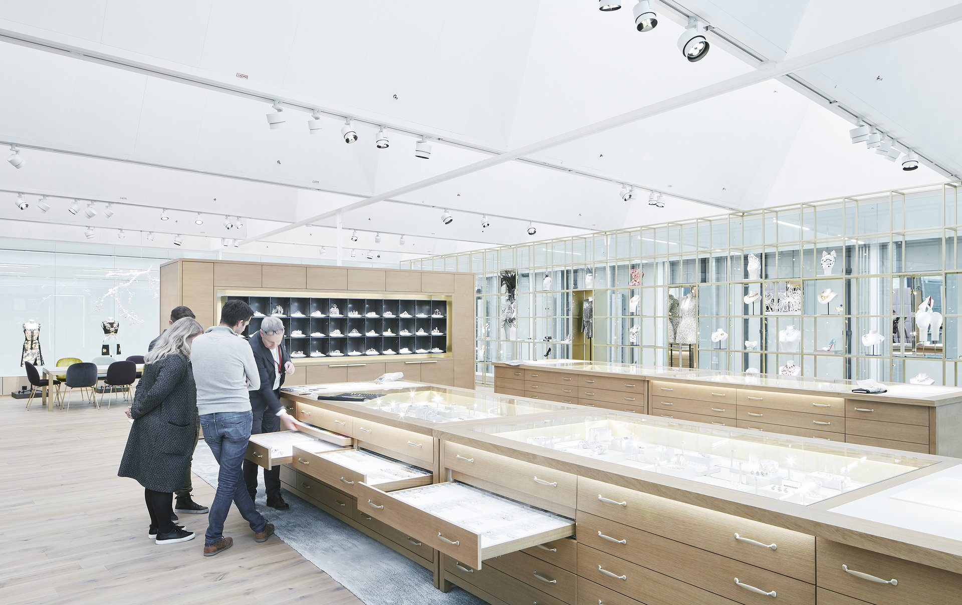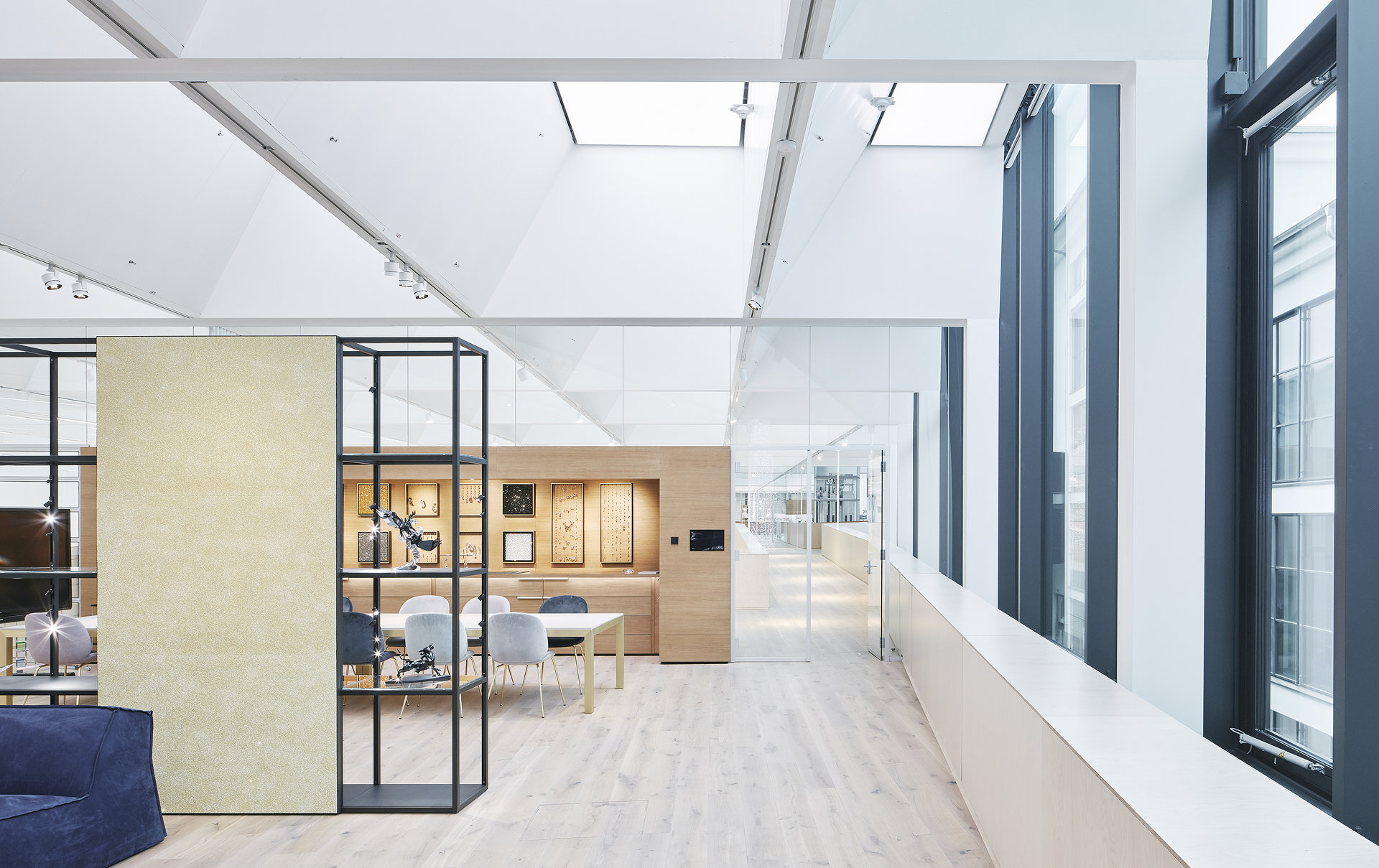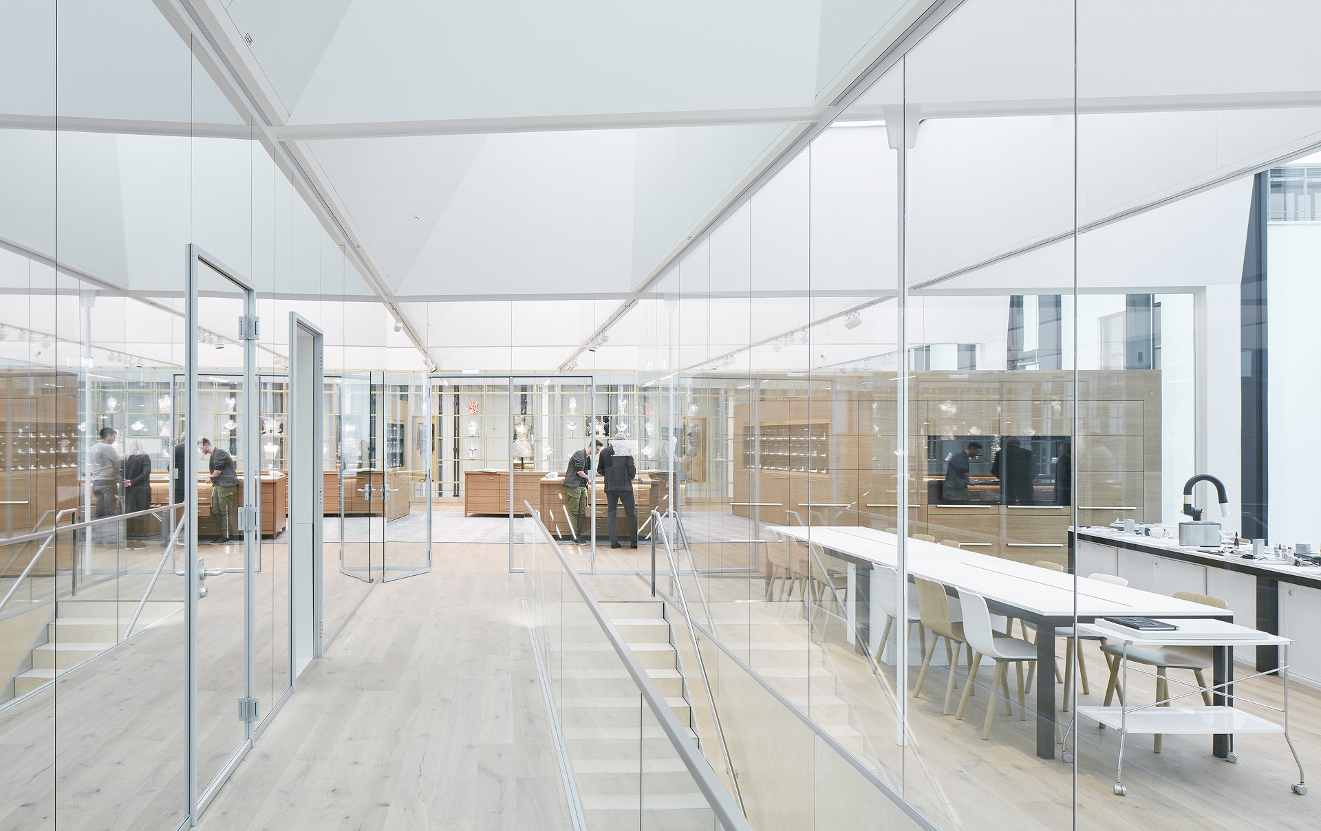 Die Manufaktur ist also in erster Linie ein Ort für innovative Kooperationen. Als Bühne für unterschiedliche Aktivitäten schafft sie Möglichkeitsräume für kreativen Austausch, für die rasche Umsetzung von Ideen und auch für unerwartete Begegnungen. Deswegen fokussiert der Entwurf nicht auf die Produktionsprozesse, die zentraler Bestandteil der Manufaktur sind, sondern auf die Atmosphäre und den Raum. Snøhetta verzichtete bewusst auf eine formale Interpretation kristalliner Formen. Vielmehr ging es um ein Spiel mit den ephemeren Qualitäten, die Kristall zum Funkeln bringen - also um die Inszenierung von Tageslicht.