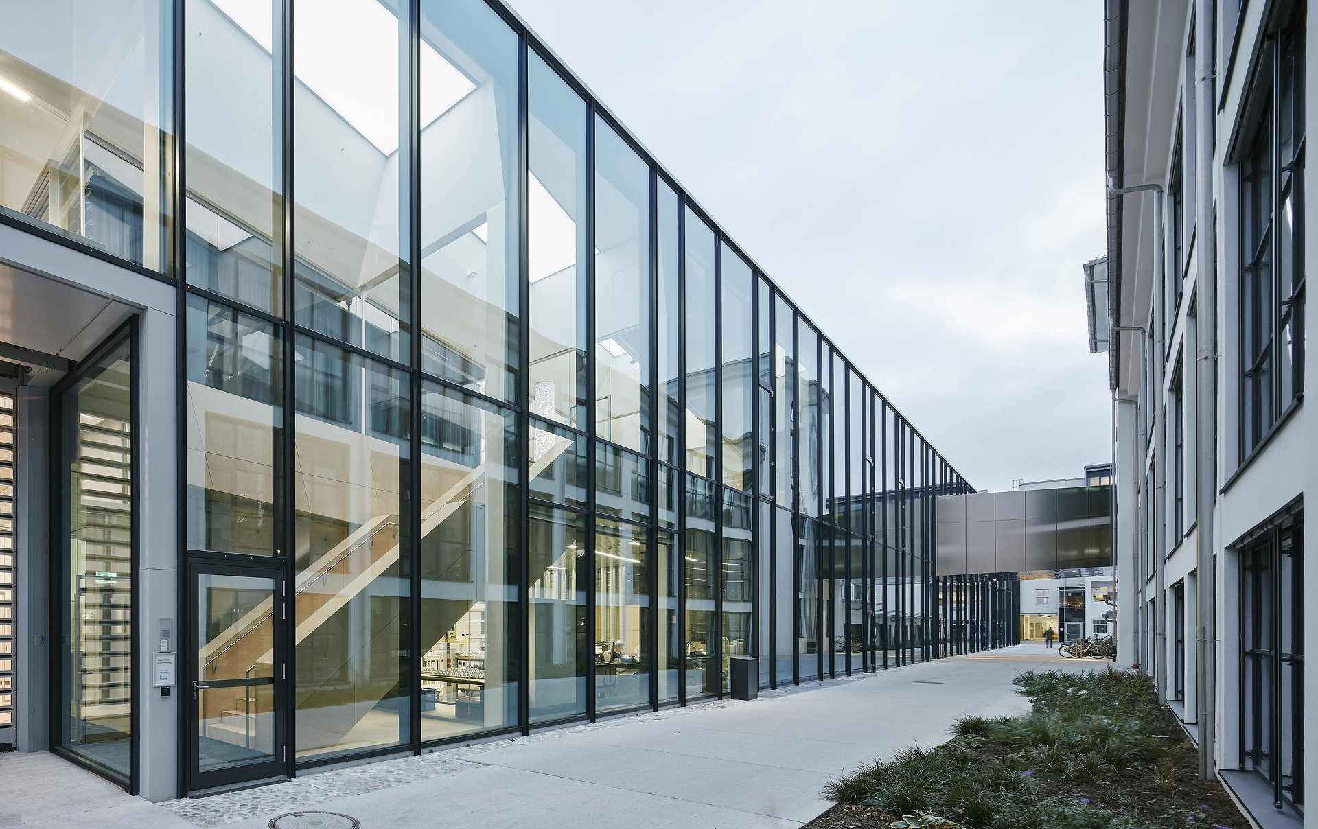 In der Halle befinden sich alle Maschinen, die für den Produktionsprozess der Kristallerzeugung notwendig sind, um Prototypen oder Kleinserien in kürzester Zeit anfertigen zu können. Der gesamte Prozess wird also in kleinem Maßstab nachgebildet. Ändern sich die technischen Standards oder Vorgaben, bietet die flexible Halle genügend Platz, die Produktionsprozesse nach dem neusten Stand der Technik zu arrangieren. Ein Doppelboden bietet genügend Flexibilität für die notwendigen Anschlüsse und Leitungen. Für den Aufbau von besonders großen Prototypen steht das so genannte „Luster-Loch“ zur Verfügung. Dort öffnet sich die Halle ins Untergeschoss und ermöglicht, bis zu 14 Meter hohe Werkstücke vor Ort aufzubauen und zu testen. (Text: Architekten)