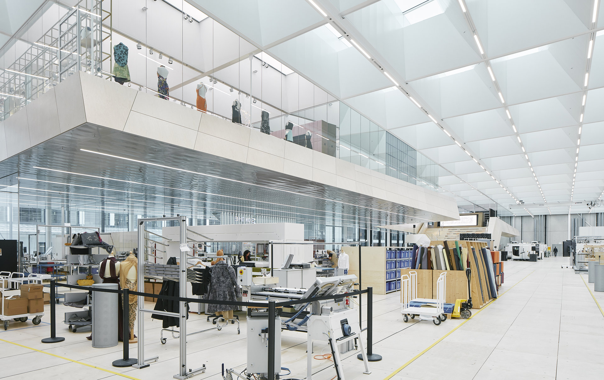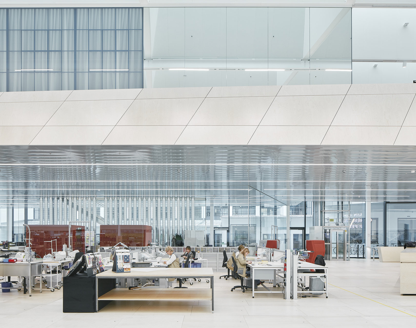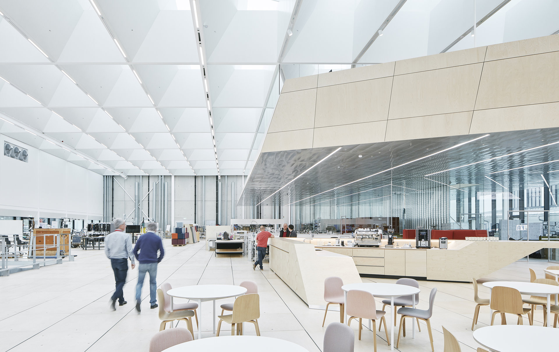 Die helle, freundliche Atmosphäre der Halle wird durch die Materialwahl unterstützt. Neben weißen Wänden bedecken helle Birkenholzplatten den Boden und verkleiden eine skulpturale Galerie, die einen Überblick auf die großzügige Halle gewährt. Über die von der Decke abgehängte Holzplattform gelangt man dann über eine große Freitreppe, die auch als Treffpunkt und Arena dient, in die Halle. In diesem skulpturalen, tribünenartigen Einbau sind auch Büros sowie Schau- und Präsentationsräume integriert. In diesen Räumen, die von Glaswänden begrenzt werden, dominieren Materialien wie Eichenholz, Messing, buntes Glas und verschiedene Textilien. Neben der Treppe dient auch ein Café als Treffpunkt. Von außen ist das neue Gebäude kaum sichtbar, da es sich nahtlos in den Bestand auf dem Werksgelände fügt.