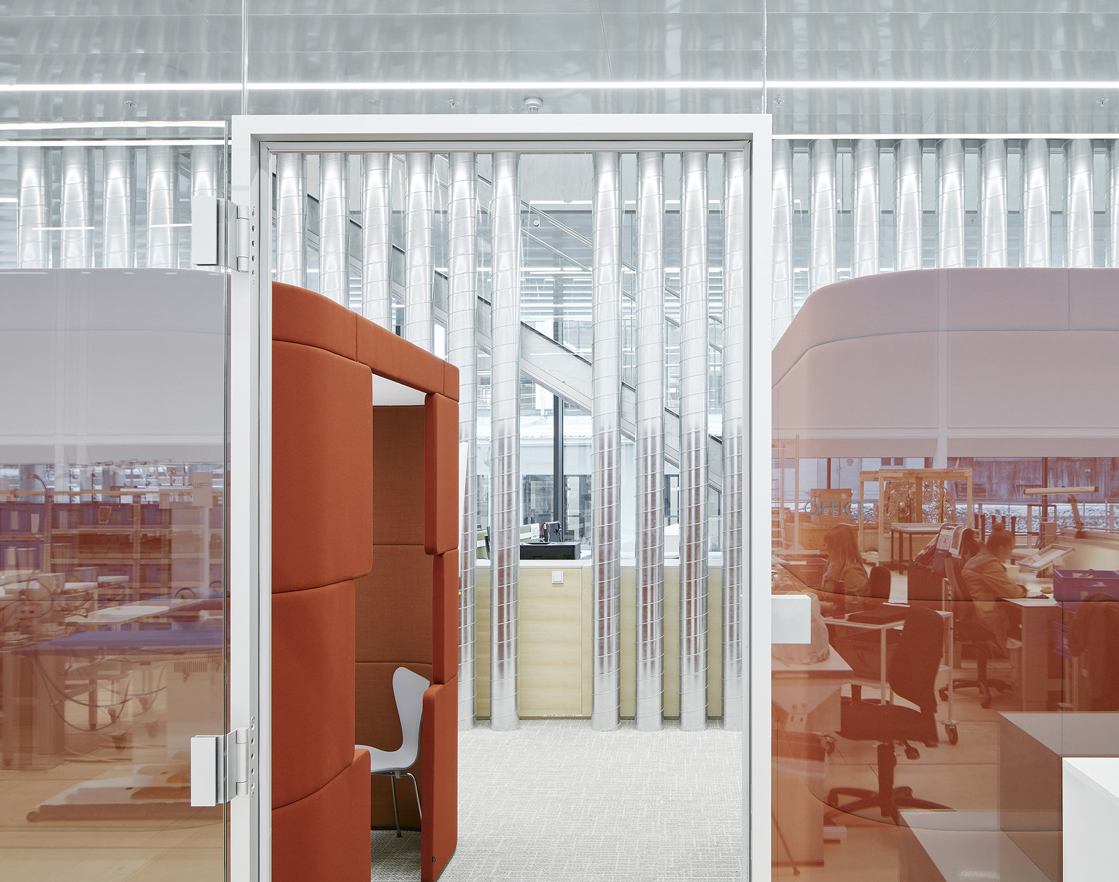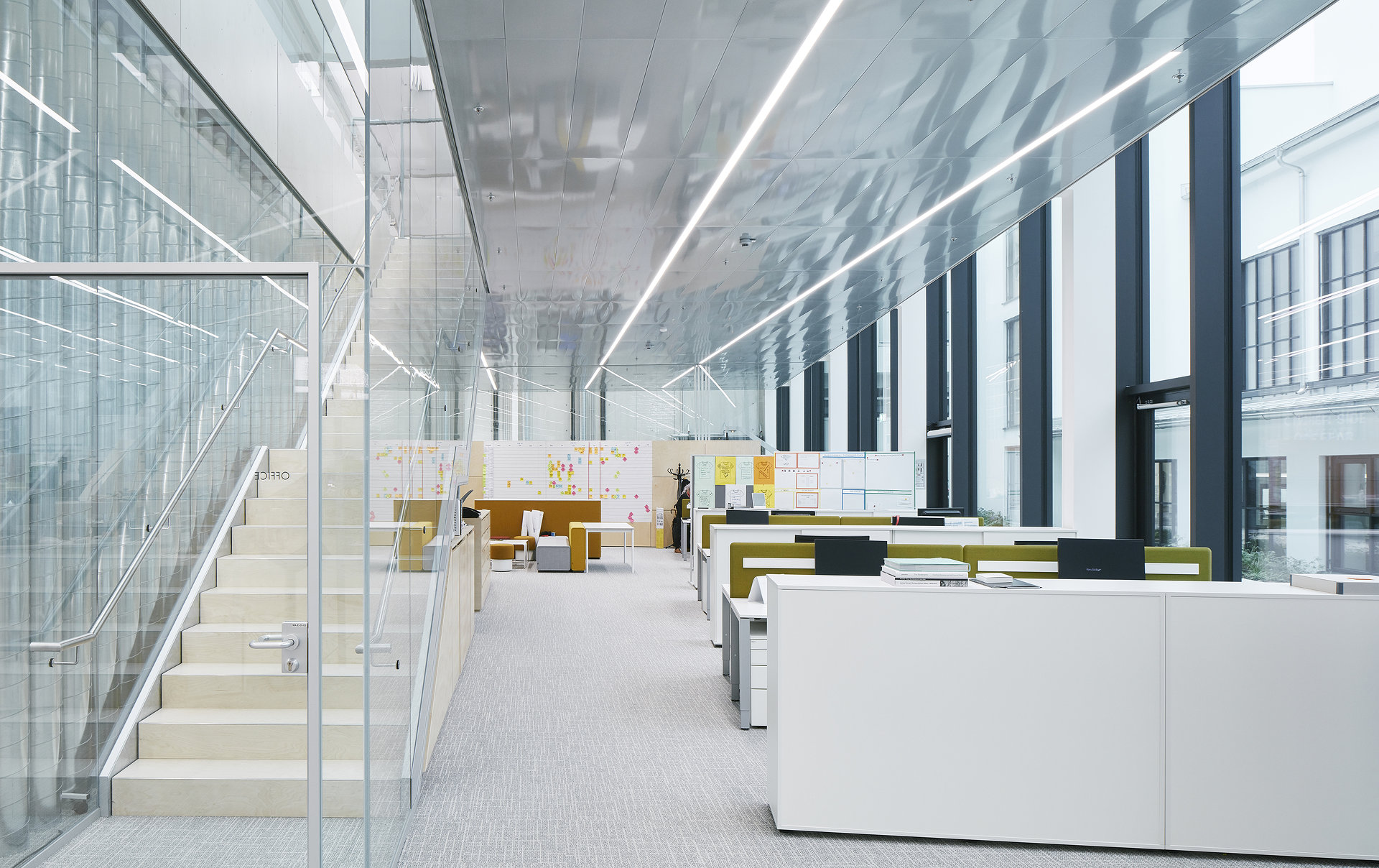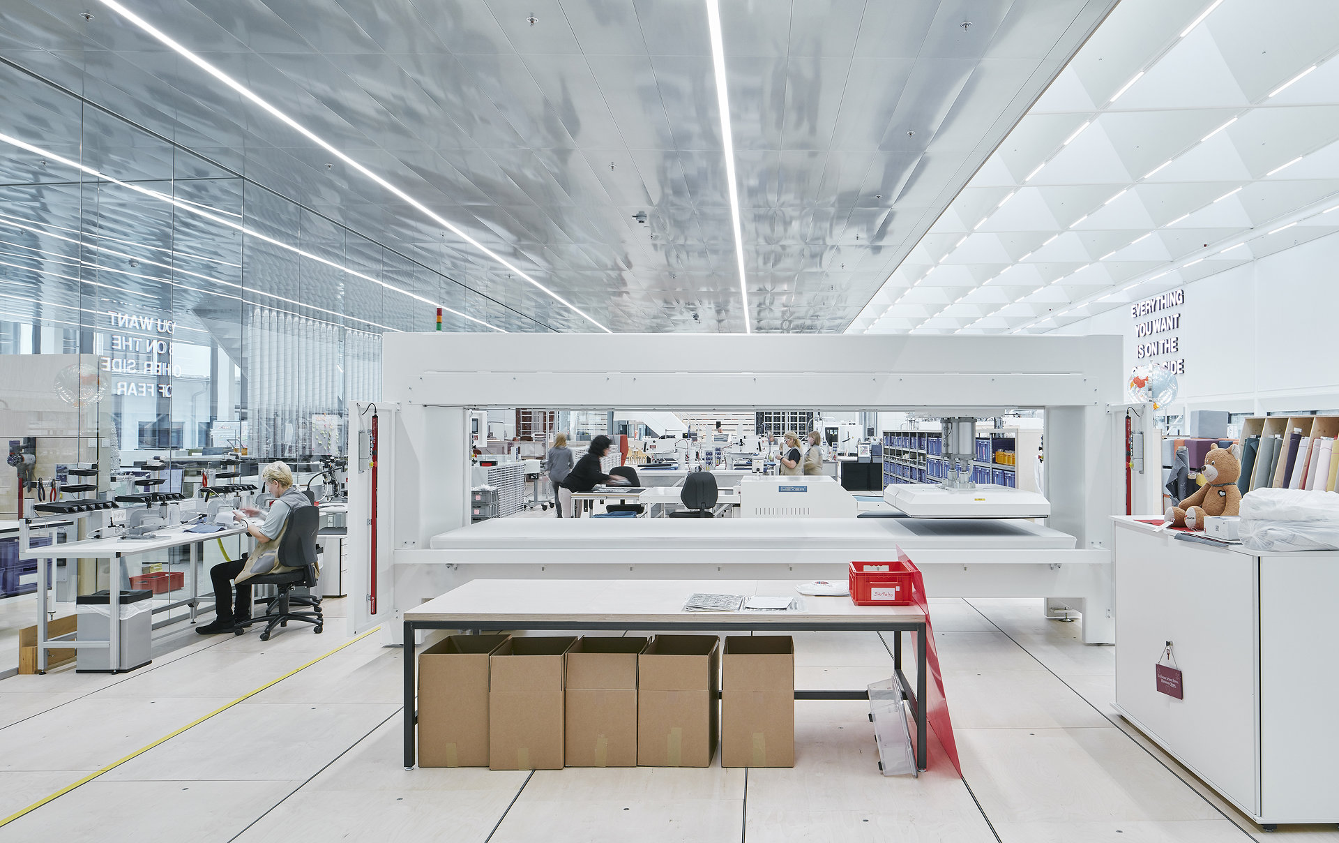 Die helle, freundliche Atmosphäre der Halle wird durch die Materialwahl unterstützt. Neben weißen Wänden bedecken helle Birkenholzplatten den Boden und verkleiden eine skulpturale Galerie, die einen Überblick auf die großzügige Halle gewährt. Über die von der Decke abgehängte Holzplattform gelangt man dann über eine große Freitreppe, die auch als Treffpunkt und Arena dient, in die Halle. In diesem skulpturalen, tribünenartigen Einbau sind auch Büros sowie Schau- und Präsentationsräume integriert. In diesen Räumen, die von Glaswänden begrenzt werden, dominieren Materialien wie Eichenholz, Messing, buntes Glas und verschiedene Textilien. Neben der Treppe dient auch ein Café als Treffpunkt. Von außen ist das neue Gebäude kaum sichtbar, da es sich nahtlos in den Bestand auf dem Werksgelände fügt.