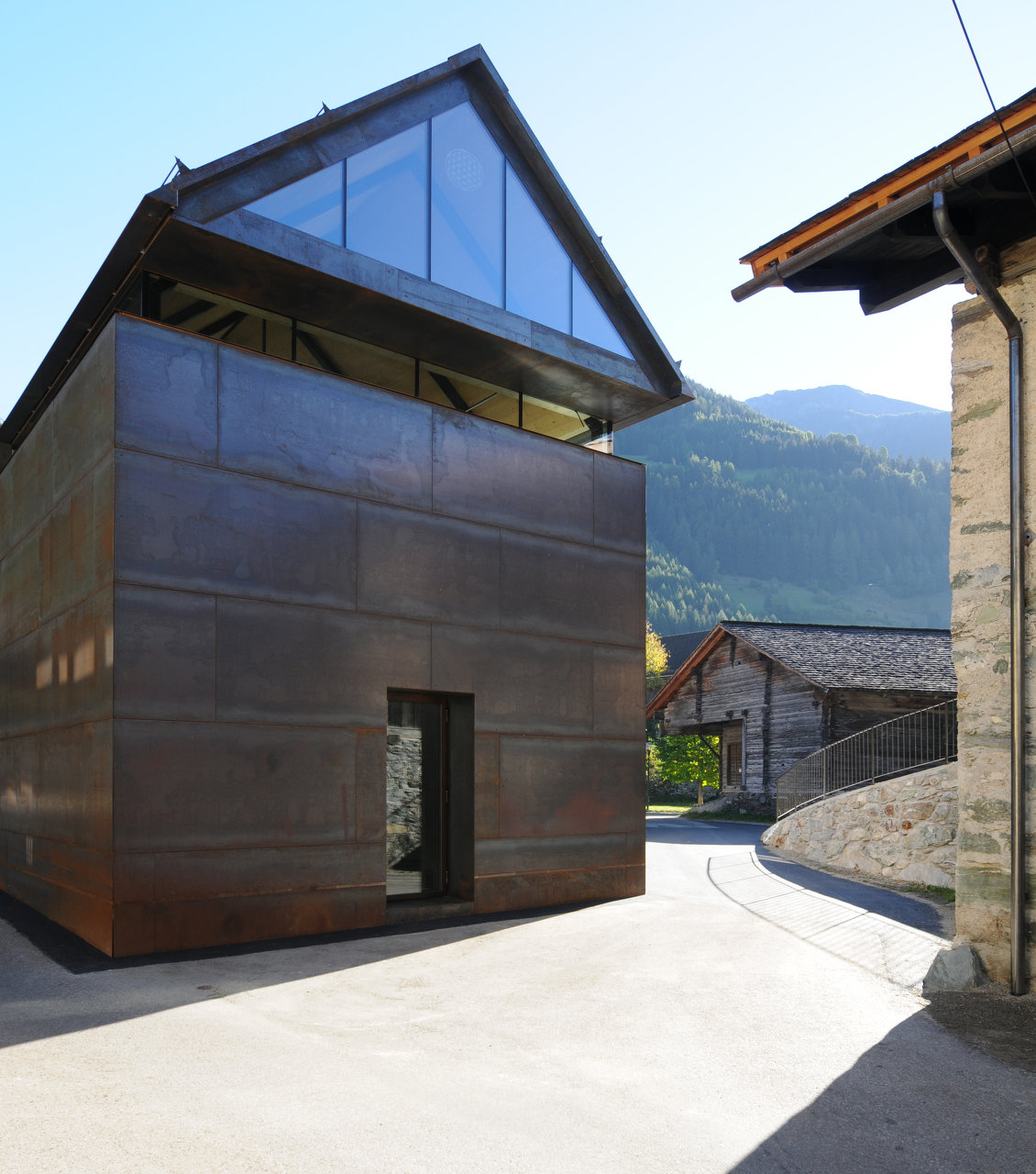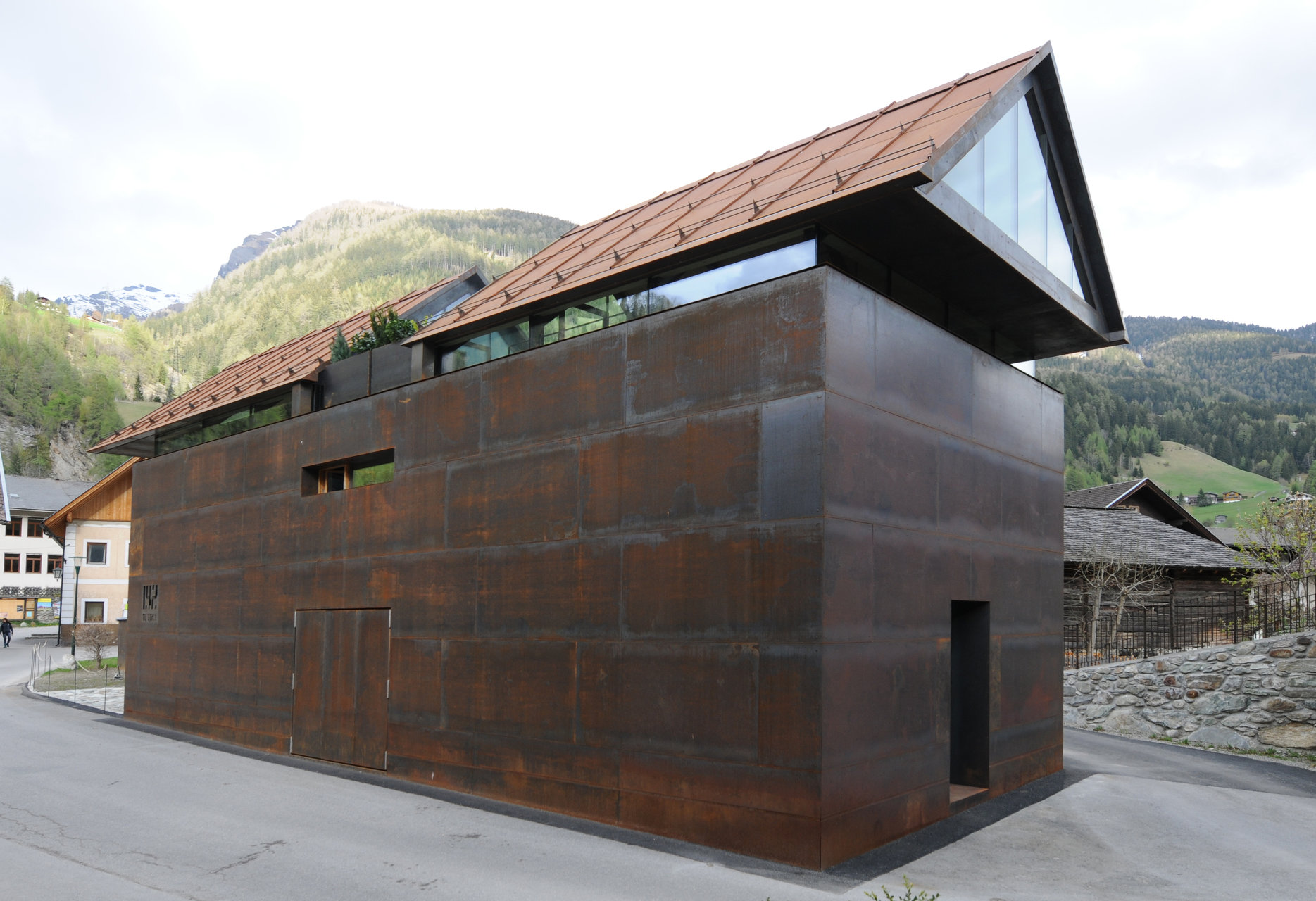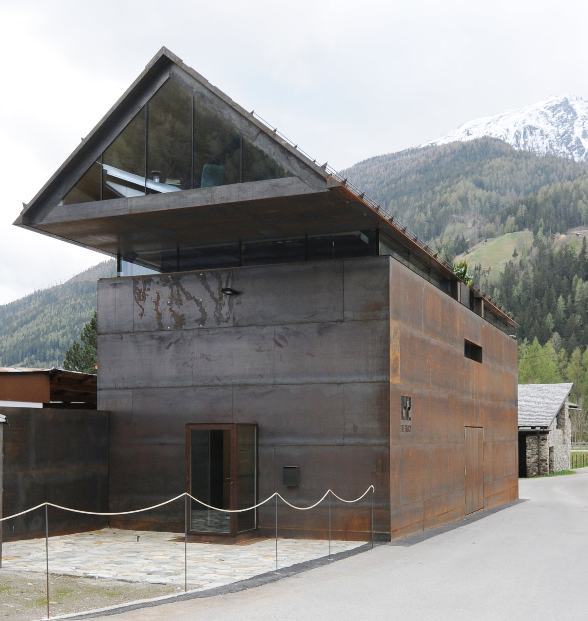 Das plastische und auch das künstlerische Element als integrativer Teil eines täglichen Lebensraumes bestimmt das architektonische Gesamtkonzept. Die materielle Formgestaltung von Gebautem produziert Suggestion und Verhalten. Jeder Innen- und Außenraum wird vom Menschen gelebt und hat daher eine architektursoziologische Wirkung. Materialien werden sparsam und bewusst eingesetzt, vorhandene bzw. verwertbare Ressourcen wieder in Stand gesetzt. Die Cortenstahl-Verkleidung des Gesamtvolumens ergibt mit den gezielt gesetzten Öffnungen die skulpturale Gesamtwirkung.