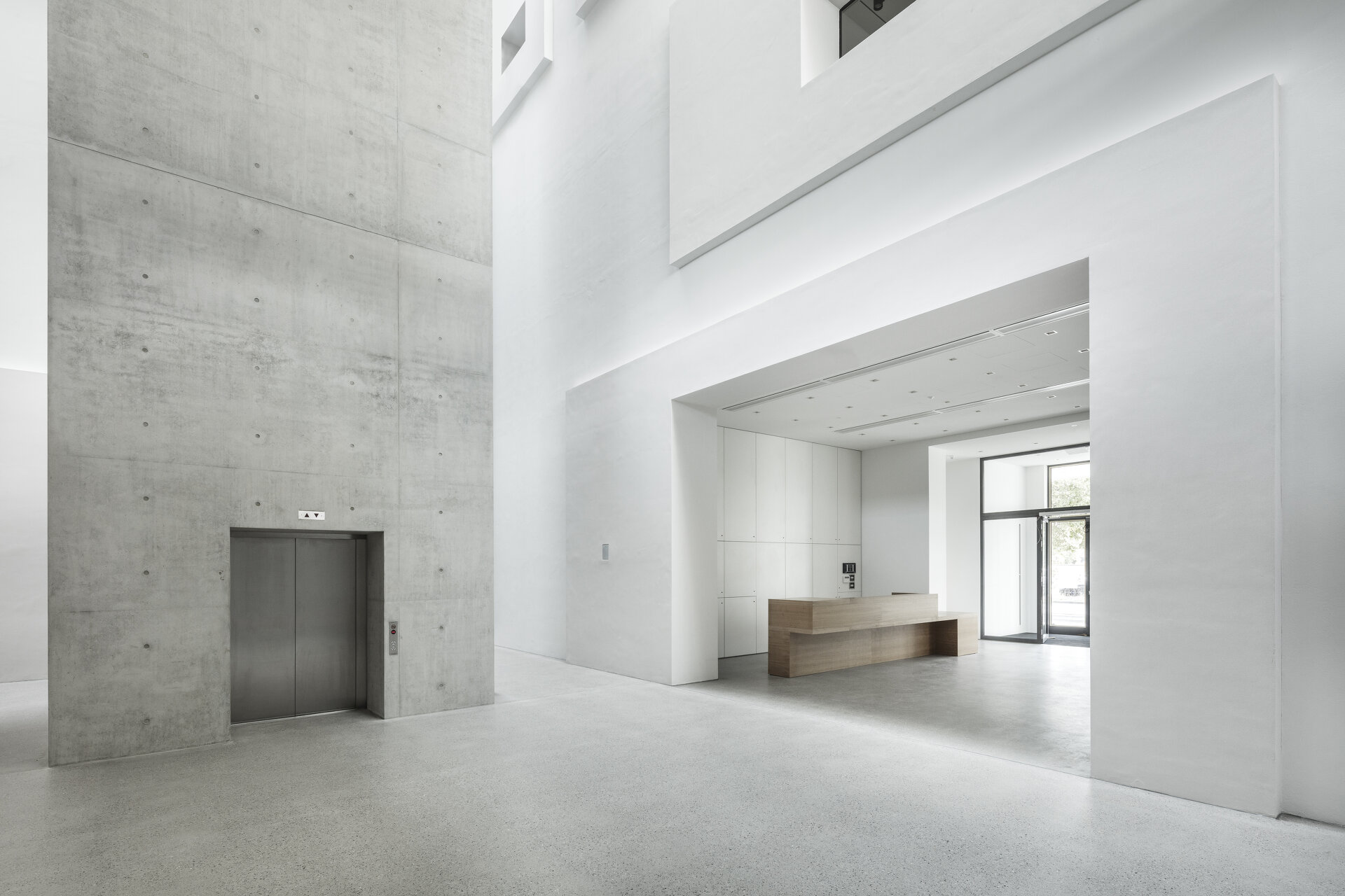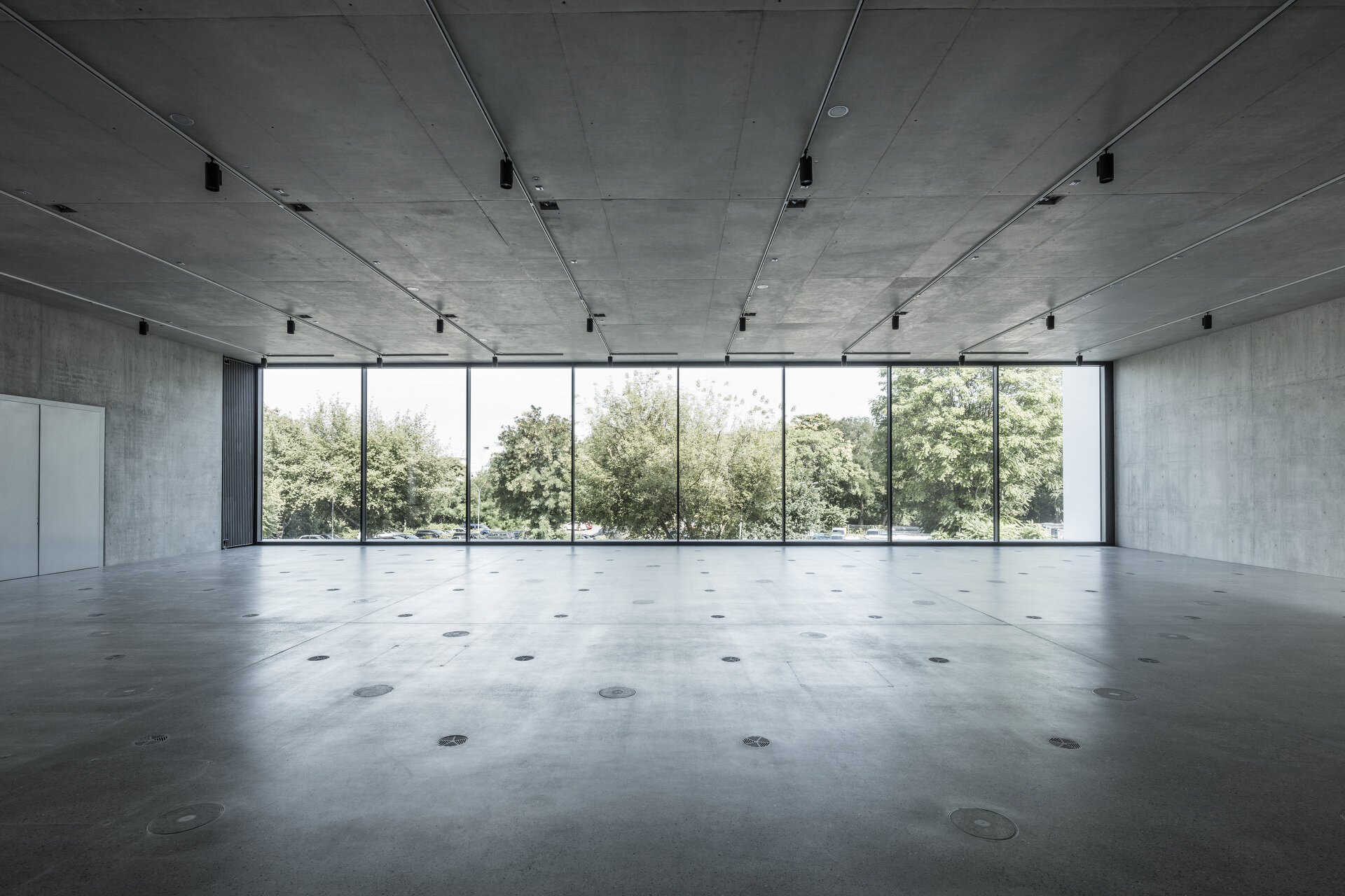 Die tausend Quadratmeter große Ausstellungshalle, die der Vorarlberger entworfen hat, birgt ein imposantes Tragwerk. Der Hauptraum wird von der gut 30 mal 30 Meter großen Sichtbetondecke überspannt, die nur an den drei Treppenhäusern und einem Aufzugsschacht in den Ecken aufgelagert ist – wie ein Tisch auf vier Beinen. „Schon im Wettbewerb zeigte sich, dass der Bestand des Deutschlandhauses als Ausstellungszentrum nicht funktionieren würde“, sagt Marte. „Wir wollten deshalb nur das Wertvollste herausschälen.“