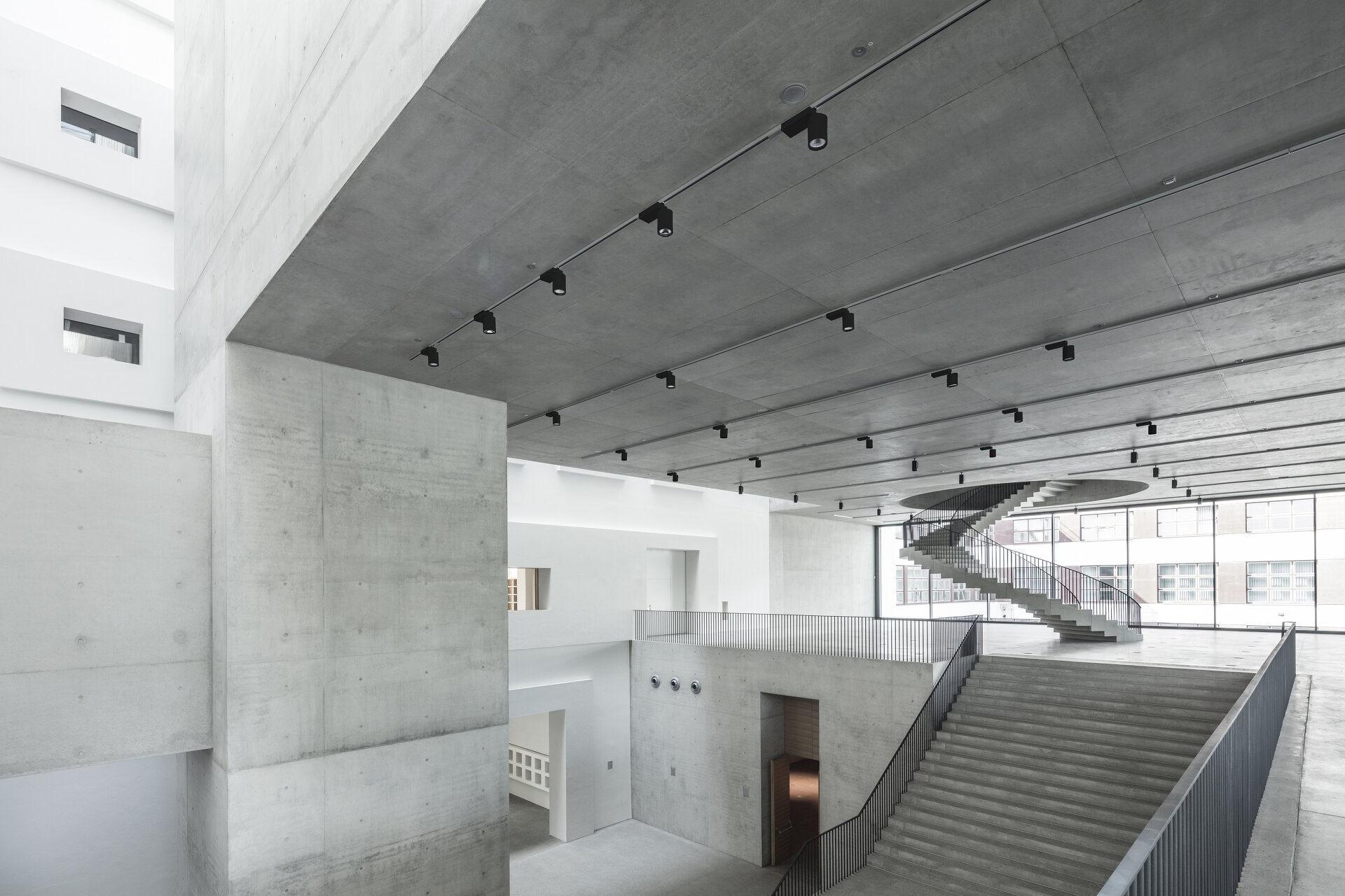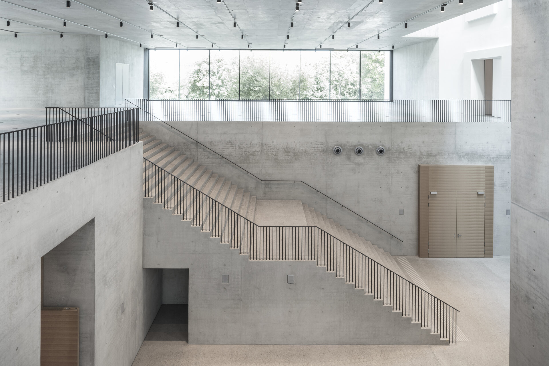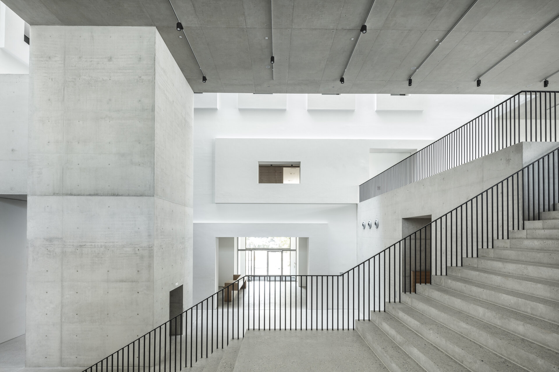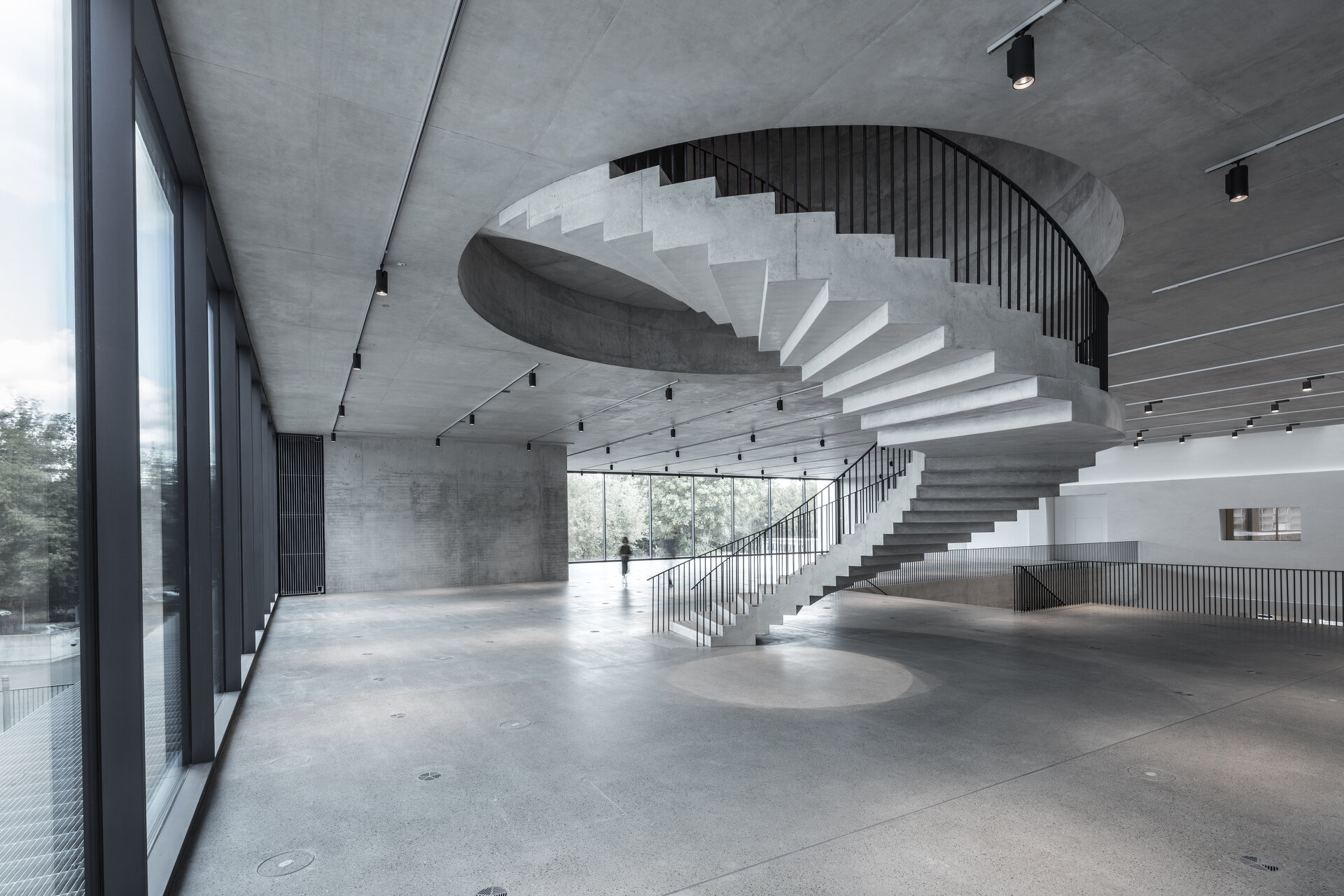Einer der Schwerpunkte des Projekts ist die Erschließung. Bernhard und Stefan Marte haben zwei imposante Treppen entworfen – eine breite Freitreppe und eine elegante Wendeltreppe. Schon seitdem Schinkel vor 200 Jahren in Berlin den Bautypus Museum erfunden hat, spielen die inszenierten Wege hinauf und hinein in ein Museum eine zentrale Rolle. Leider liegt die Haupttreppe bei Marte Marte im rechten Winkel zum Eingang. Diese unorganische Besucherführung ist einer Verlegung des Eingangs während des Umbaus geschuldet. Die monumentale Wendeltreppe führt dafür „fließend in den Betonzylinder, der die Etagen miteinander verbindet“, wie Stefan Marte sagt.