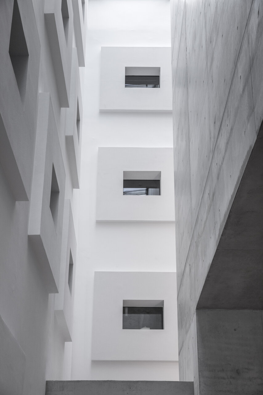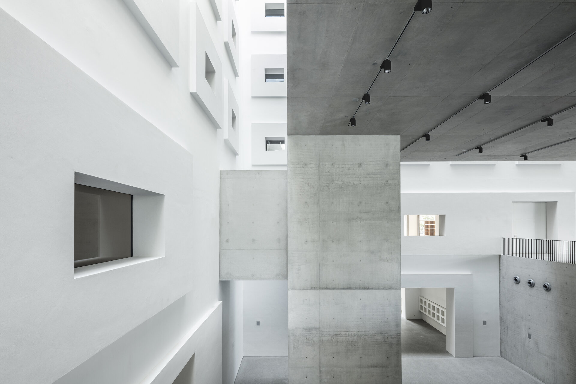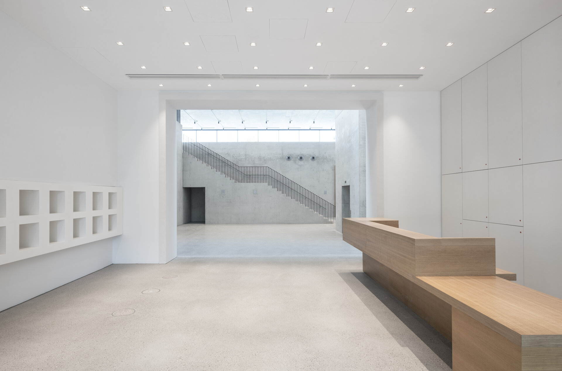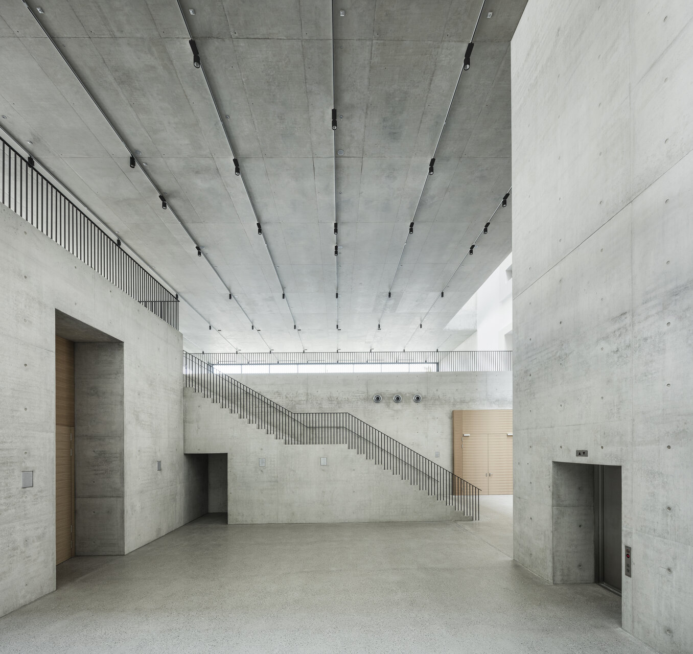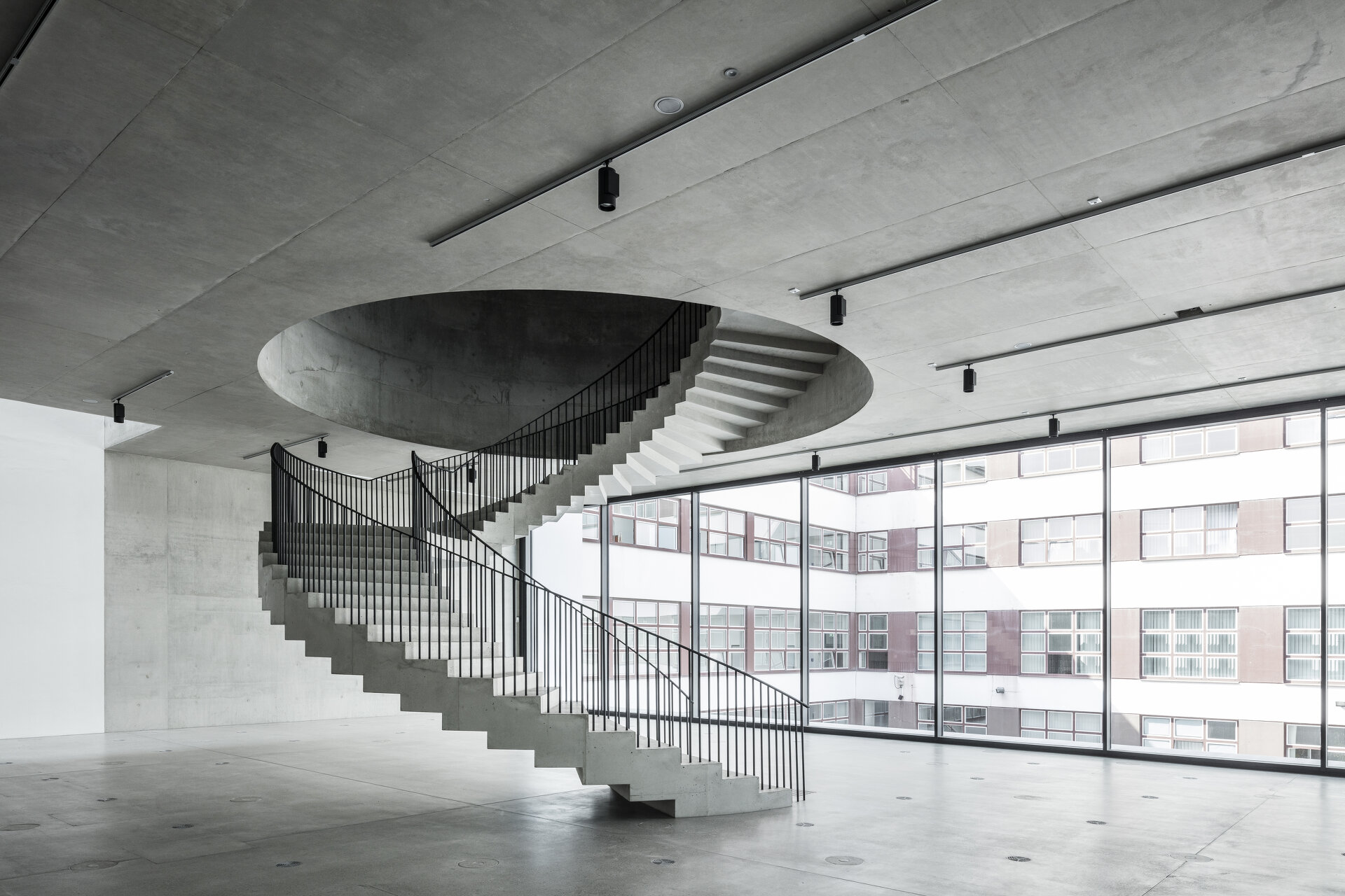 Einer der Schwerpunkte des Projekts ist die Erschließung. Bernhard und Stefan Marte haben zwei imposante Treppen entworfen – eine breite Freitreppe und eine elegante Wendeltreppe. Schon seitdem Schinkel vor 200 Jahren in Berlin den Bautypus Museum erfunden hat, spielen die inszenierten Wege hinauf und hinein in ein Museum eine zentrale Rolle. Leider liegt die Haupttreppe bei Marte Marte im rechten Winkel zum Eingang. Diese unorganische Besucherführung ist einer Verlegung des Eingangs während des Umbaus geschuldet. Die monumentale Wendeltreppe führt dafür „fließend in den Betonzylinder, der die Etagen miteinander verbindet“, wie Stefan Marte sagt.