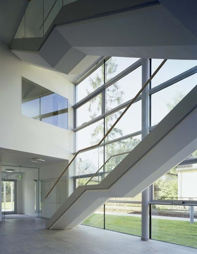 Hinter dem Zubau markiert ein Glasdach das Entrée der Musikschule. Diese flankiert als langer, schmaler Körper den Altbau, ist jedoch aus dessen Orthogonalität gedreht, um dem Fußweg zur Kirche im Norden und seinem begleitenden Grünraum entsprechende Großzügigkeit zu verleihen.