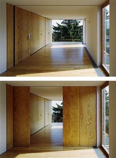 Die Villa Pia misst fünf mal zehn Meter und folgt einer klaren Ordnung. Im Norden sind auf 1,70 m Sanitärräume, Küche und Stiege mit integriertem Möbel komprimiert, die übrigen 3,30 m dienen dem Wohnen. Schiebewände verwandeln den Großraum auf jeder Ebene in zwei Zimmer. Um dem Stau-Bedarf der Frau von Welt für Kleidung und Accessoires raumschonend gerecht zu werden, wurde die Inneneinrichtung passgenau mitgeplant und von der Kärntner Firma Holzbau Themessl umgesetzt.