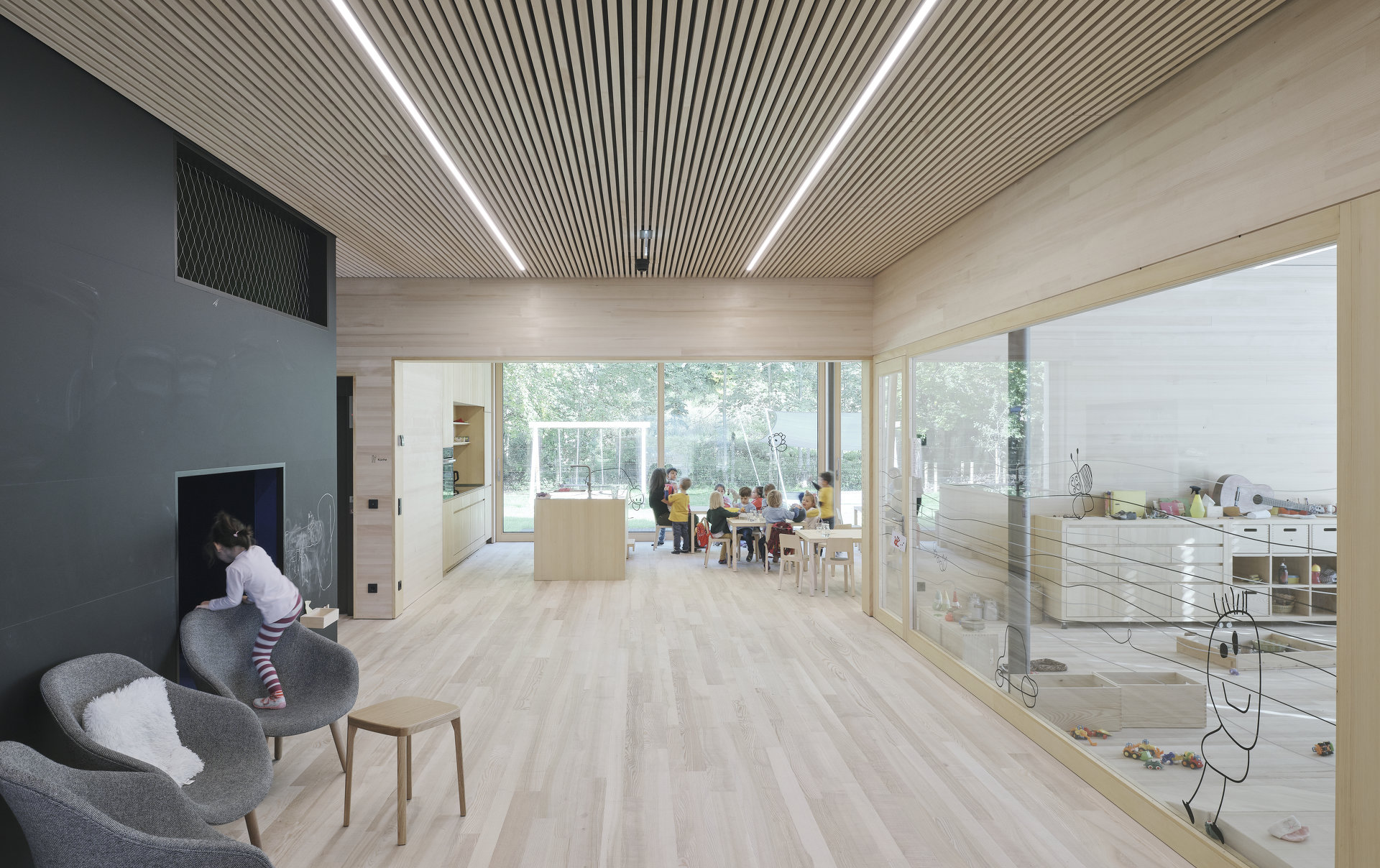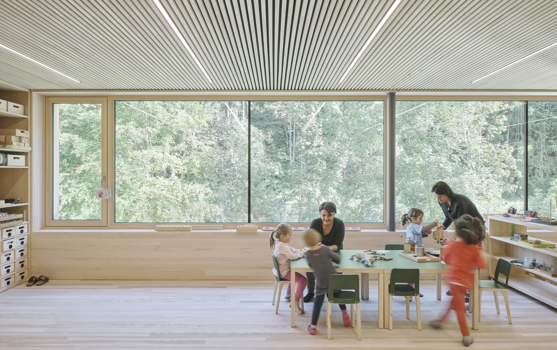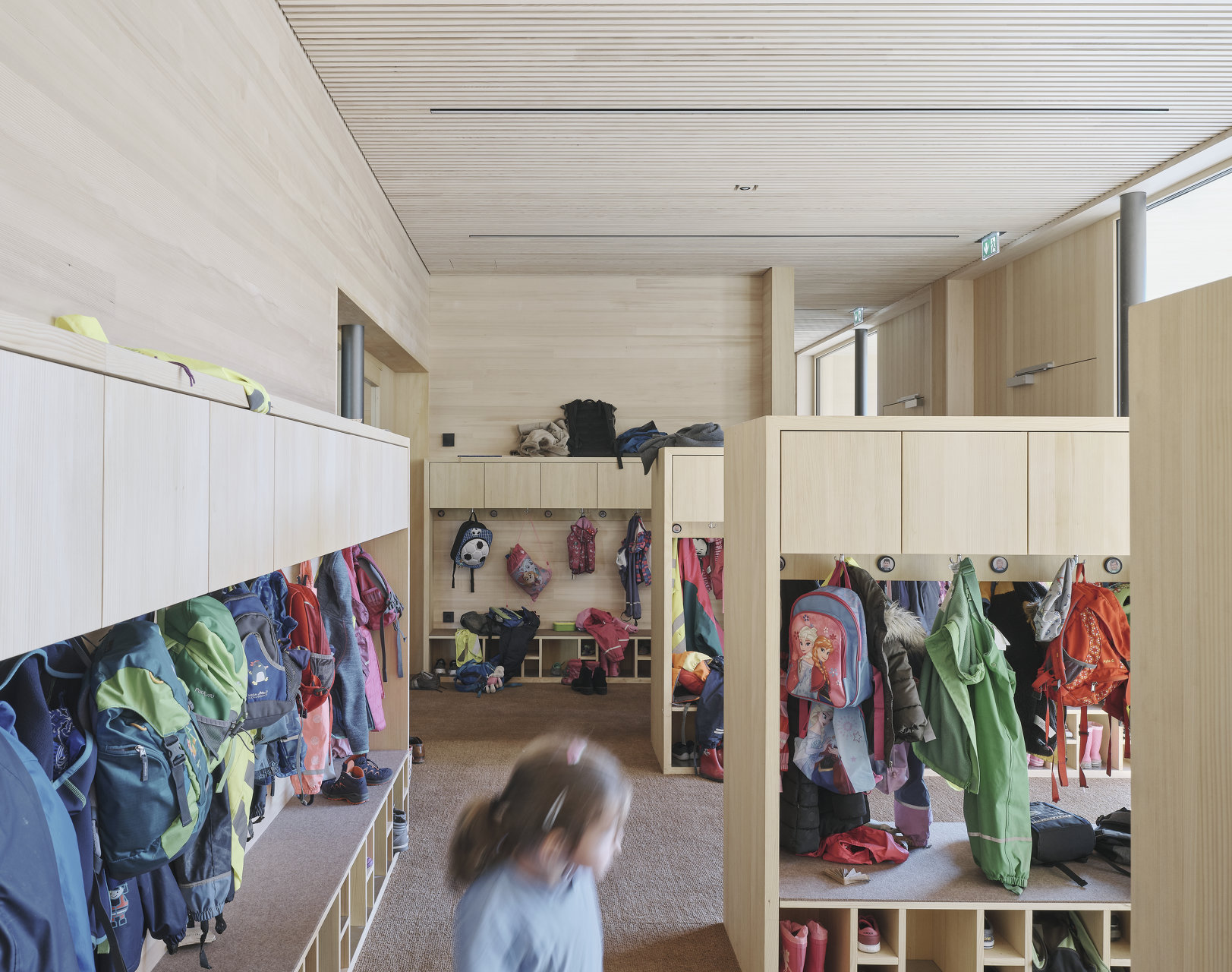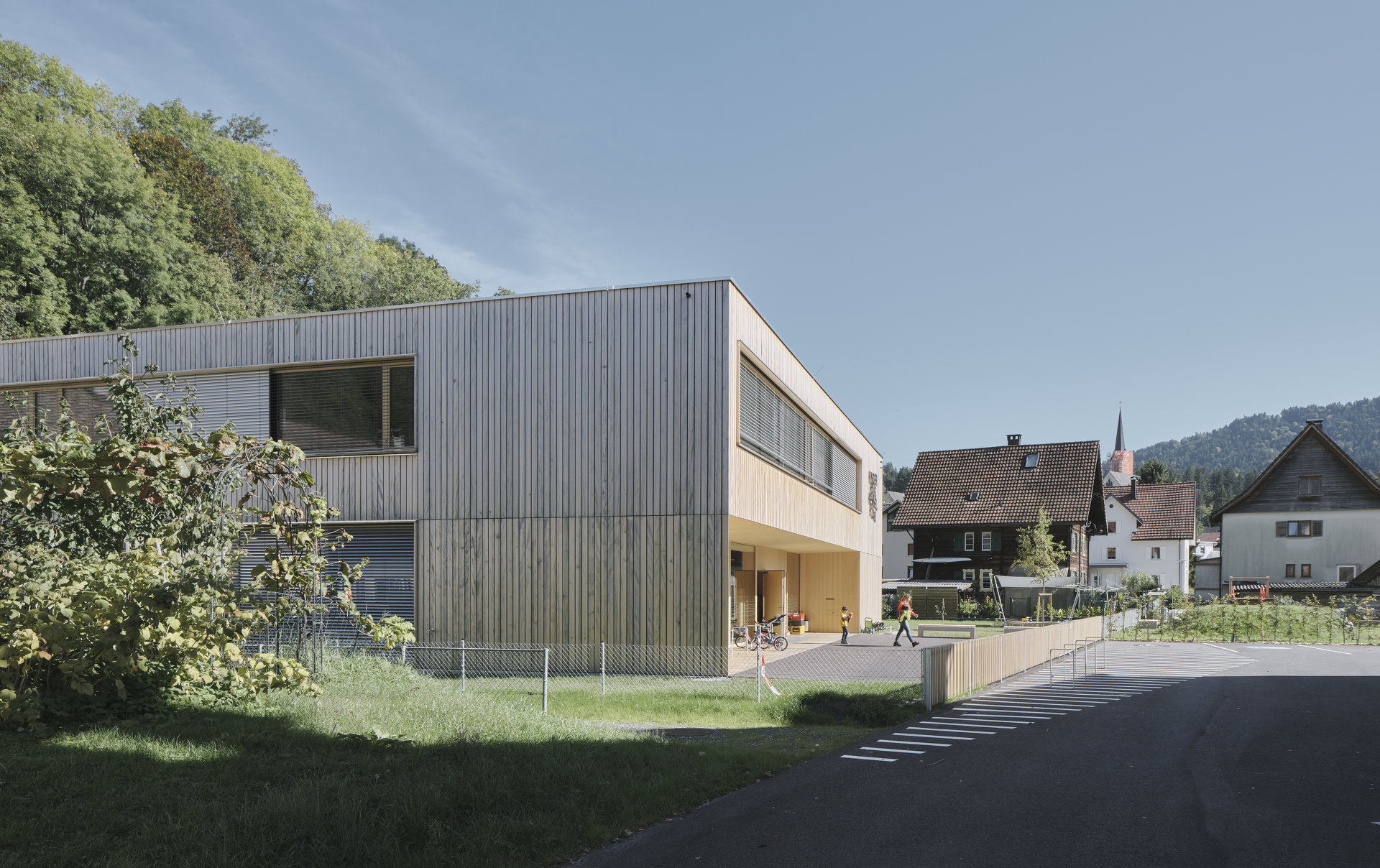 Man betritt das Gebäude über einen eingezäunten Vorplatz. Im Inneren schließt an die Garderobe ein offener Raum, von dem der Großteil des Erdgeschoßes überblickt werden kann. Das Haus ist „offen“, die Gruppen- und Bewegungsräume sind dank großer Glasflächen einsichtig gestaltet. Rund um einen Stiegenhaus-Kern reiht sich Raum an Raum. Offenheit und Geschlossenheit wechseln einander ab. Auch die Zwischenräume sind gefüllt mit Aktion und Leben. Es gibt keine ungenutzten Gänge, keine Räume ohne Nutzung. Und so können sich auch Eltern und Gäste hier aufhalten, ihre Kinder verabschieden und abholen, Gespräche führen und am Alltag des Kinderhauses teilhaben. Das Haus für drei Kindergartengruppen und zwei Gruppen für Kleinkindbetreuung ist ein konstruktiver Holzbau mit Teilunterkellerung aus Beton. Die Obergeschoße sind als Holzständerbau in Fichte ausgeführt. Bei den Sichtoberflächen der Wände und Decken kommt unbehandelte Weißtanne, beim Boden unbehandelte Esche zum Einsatz. Einzig das Weißtannenfurnier der Möbel ist geölt. Das Holz stammt aus der Region und wurde handwerklich präzise eingesetzt.