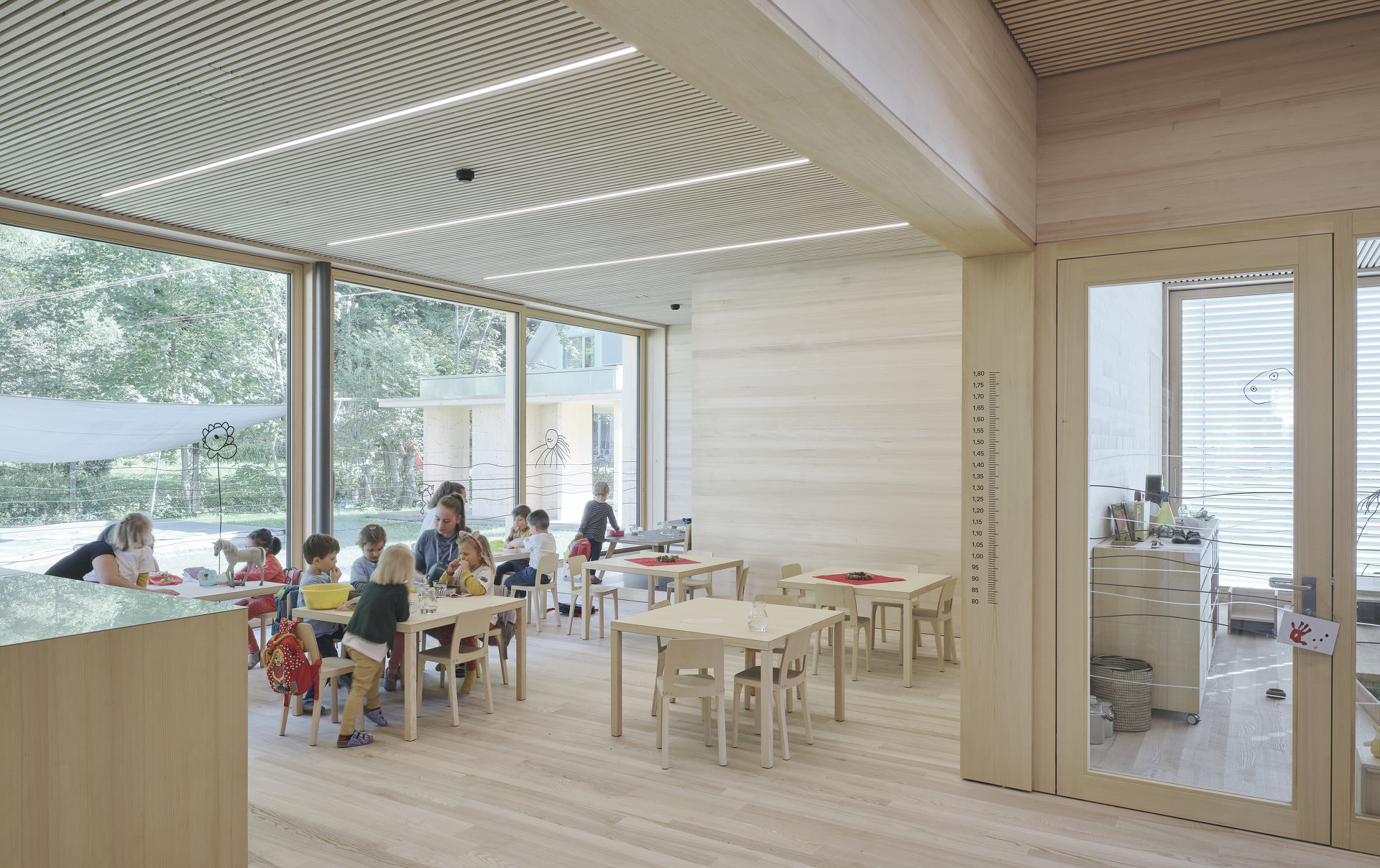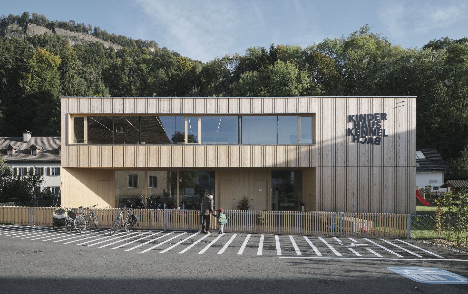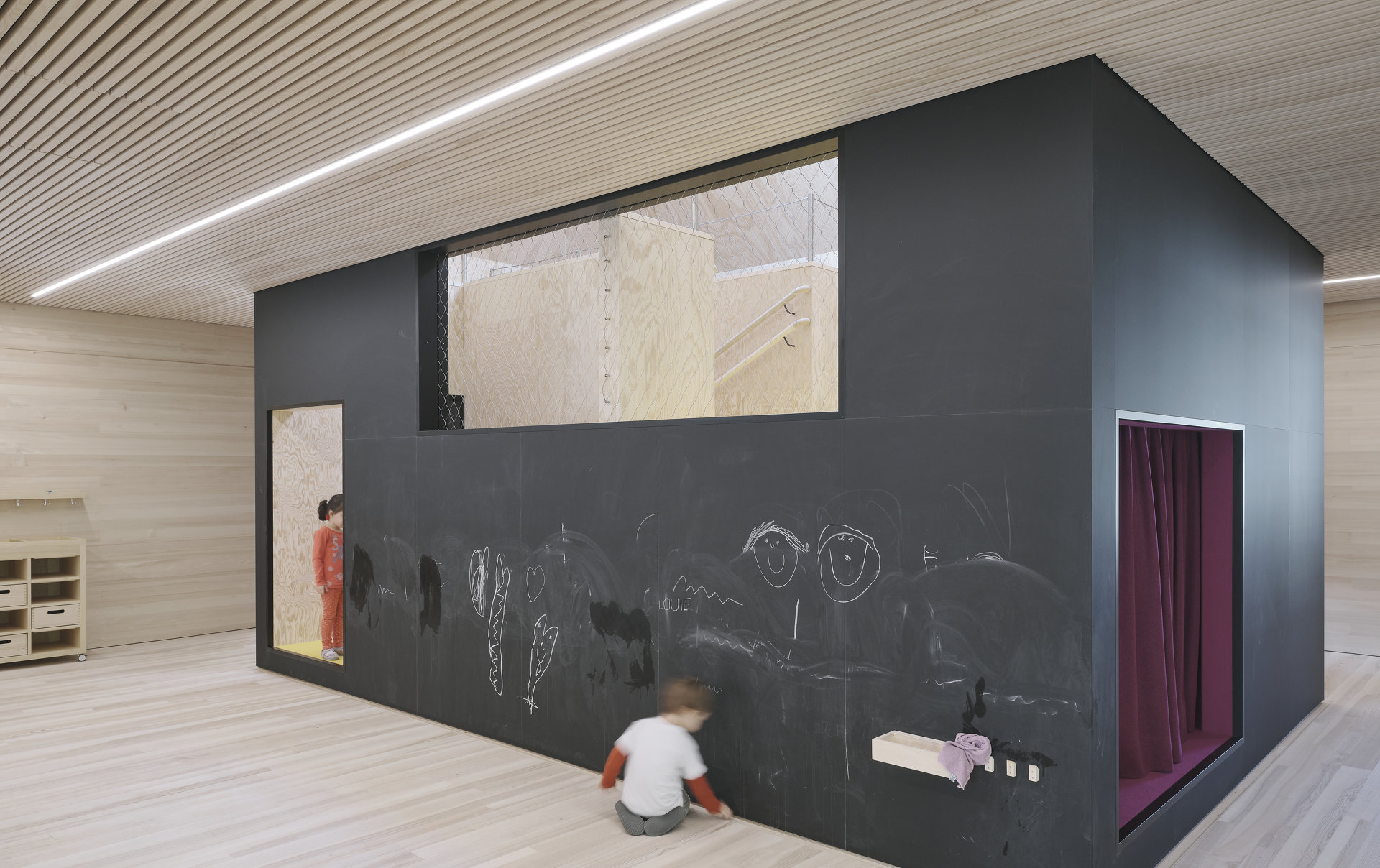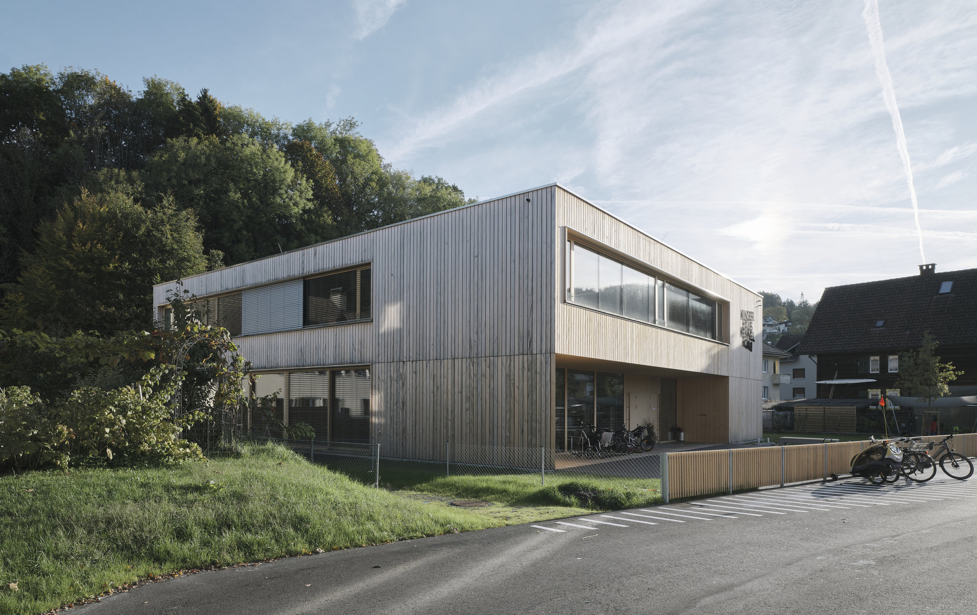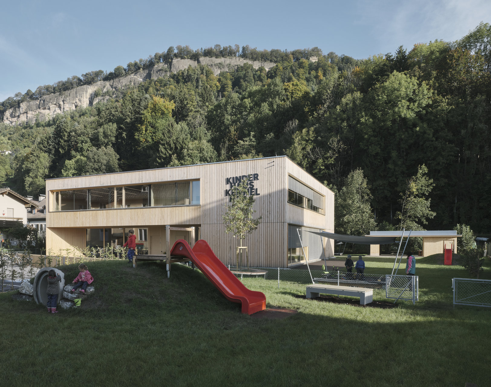Man betritt das Gebäude über einen eingezäunten Vorplatz. Im Inneren schließt an die Garderobe ein offener Raum, von dem der Großteil des Erdgeschoßes überblickt werden kann. Das Haus ist „offen“, die Gruppen- und Bewegungsräume sind dank großer Glasflächen einsichtig gestaltet. Rund um einen Stiegenhaus-Kern reiht sich Raum an Raum. Offenheit und Geschlossenheit wechseln einander ab. Auch die Zwischenräume sind gefüllt mit Aktion und Leben. Es gibt keine ungenutzten Gänge, keine Räume ohne Nutzung. Und so können sich auch Eltern und Gäste hier aufhalten, ihre Kinder verabschieden und abholen, Gespräche führen und am Alltag des Kinderhauses teilhaben. Das Haus für drei Kindergartengruppen und zwei Gruppen für Kleinkindbetreuung ist ein konstruktiver Holzbau mit Teilunterkellerung aus Beton. Die Obergeschoße sind als Holzständerbau in Fichte ausgeführt. Bei den Sichtoberflächen der Wände und Decken kommt unbehandelte Weißtanne, beim Boden unbehandelte Esche zum Einsatz. Einzig das Weißtannenfurnier der Möbel ist geölt. Das Holz stammt aus der Region und wurde handwerklich präzise eingesetzt.