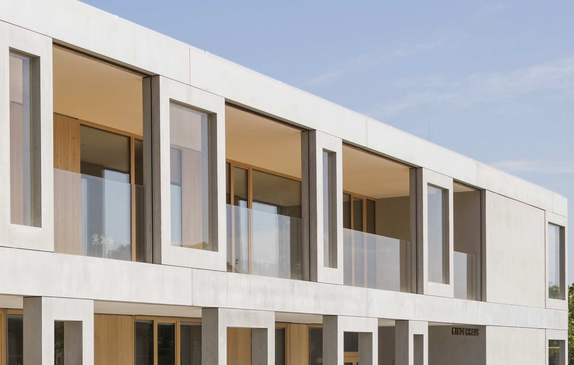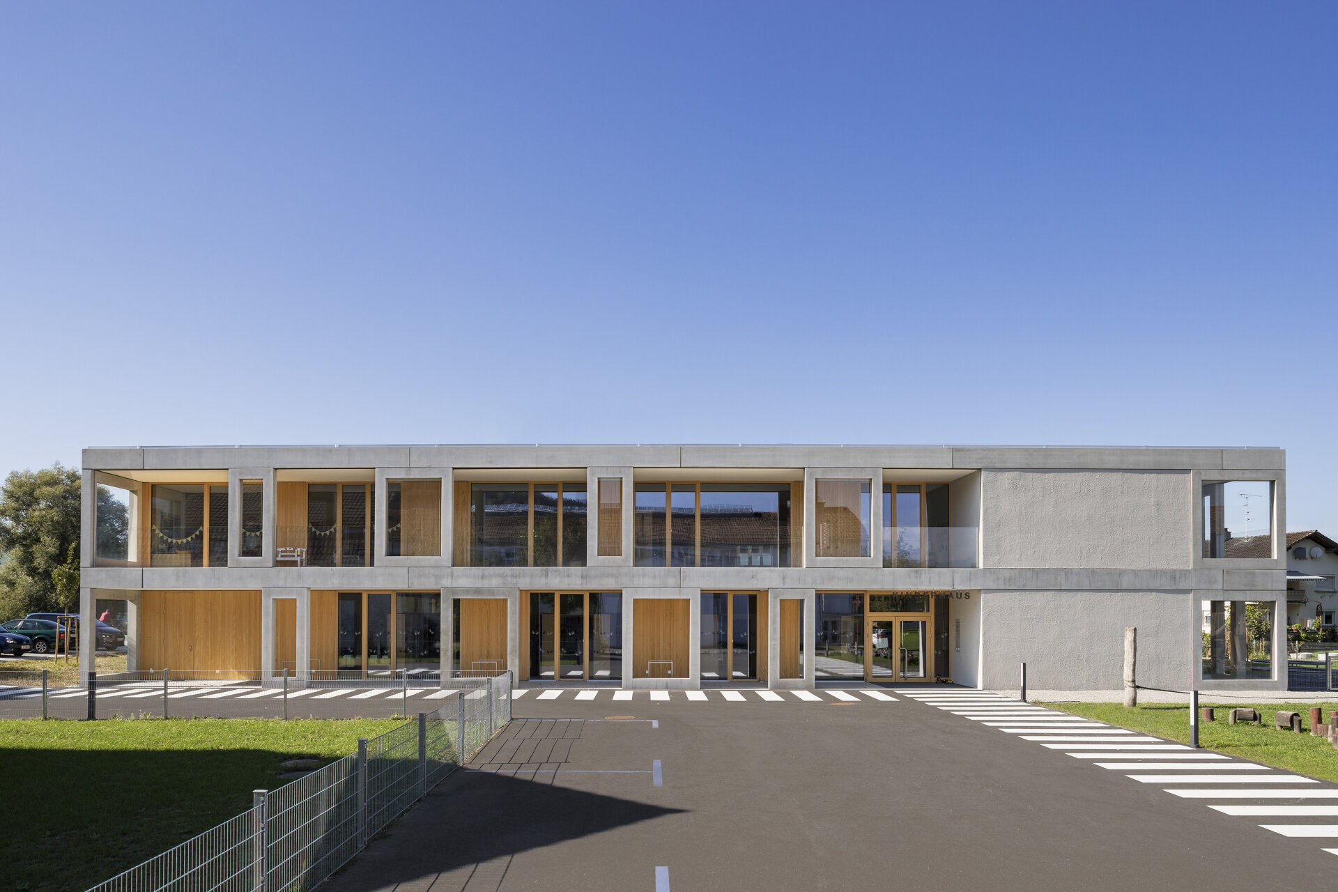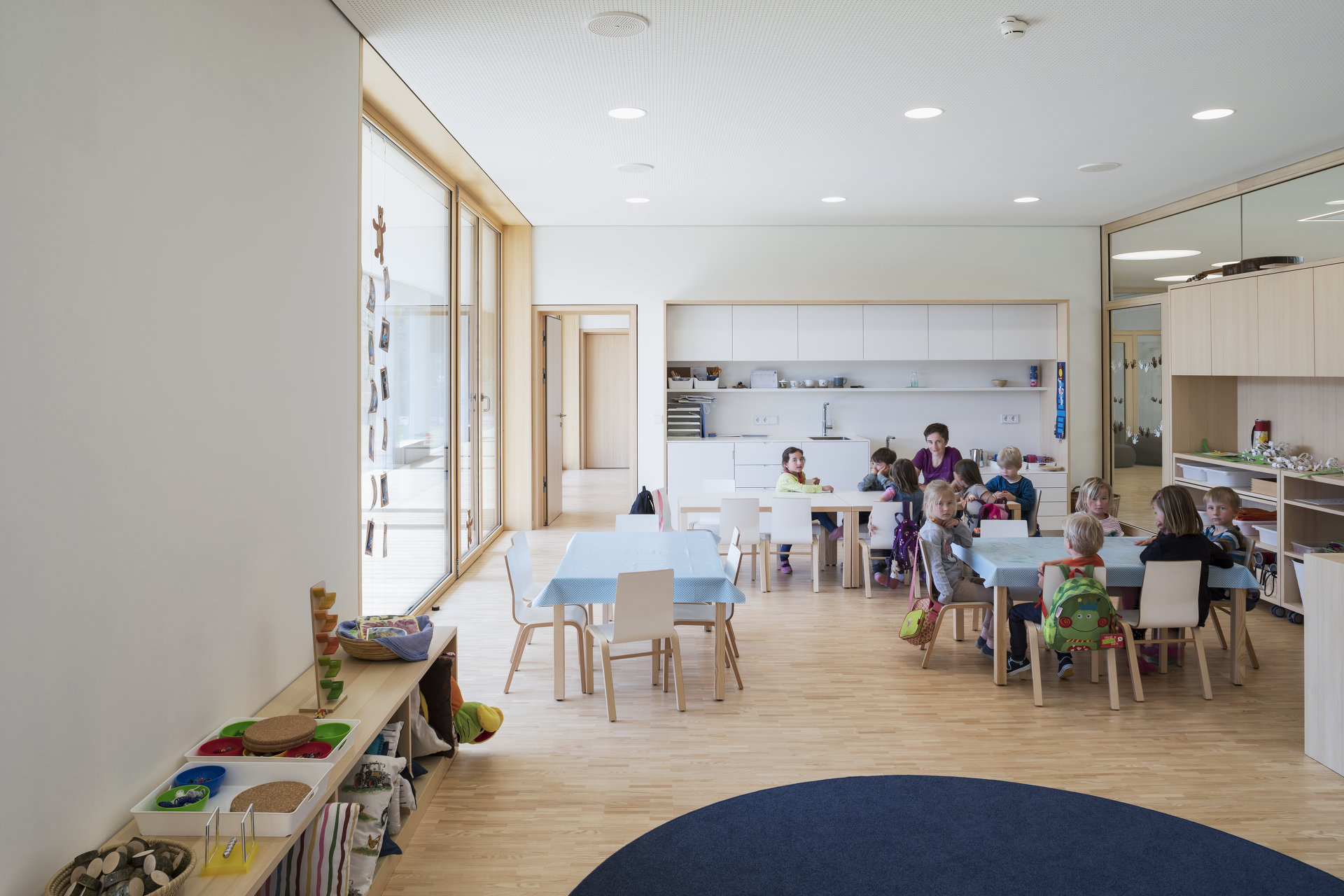 Das Gebäude ist ein schlichter Massivbau, welcher sich in seiner reduzierten Gestaltung und hellen Farbgebung mit schalungsglattem Sichtbeton gut in die bestehende Bebauung einfügt. Die Betonrahmen verbinden die statische Struktur mit der räumlichen Abgrenzung nach außen, gleichzeitig dienen sie als Sitzmöglichkeiten für die Kinder. Raumhohe Glasflächen im Gebäudeinneren und die Glasbrüstungen der Loggien gewährleisten optimale Ausblicke für die Kinder. (Text: Architekten, bearbeitet)