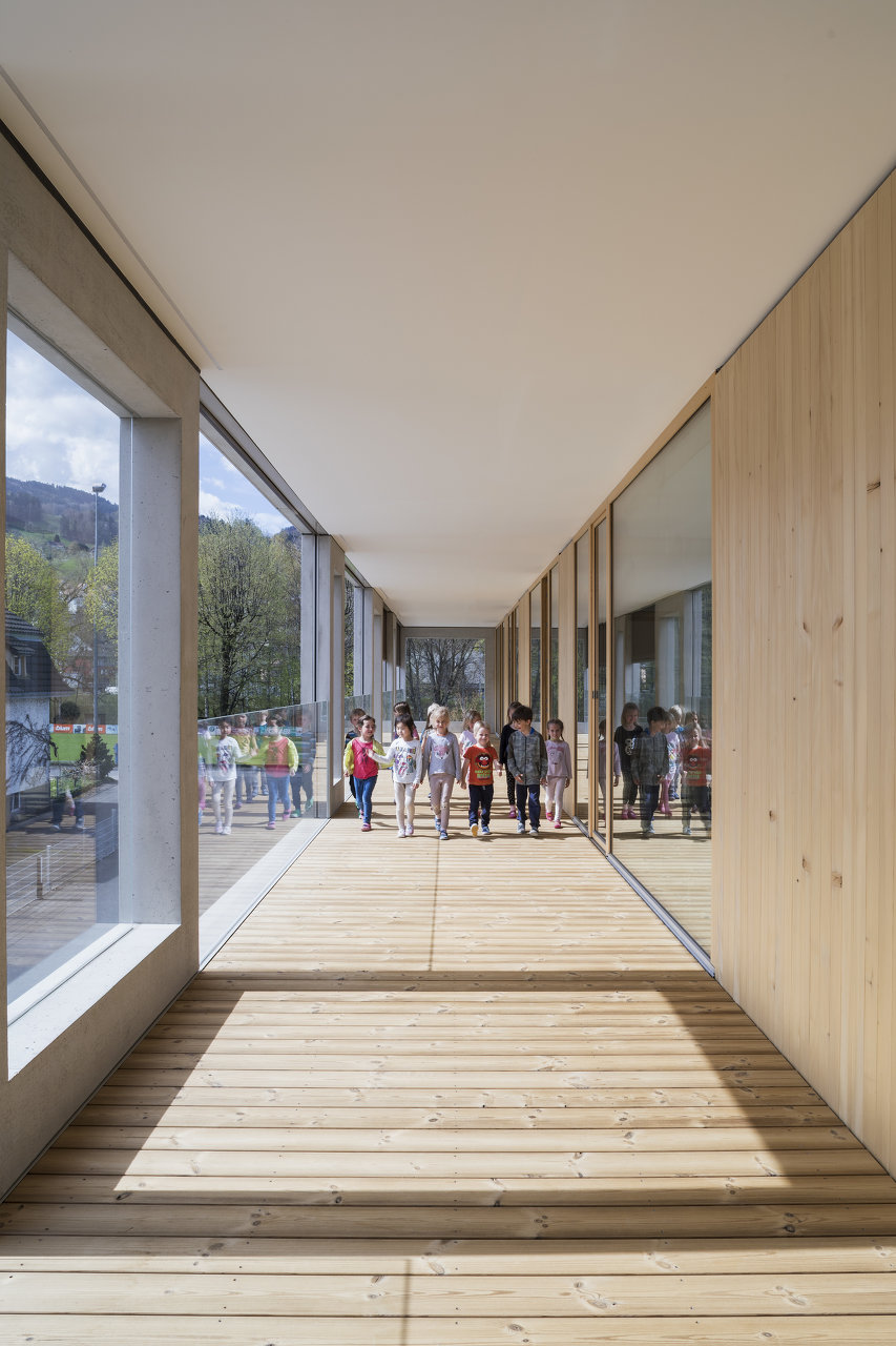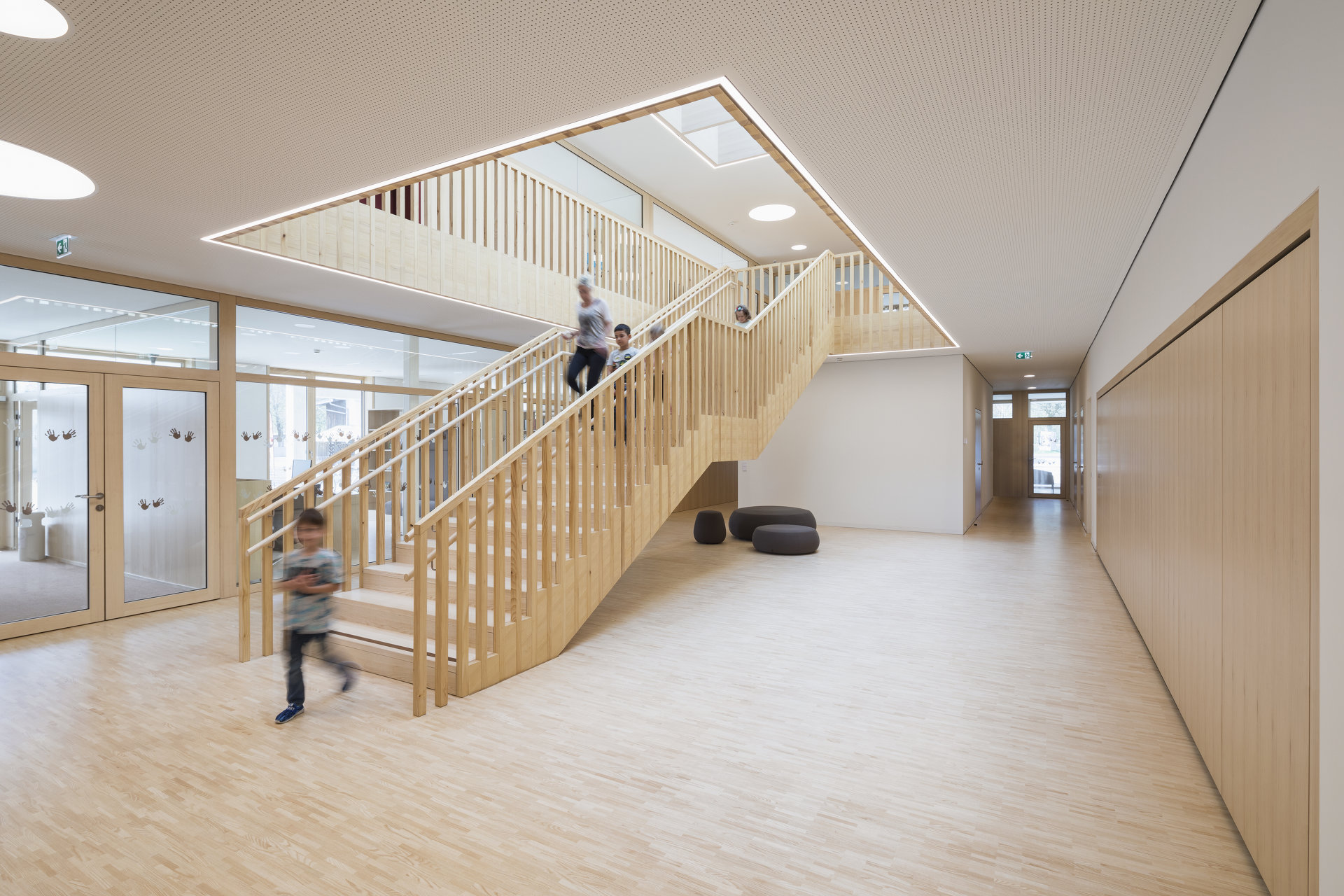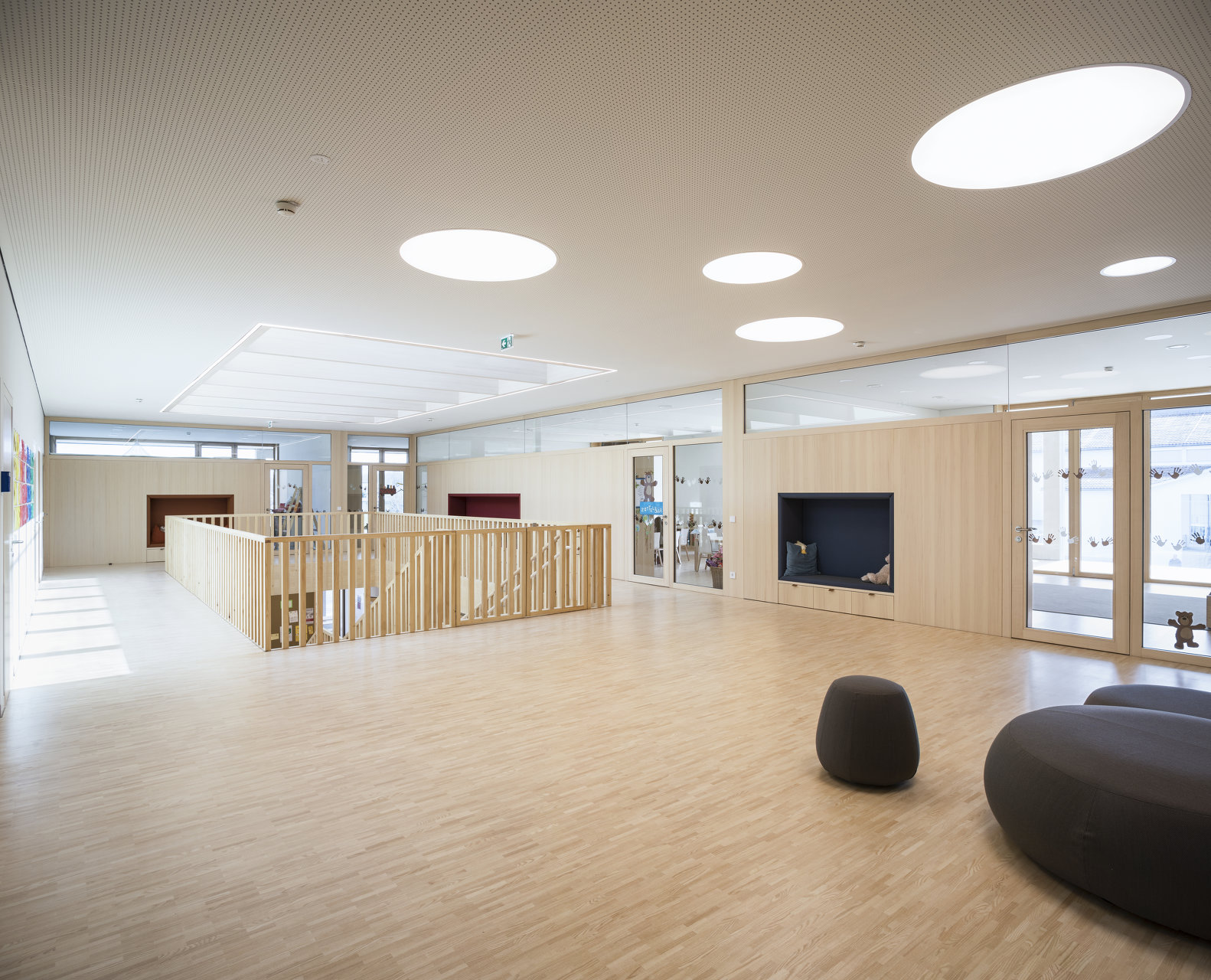 Im Obergeschoß sind sämtliche Gruppenräume mit dazwischenliegenden Ausweichräumen angeordnet. Das hat den Vorteil, das altersübergreifende pädagogische Konzept unkompliziert räumlich und funktionell umzusetzen. Zudem kann so der gesellschaftlich erst wachsenden Nachfrage nach Kleinkindbetreuung in flexibler Weise nachgekommen werden. Die Gangfläche des Obergeschoßes hat durch ihre großzügige Dimensionierung und die zentrale Lage die Qualität eines gemeinsamen Spielraums. Durch das Oberlicht optimal belichtet, ist dieser Kernbereich von allen angrenzenden Gruppenräumen durch großzügige Verglasungen einsehbar. Die Treppe kann zur Sicherheit der Kinder durch ein geländerhohes, zweiflügeliges Tor abgeschlossen werden. Jedem Gruppenraum ist eine auf drei Gebäudeseiten durchgehende Loggia zugeordnet. Diese Erweiterung der Aufenthaltsbereiche ist durch den außenliegenden Sonnenschutz gerade auch im Sommer ein besonderes Angebot.