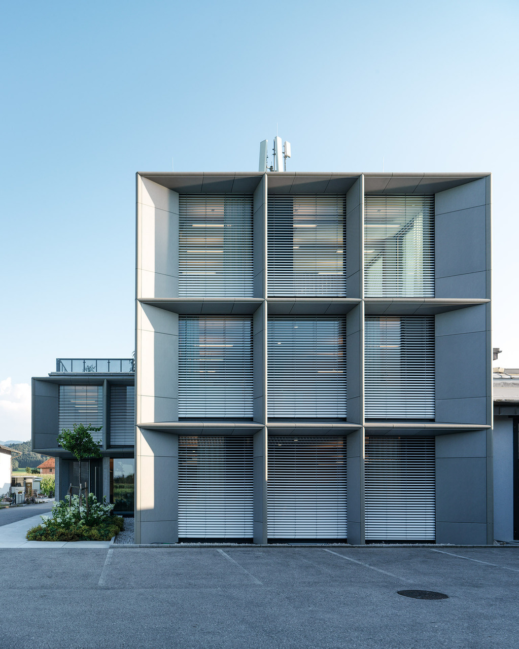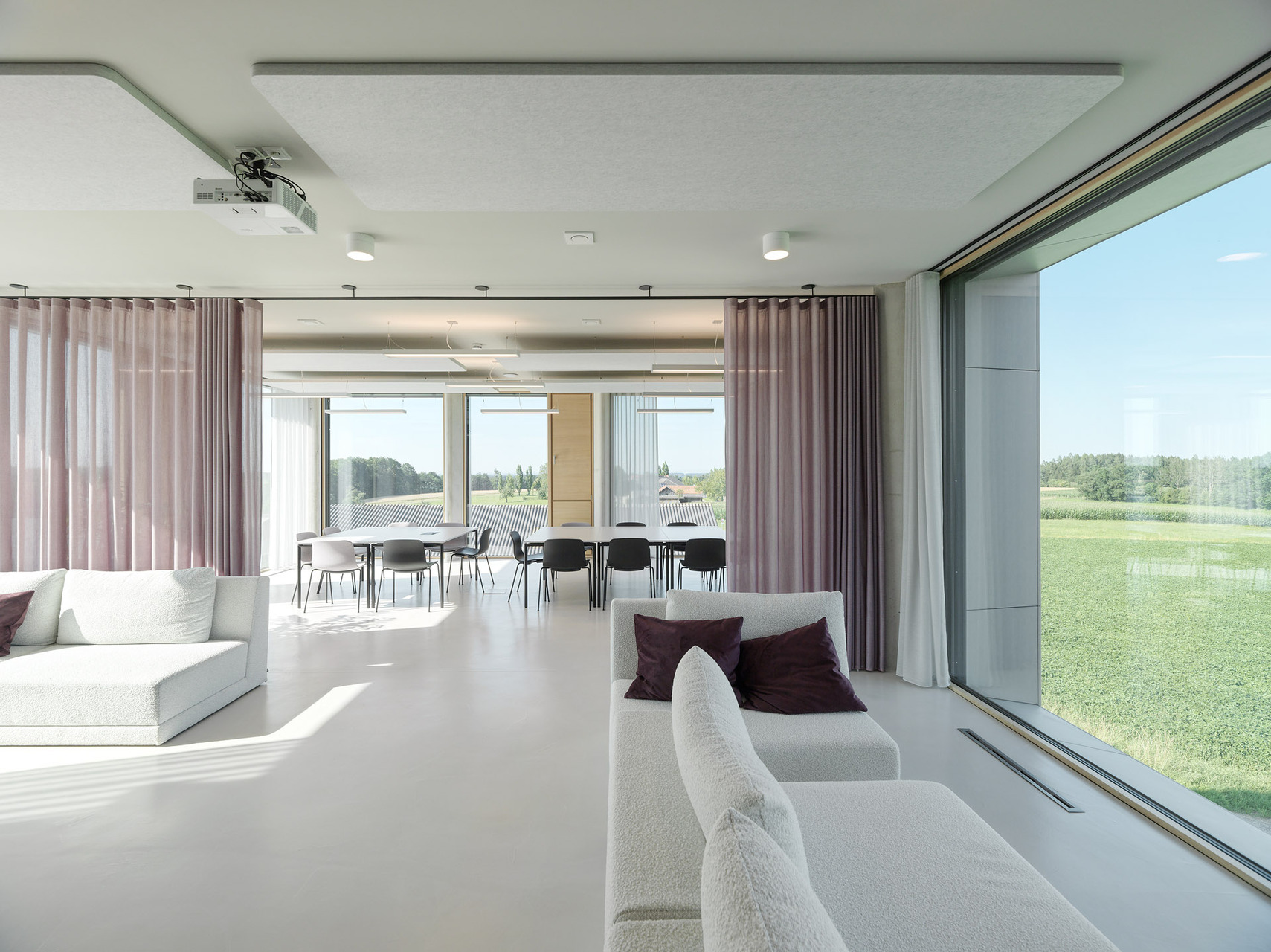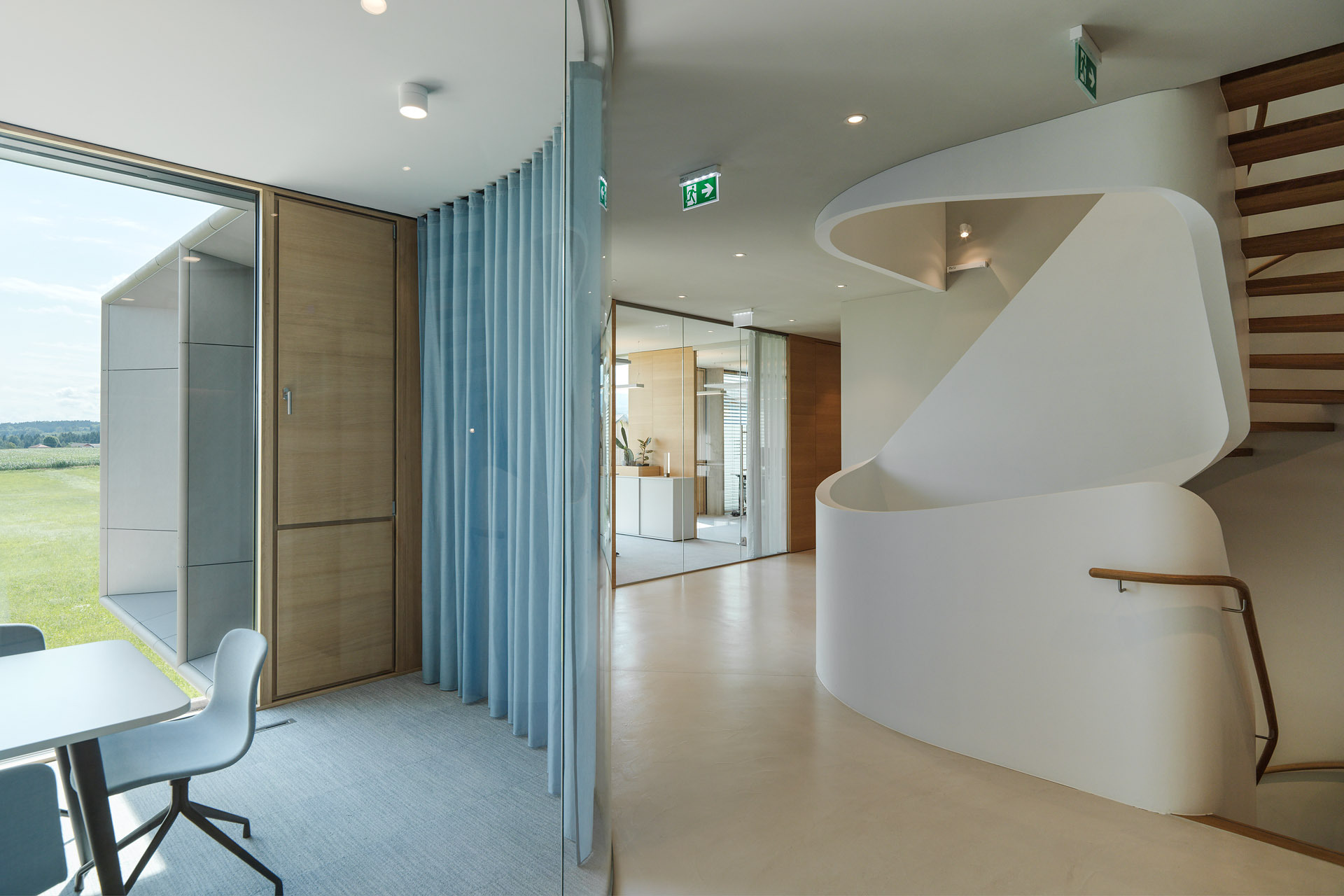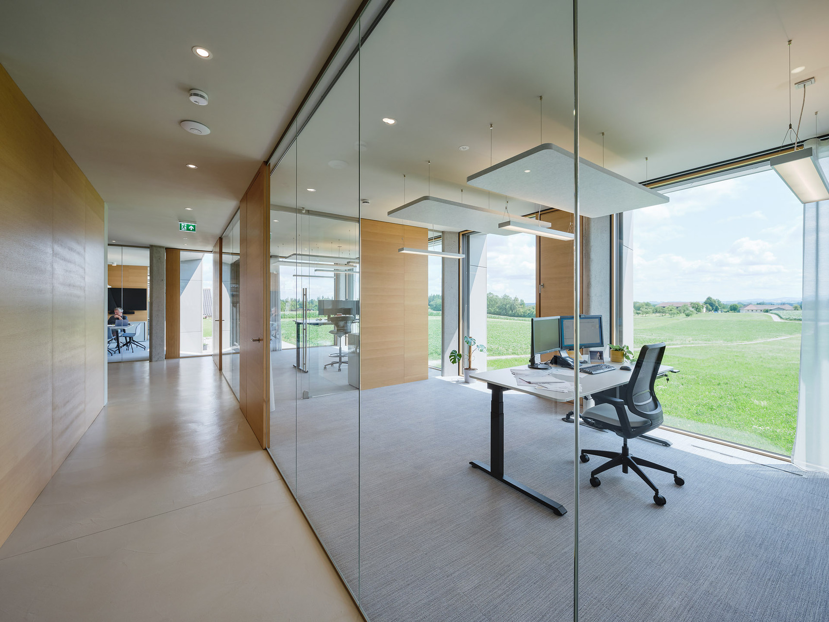 Die Büroräume sind ein Wechselspiel aus Glas und Holz. Je nach Standort finden sich Situationen der Weite oder aber Blick- und Sichtschutz zum Arbeiten und für Besprechungen. Sichtachsen innerhalb des Gebäudes erweitern sich über die großflächige Fassadenverglasung in die umliegende Wiesen- und Hügellandschaft. Die zentrale Erschließung, kombiniert mit Aufenthaltsbereichen, ermöglicht Begegnung und Kommunikation. Die markante und schlichte Strukturierung der Außenfassade, mit eigens dafür entwickelten Platten- und Formteilen aus Faserzement, integriert Sonnenschutz und Entwässerungen. (Text: Architekten, bearbeitet)