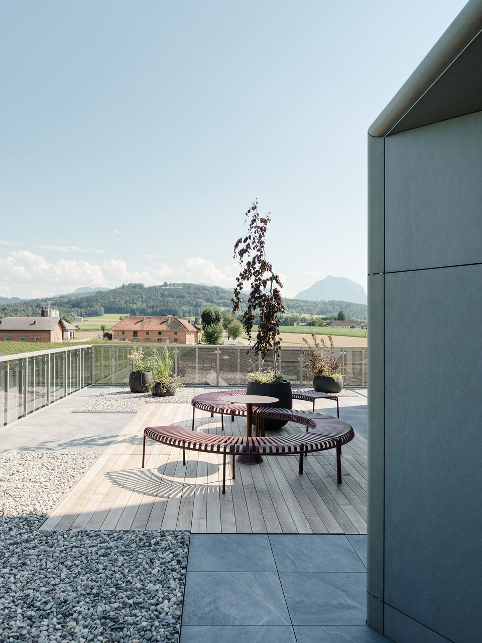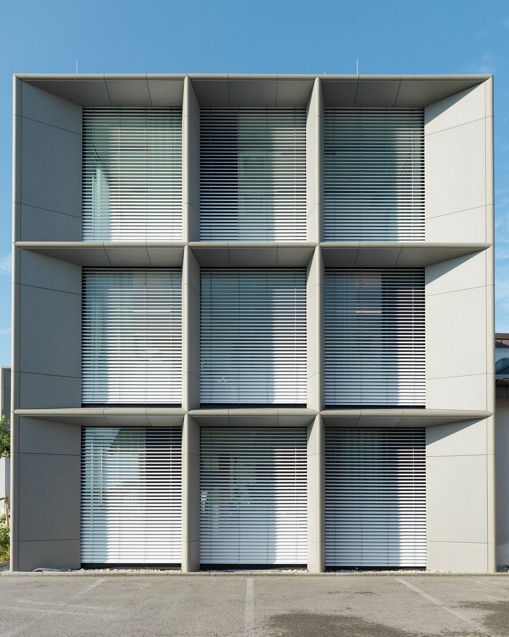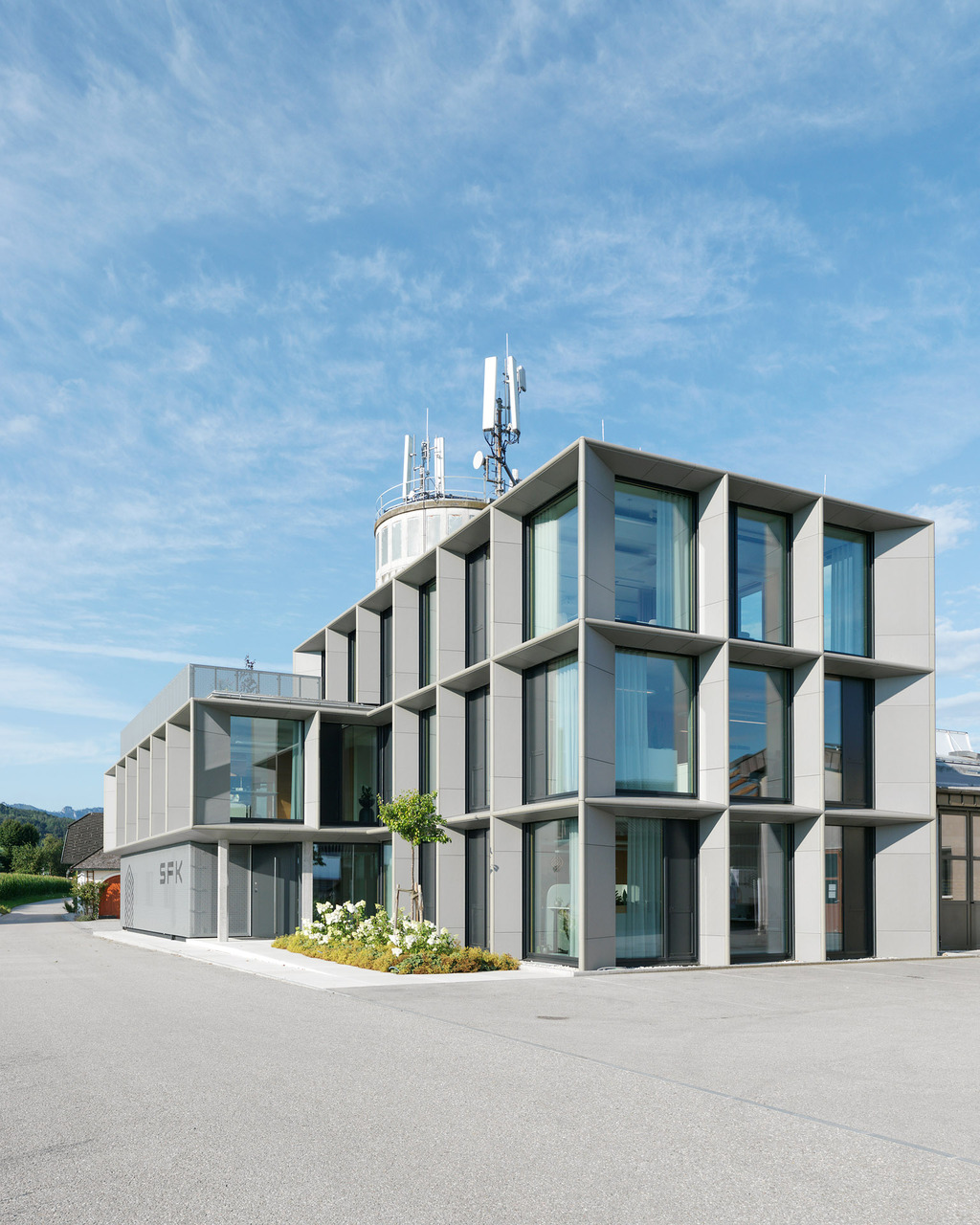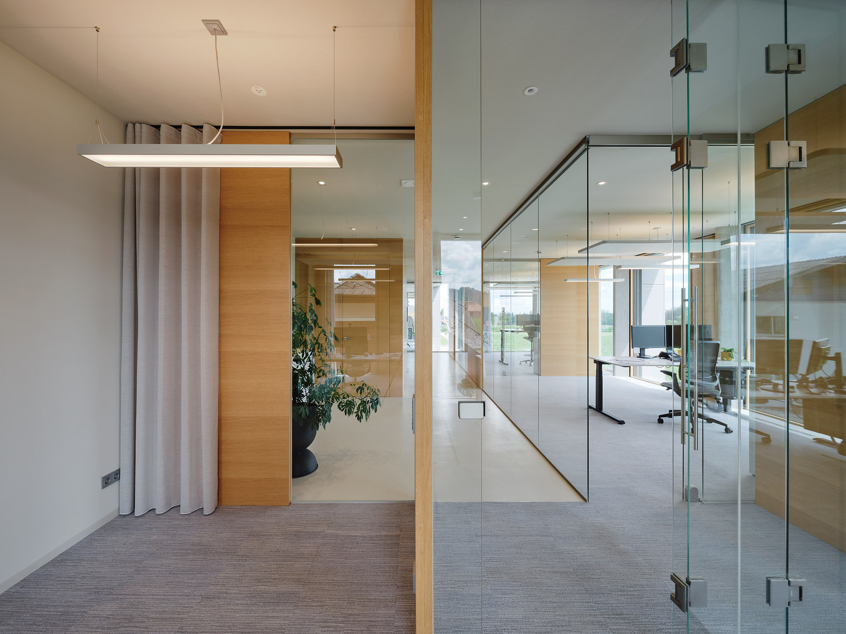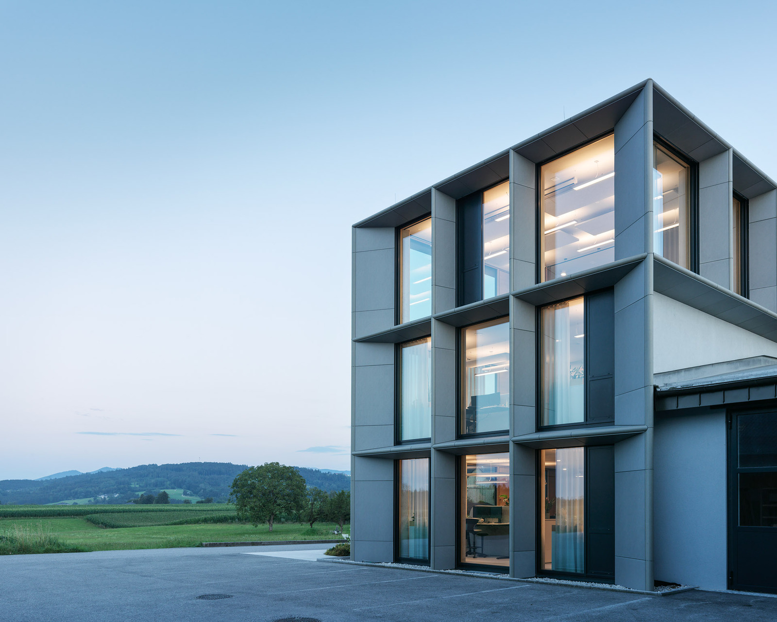 Die Büroräume sind ein Wechselspiel aus Glas und Holz. Je nach Standort finden sich Situationen der Weite oder aber Blick- und Sichtschutz zum Arbeiten und für Besprechungen. Sichtachsen innerhalb des Gebäudes erweitern sich über die großflächige Fassadenverglasung in die umliegende Wiesen- und Hügellandschaft. Die zentrale Erschließung, kombiniert mit Aufenthaltsbereichen, ermöglicht Begegnung und Kommunikation. Die markante und schlichte Strukturierung der Außenfassade, mit eigens dafür entwickelten Platten- und Formteilen aus Faserzement, integriert Sonnenschutz und Entwässerungen. (Text: Architekten, bearbeitet)