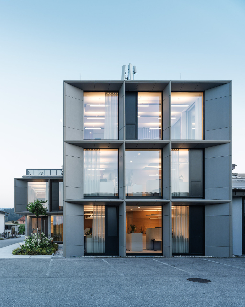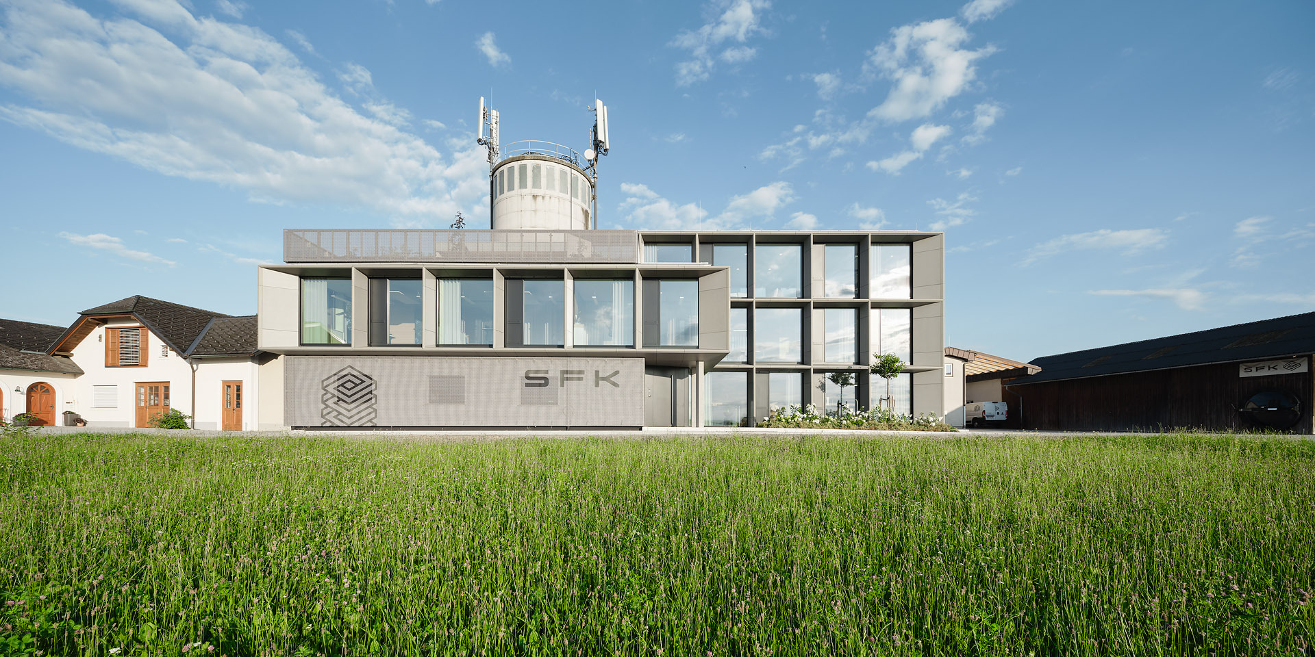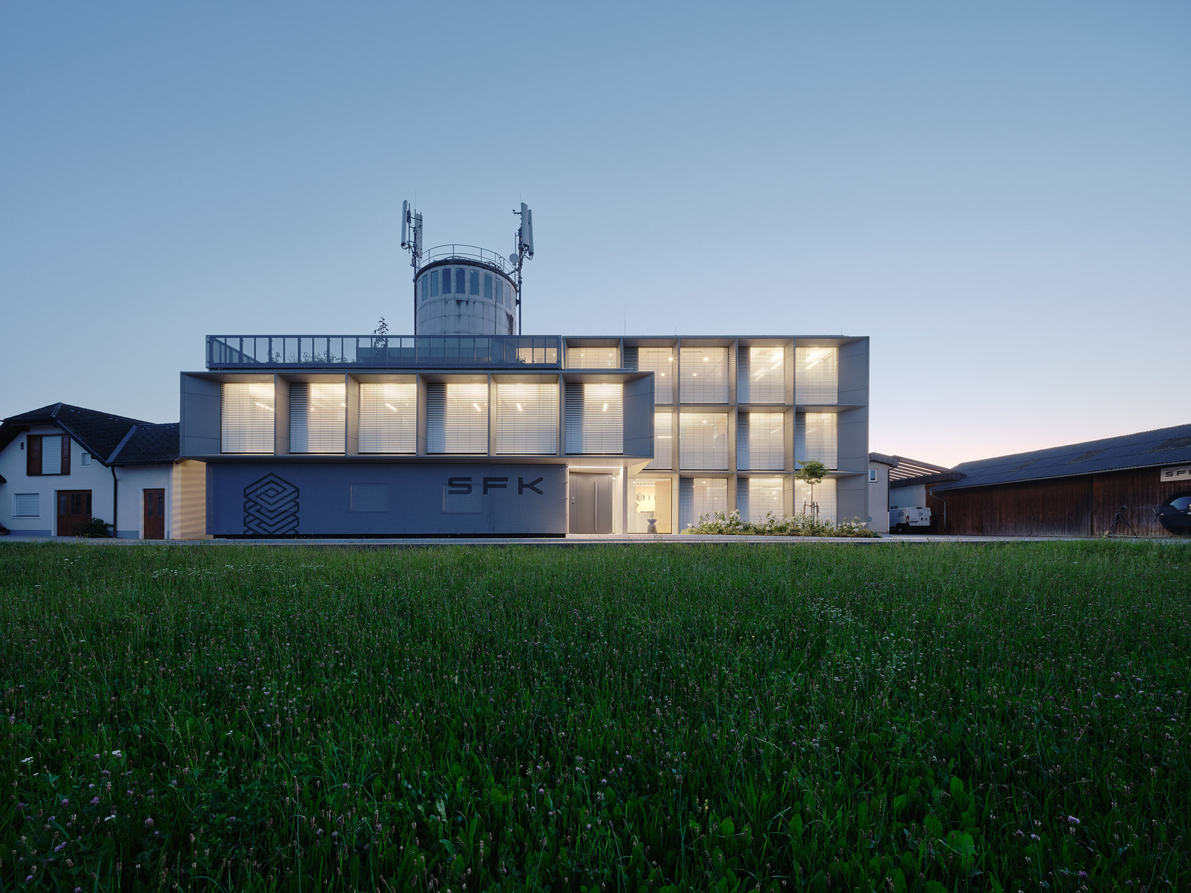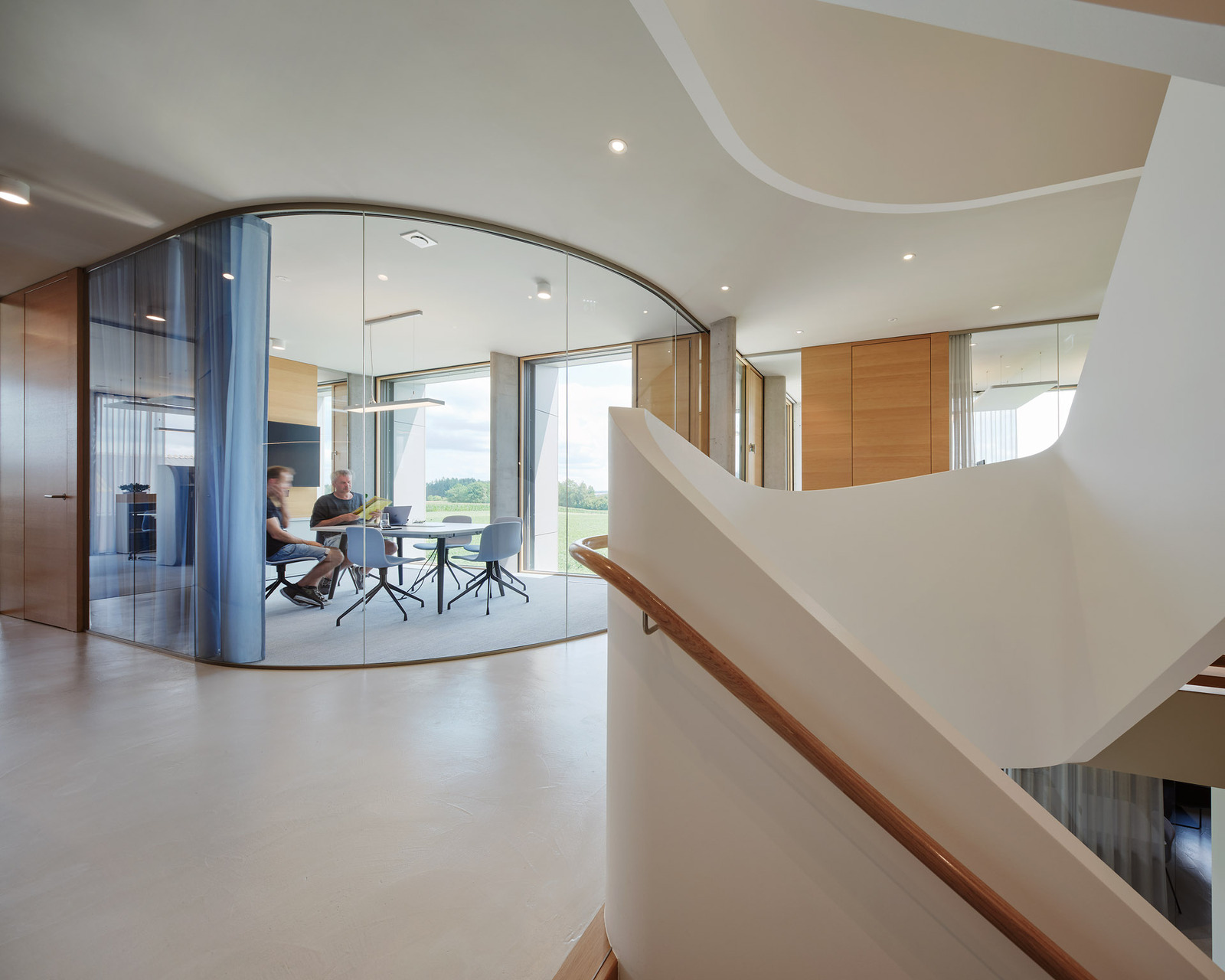 Die Büroräume sind ein Wechselspiel aus Glas und Holz. Je nach Standort finden sich Situationen der Weite oder aber Blick- und Sichtschutz zum Arbeiten und für Besprechungen. Sichtachsen innerhalb des Gebäudes erweitern sich über die großflächige Fassadenverglasung in die umliegende Wiesen- und Hügellandschaft. Die zentrale Erschließung, kombiniert mit Aufenthaltsbereichen, ermöglicht Begegnung und Kommunikation. Die markante und schlichte Strukturierung der Außenfassade, mit eigens dafür entwickelten Platten- und Formteilen aus Faserzement, integriert Sonnenschutz und Entwässerungen. (Text: Architekten, bearbeitet)