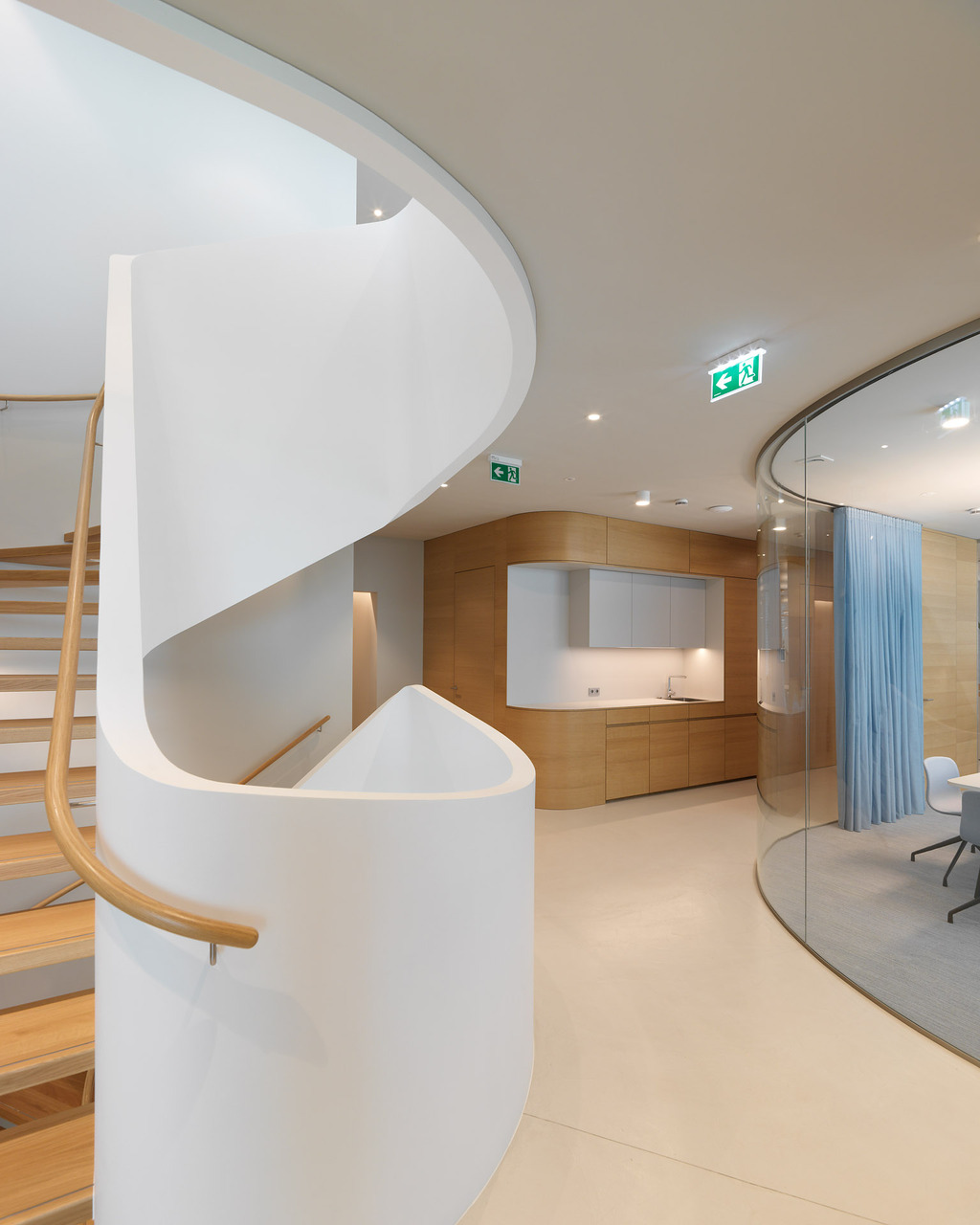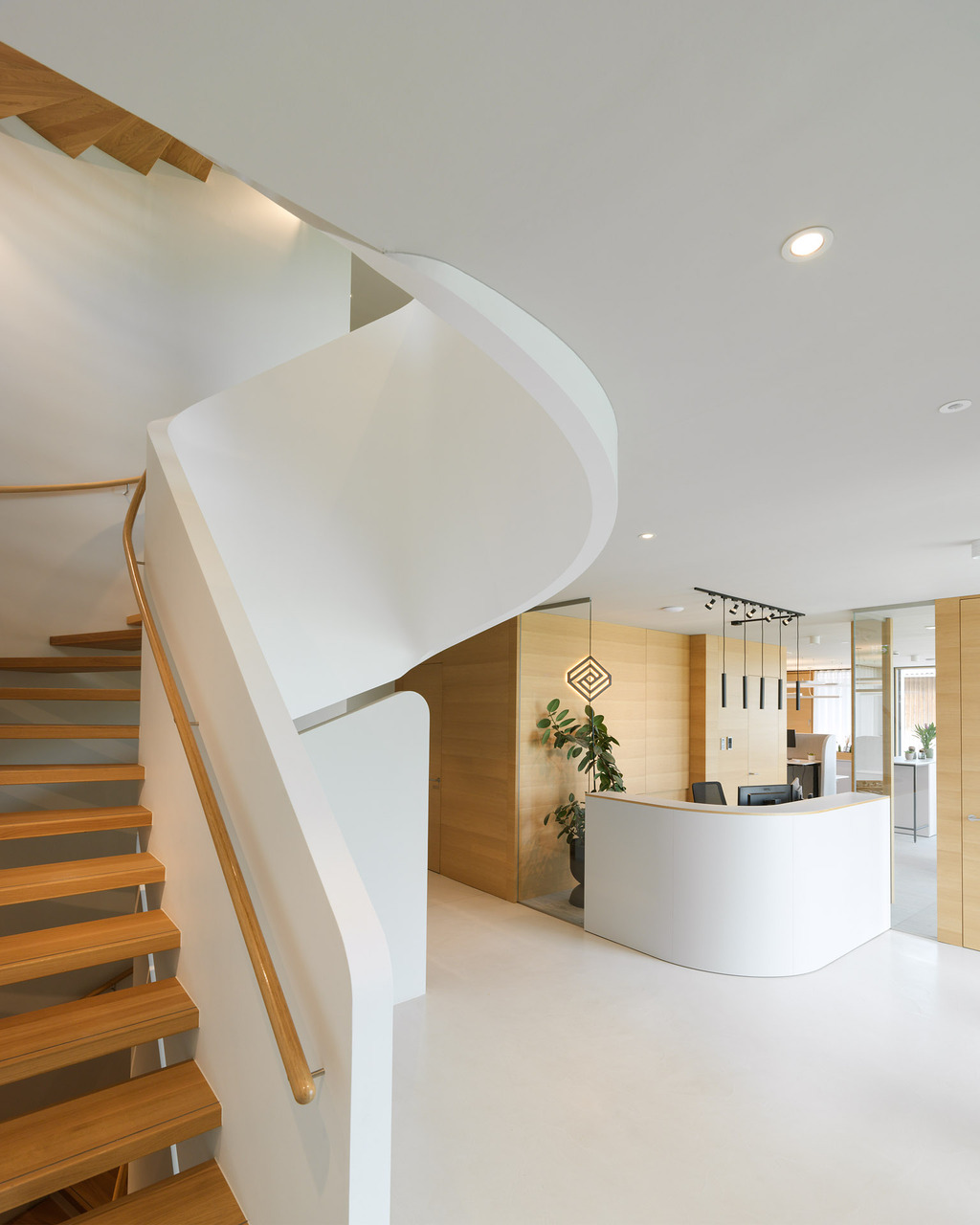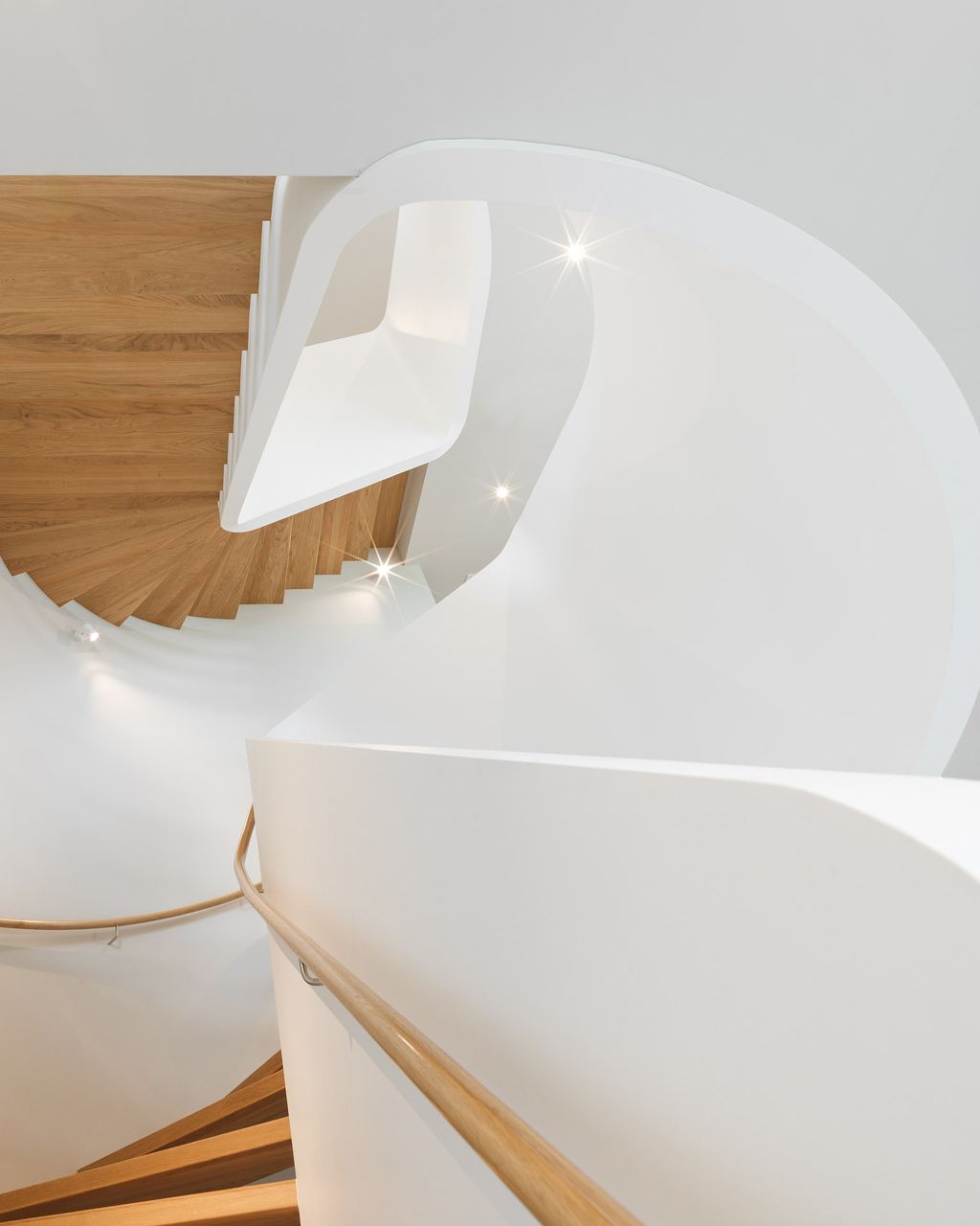 Das Gebäude muss unterschiedlichen Nutzungsansprüchen gerecht werden: Arbeiter:innen aus dem angrenzenden Werksgebäude gehen hier ein und aus, Kund:innen werden empfangen, Besprechungen abgehalten; Arbeitsplätze für die Techniker:innen, Geschäftsführung und Verwaltung sollten zur Verfügung stehen und das zugehörige Bestattungsunternehmen musste räumlich integriert werden. Die Lösung war eine Art vertikaler „Kreisverkehr“ anhand eines offenen, skulpturalen Treppenlaufs, wobei der Vielschichtigkeit der funktionalen Überlagerungen eine reduzierte räumliche Formensprache gegenübersteht.