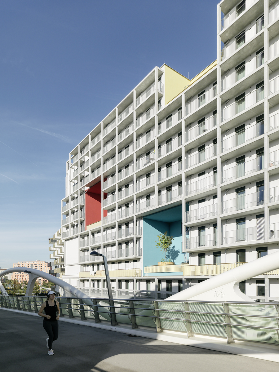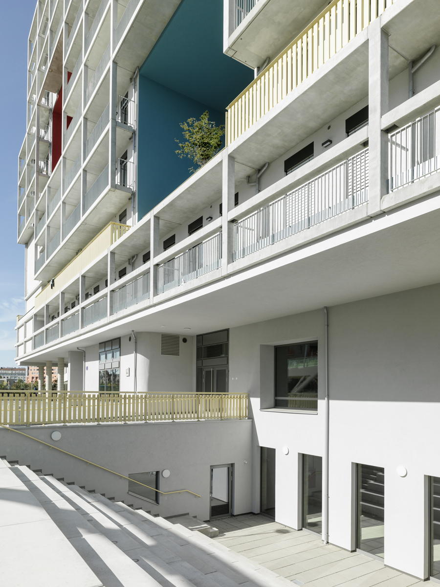 Das Spezifikum des Entwurfs bilden drei an der Gebäude-Längsseite zum öffentlichen Raum hin eingeschnittene, drei Geschoß hohe und ebenso breite „Freiraum-Boxen“. Diese Freiräume sind Aufenthalts-, Aussichts- und Begegnungszonen, zu denen alle Bewohner:innen Zugang haben. Sie erinnern an die Immeuble Villas von 1922, mit denen Le Corbusier die Notwendigkeit dichten städtischen Wohnens mit dem Bedarf nach Frei- und Grünraum zu vereinen suchte.