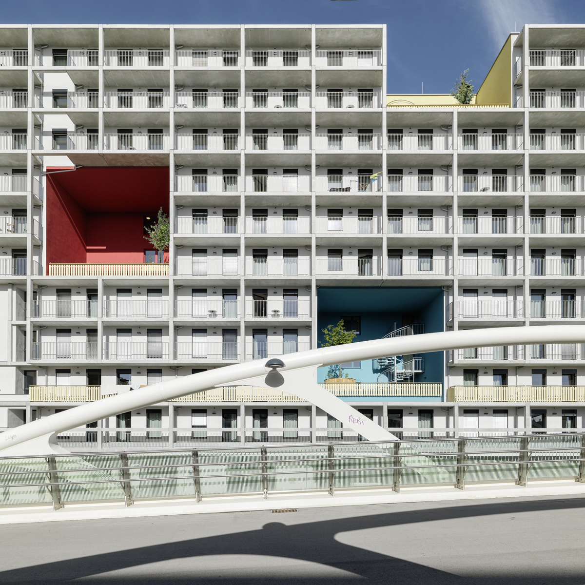 Die in unterschiedlichen Signalfarben gestrichenen „Freiraum-Boxen“ im Sonnwendviertel durchbrechen visuell die Monotonie des Riegels mit seiner Lochfassade. Im Entwurf waren sechs solcher Freiraum-Elemente vorgesehen, in der Umsetzung wurden sie auf drei reduziert.