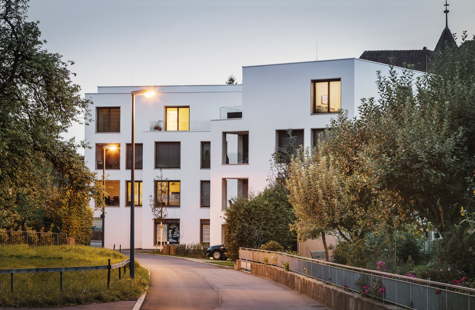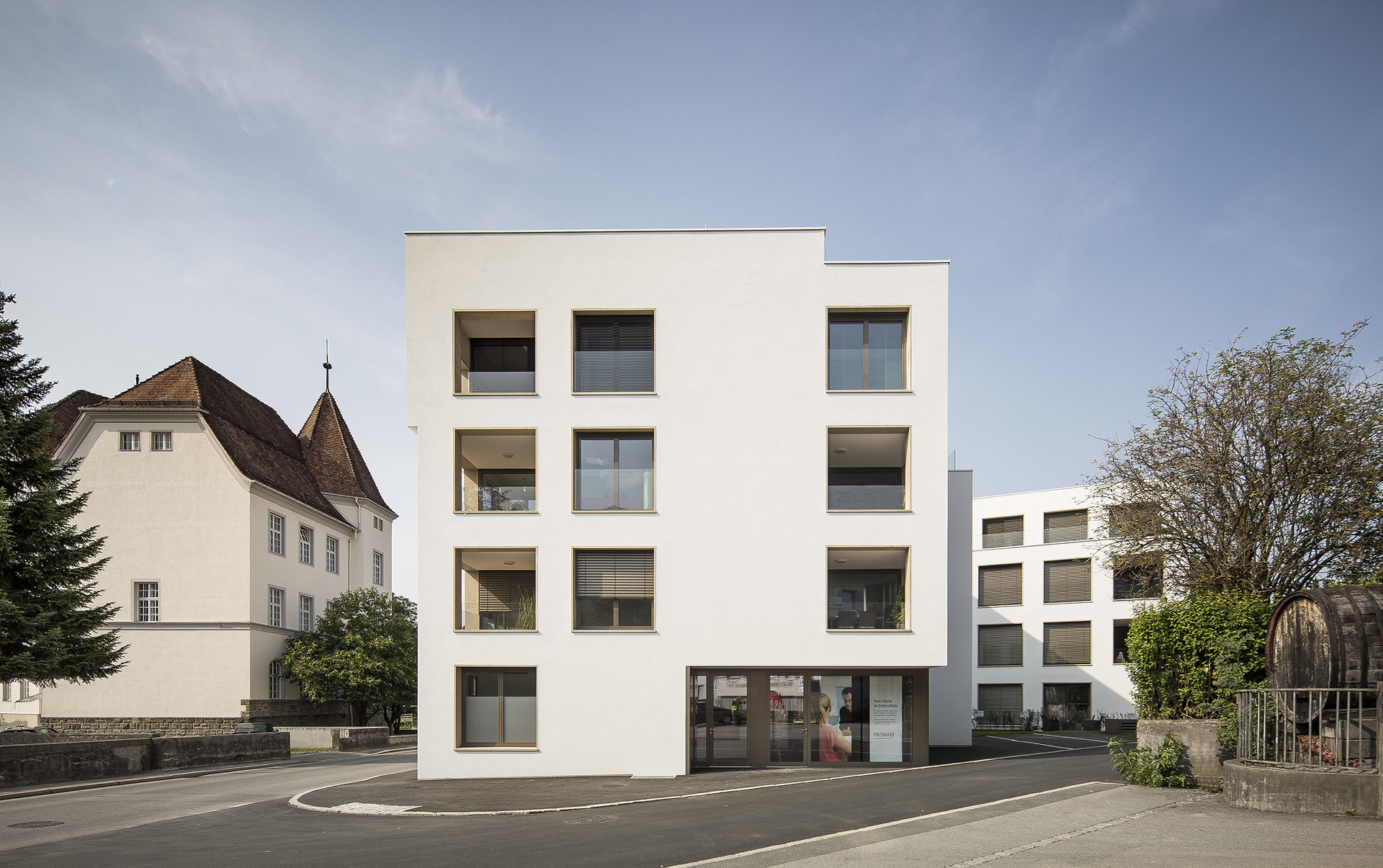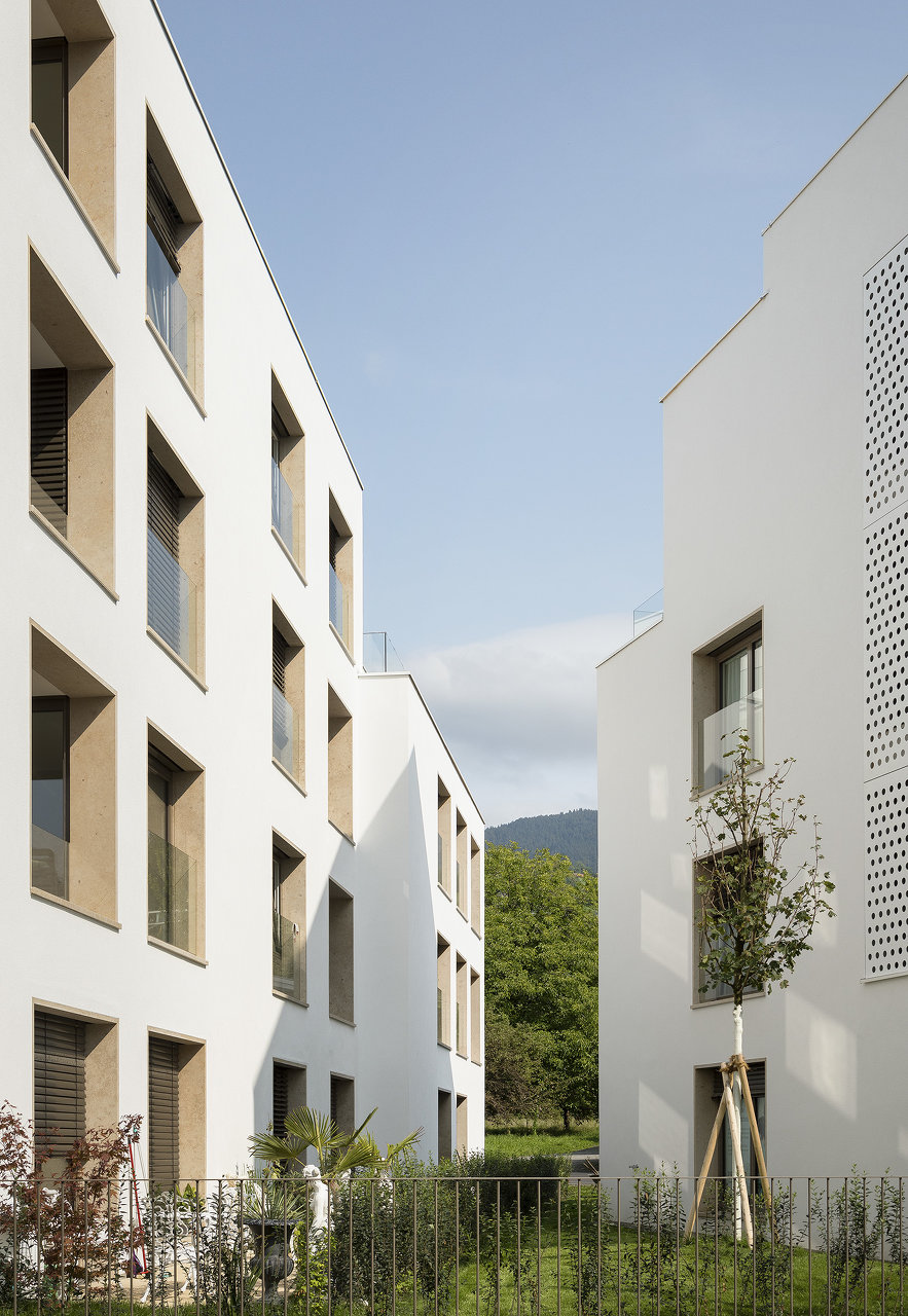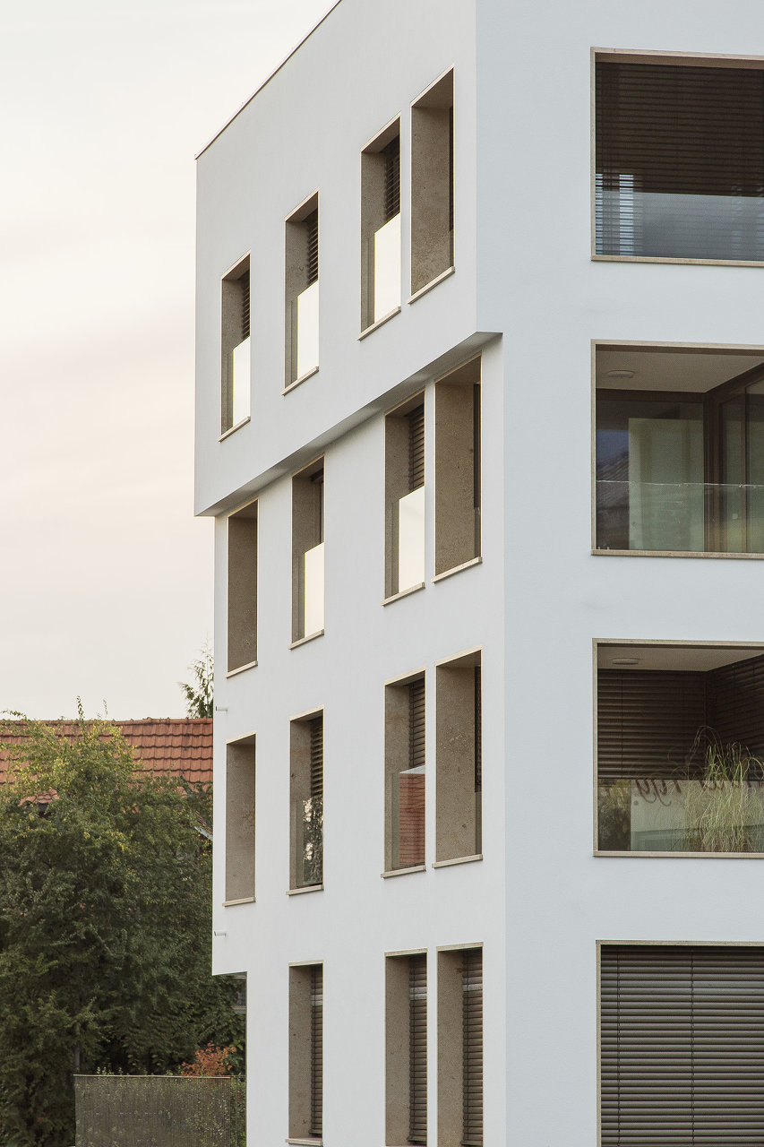 Das Erdgeschoß wird teils gewerblich als Bürofläche genutzt, der Rest ist Wohnraum. Das Projekt fasst insgesamt 22 Einheiten unterschiedlicher Größe und Form. Im Erdgeschoß gibt es kleine Eigengärten, ganz oben große Terrassen; eine Loggia haben alle Wohnungen. Architekten wie Bauherrschaft waren die hohe Qualität und Nachhaltigkeit von Materialisierung wie formaler Gestaltung ein Anliegen. Der verputzte, weiß gestrichene Ziegel-Massivbau erhielt in den Öffnunen helle Laibungen aus Jura-Kalkstein und Holz-Alu-Fenster in fast durchwegs einheitlichem Quadrat-Zuschnitt. (Text: Tobias Hagleitner)