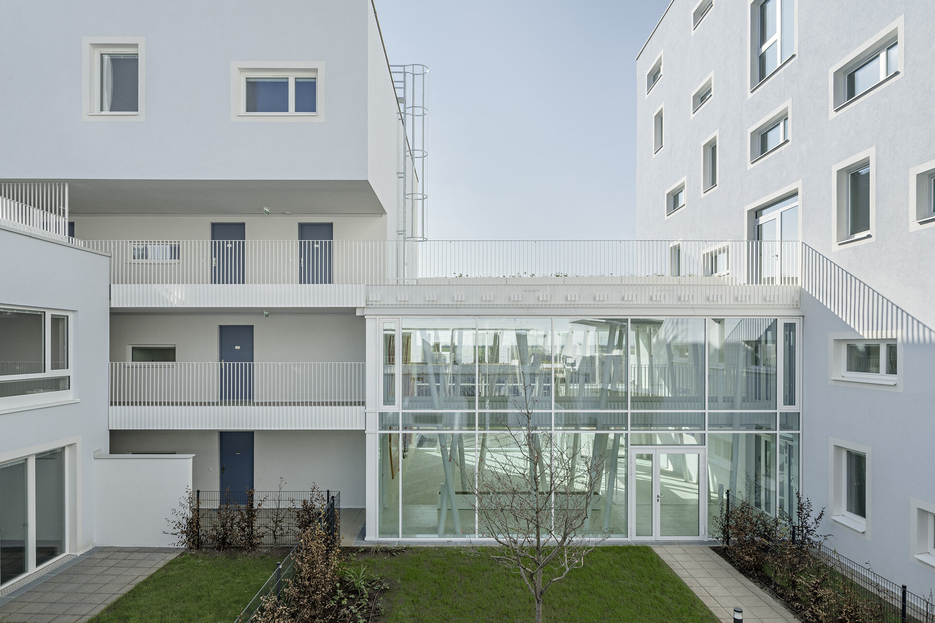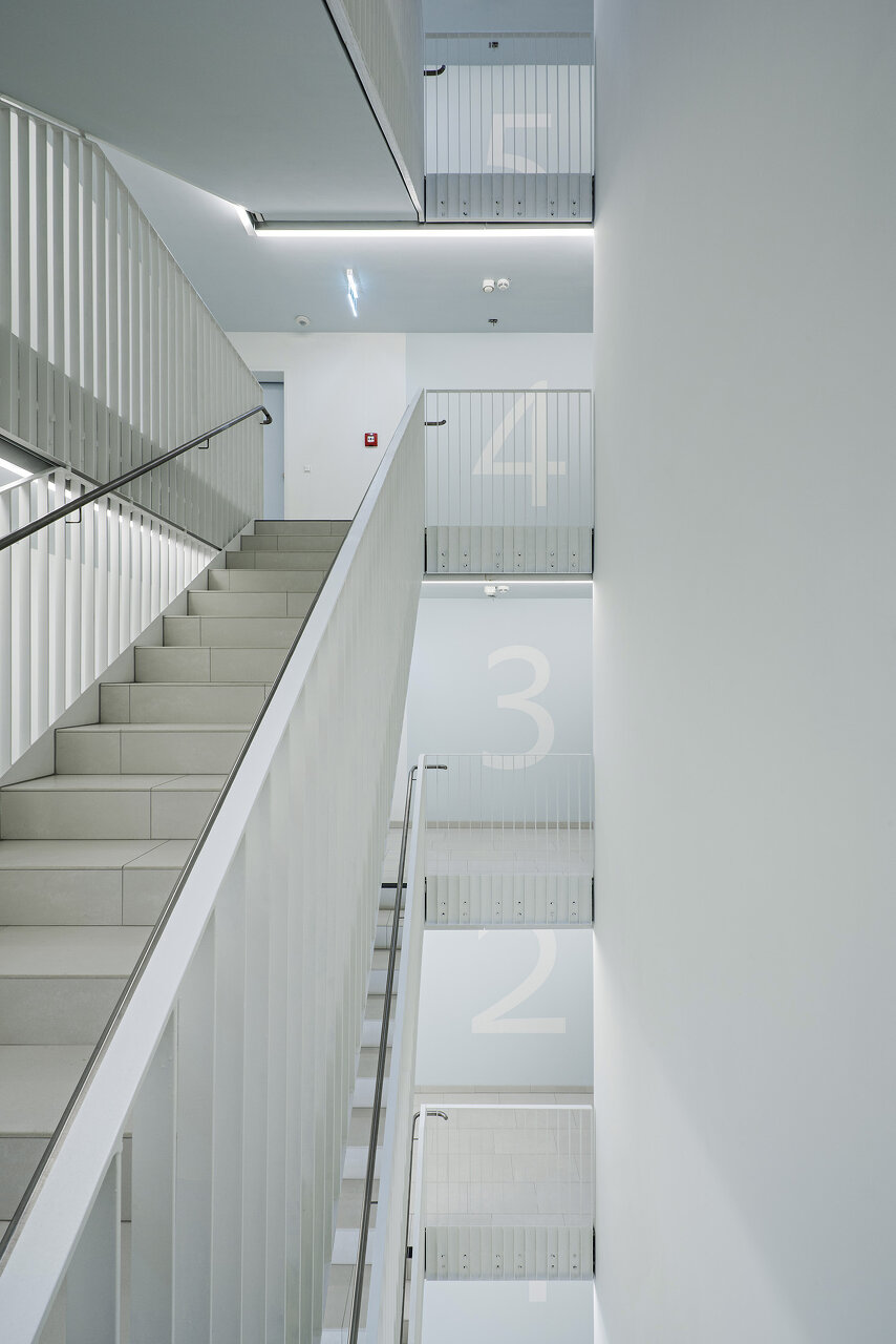 Die in einem dialogischen Verfahren ermittelte städtebauliche Vorgabe bestand darin, drei unterschiedlich hohe Baukörper auf einem Sockel zu platzieren. Der Entwurf aus dem Büro NMPB, verantwortet vom „B“ dieses Akronyms, Sascha Bradic, deutet diese Vorgabe um. Er stellt einen massiven Block auf seinen Bauplatz und nimmt dann wie ein Bildhauer Masse weg. Durch dieses umgekehrte Verfahren – Subtraktion statt Addition – entstehen drei unterschiedliche, schön proportionierte Innenhöfe und Terrassen, die gemeinsam das Herz der Anlage bilden. Die Wohnungen sind kompakt und gut nutzbar, verfügen über Balkon oder Loggia und bieten eine Vielfalt von Typen, fünf Maisonetten eingeschlossen. Das Haus hat eine repräsentative Eingangshalle mit tanzenden Säulen, die nicht nur den Kindern gefallen. Die Zugänge zu den Wohnungen sind großzügig, Lufträume verbinden die Geschoße und bringen Licht von oben. (Unter dem aktuellen Regime des Brandschutzes in Wien braucht es dafür einen besonderen Kampfgeist; an der Vorgabe, die Lufträume im Brandfall alle zwei Geschoße horizontal abzuschotten, hätten die meisten Planer resigniert.)